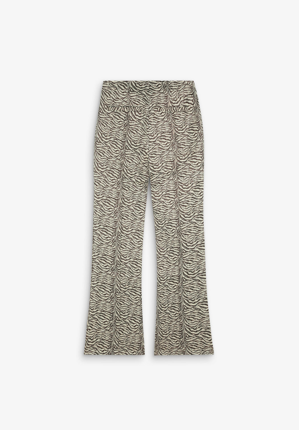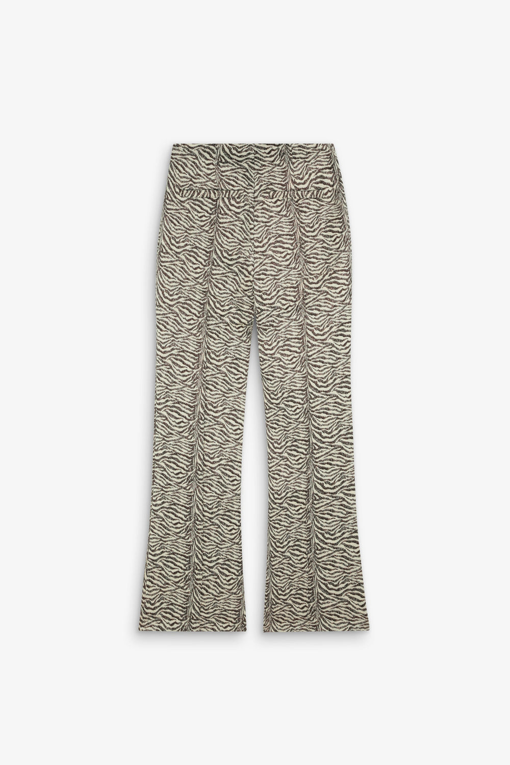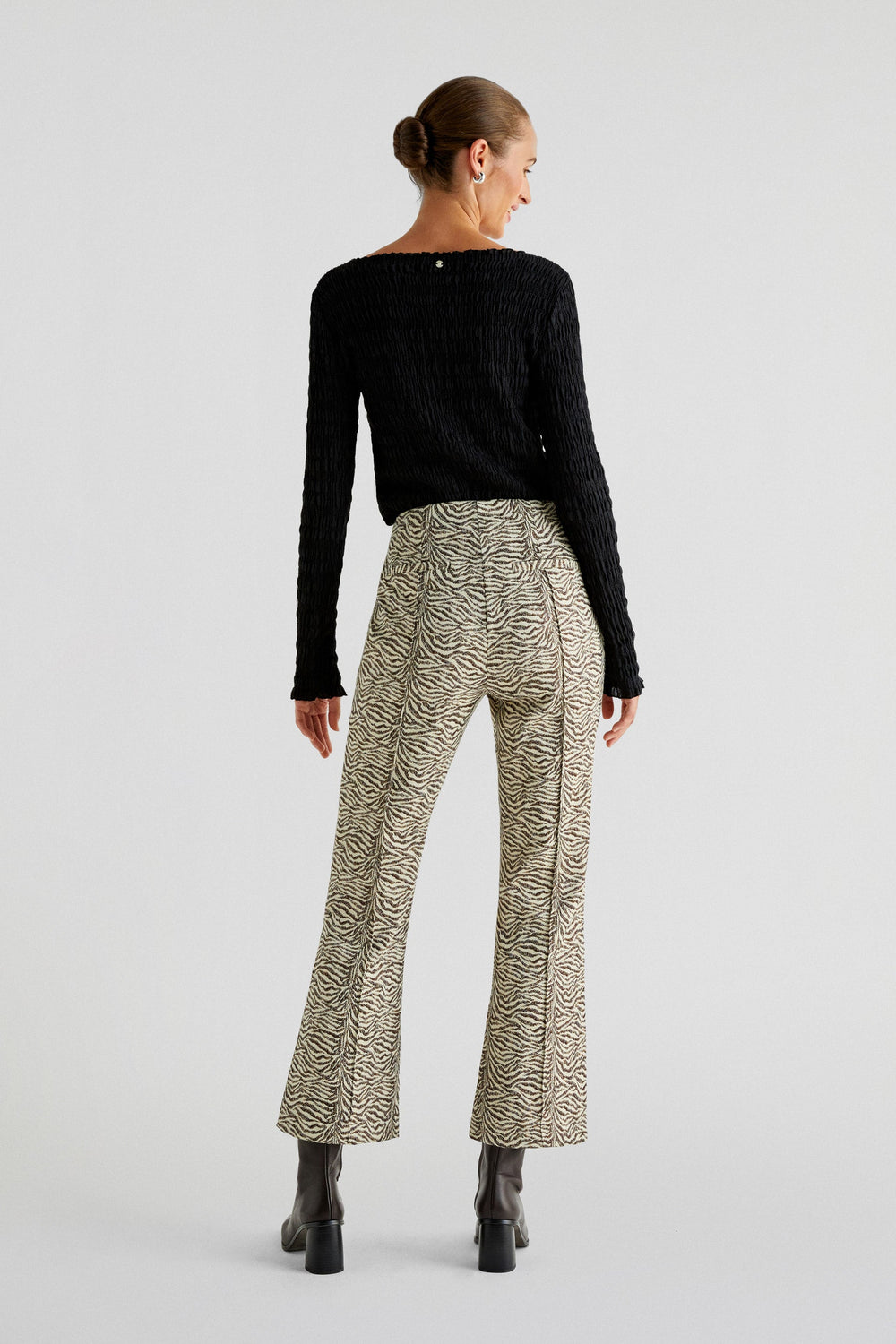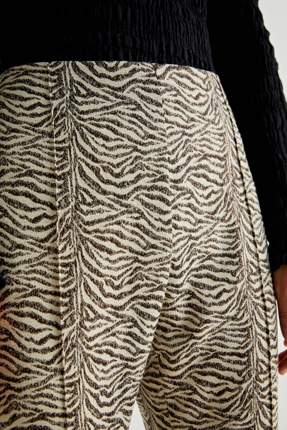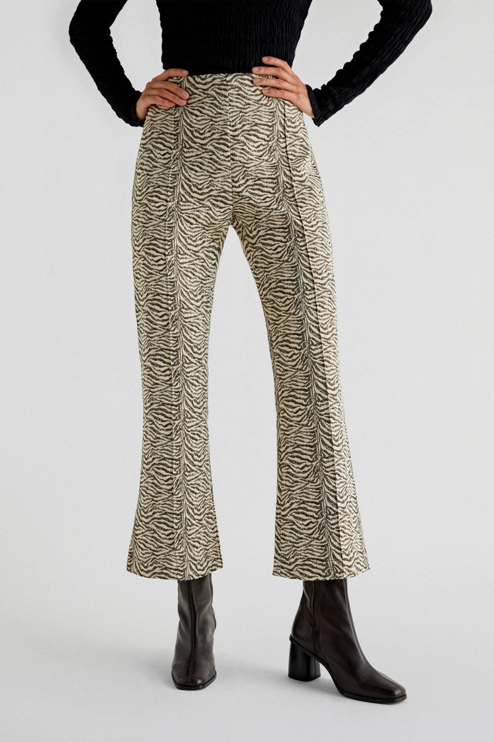 Calças com estampado animal confecionadas em tecido de algodão ligeiramente elástico. Corte boca de sino e com fecho de zip. Pormenor de costuras marcadas.