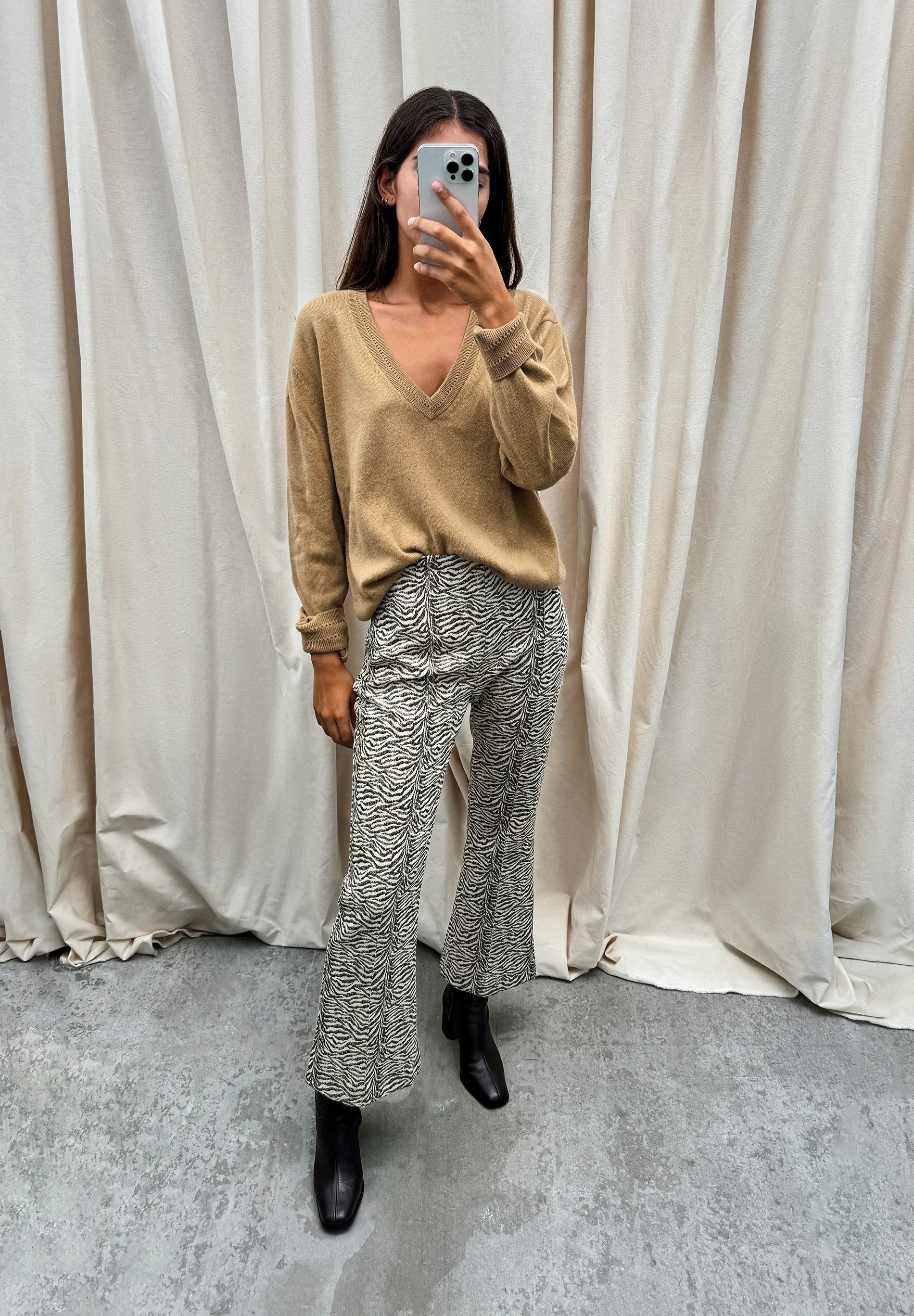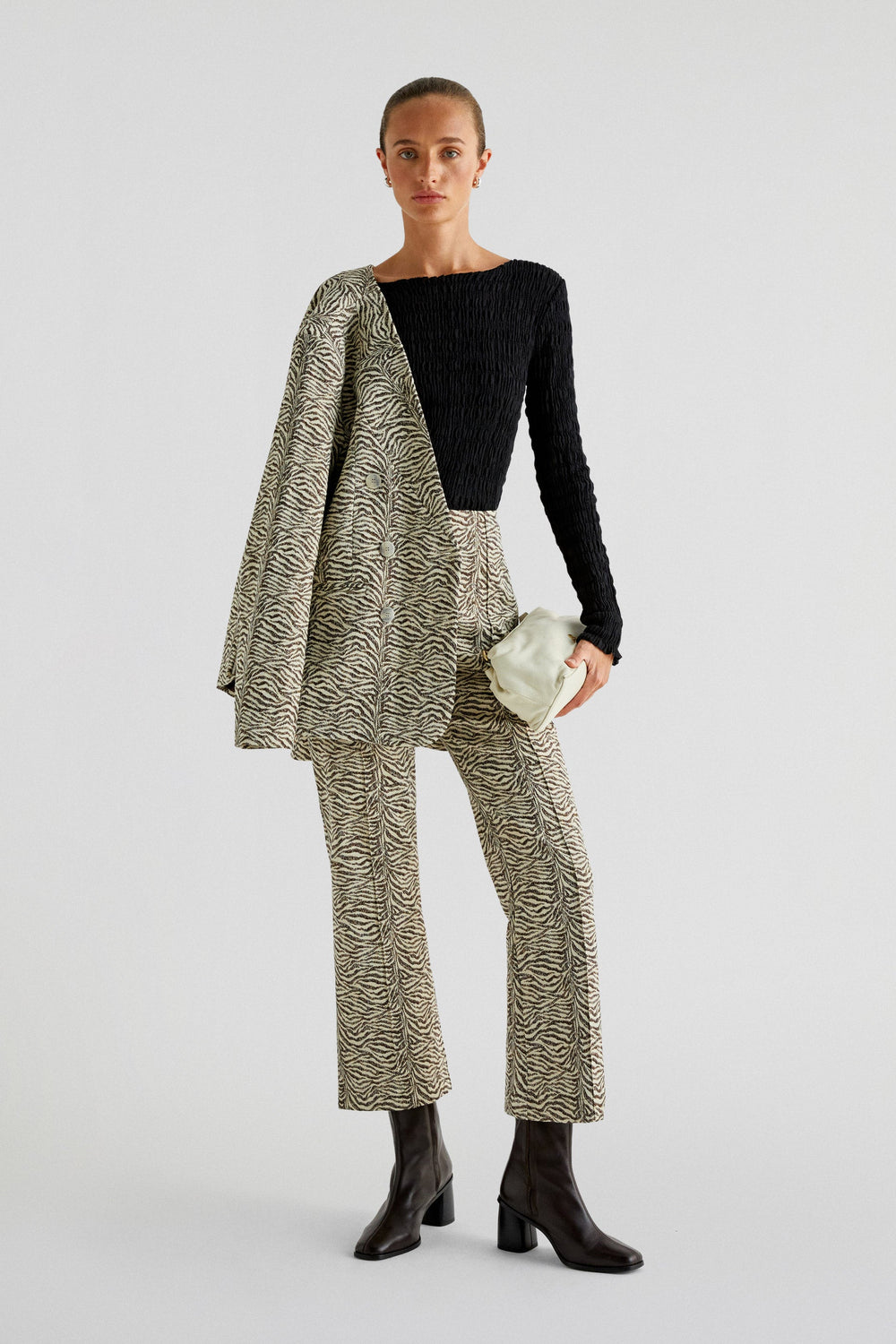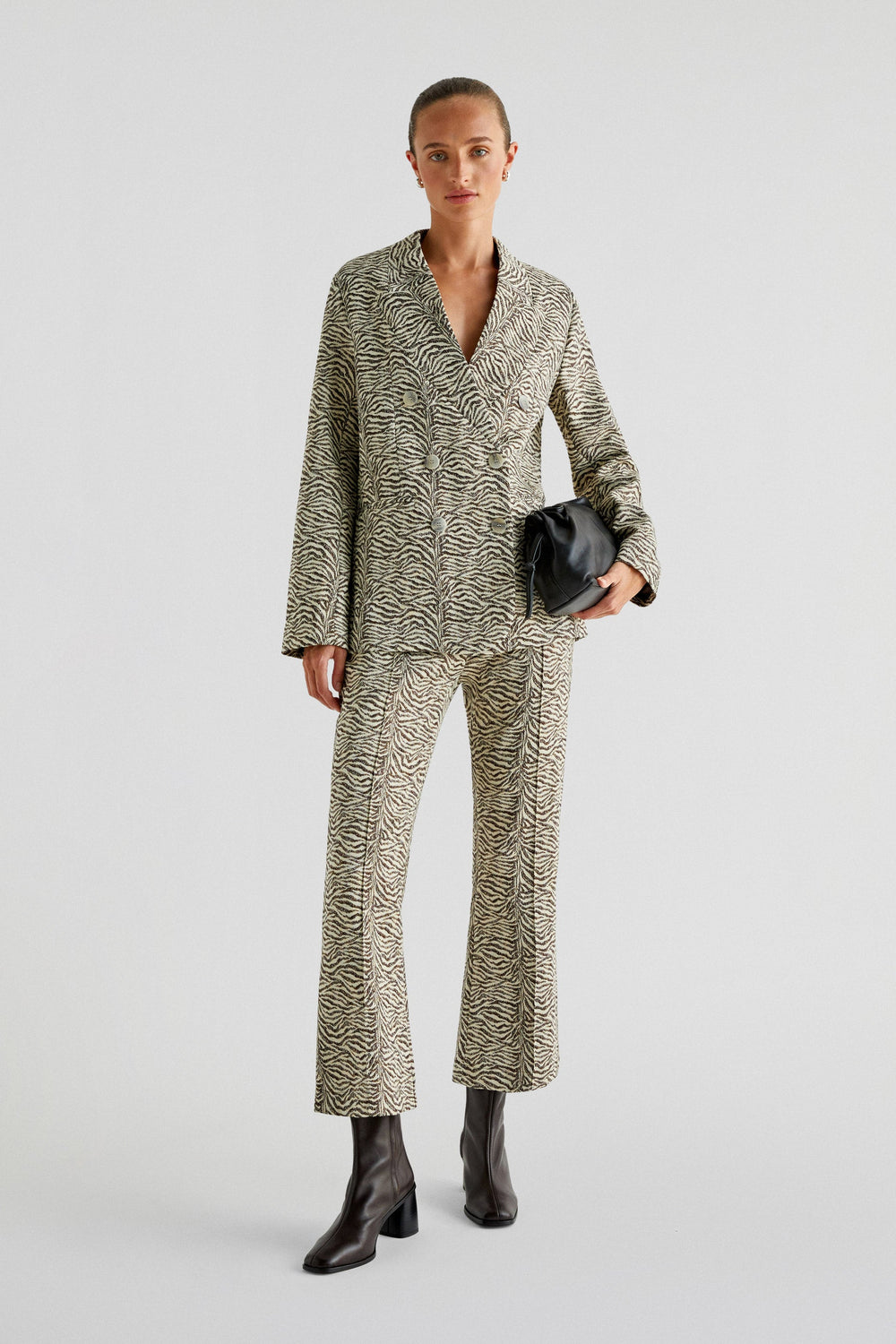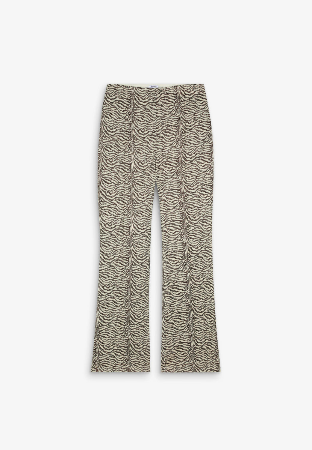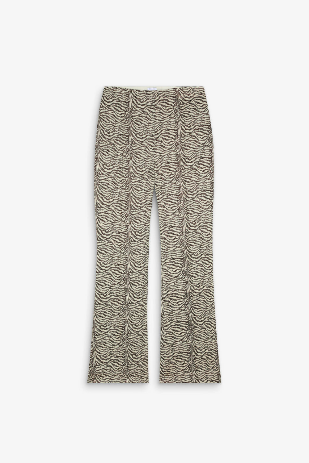 Calças com estampado animal confecionadas em tecido de algodão ligeiramente elástico. Corte boca de sino e com fecho de zip. Pormenor de costuras marcadas.