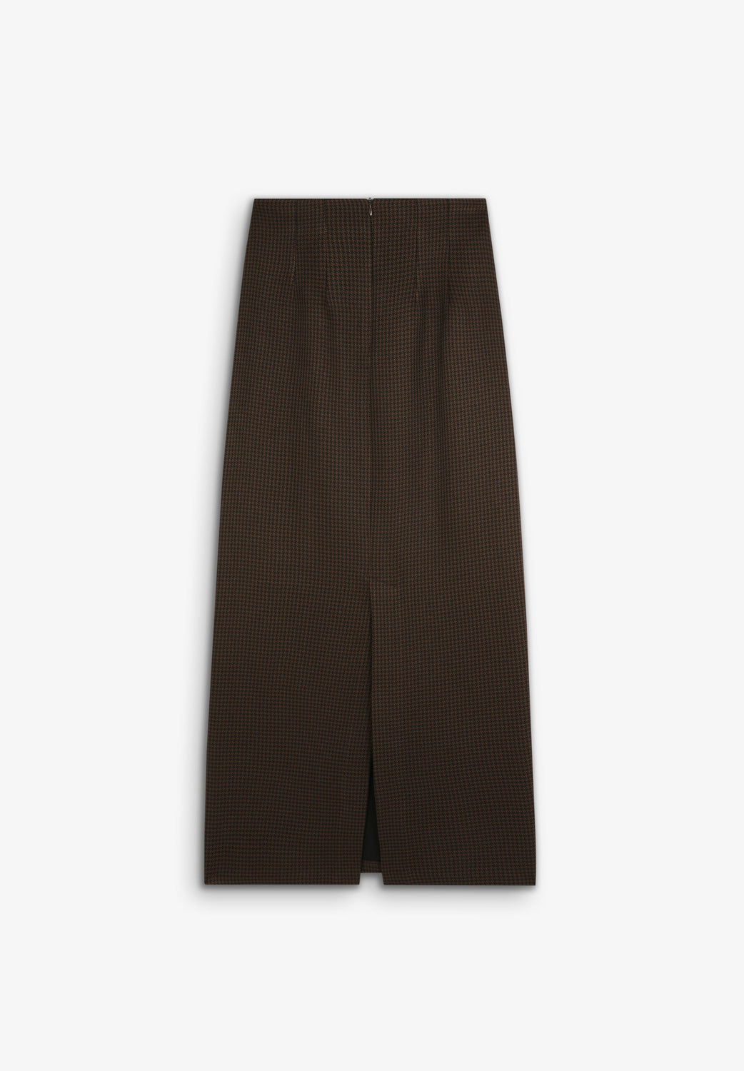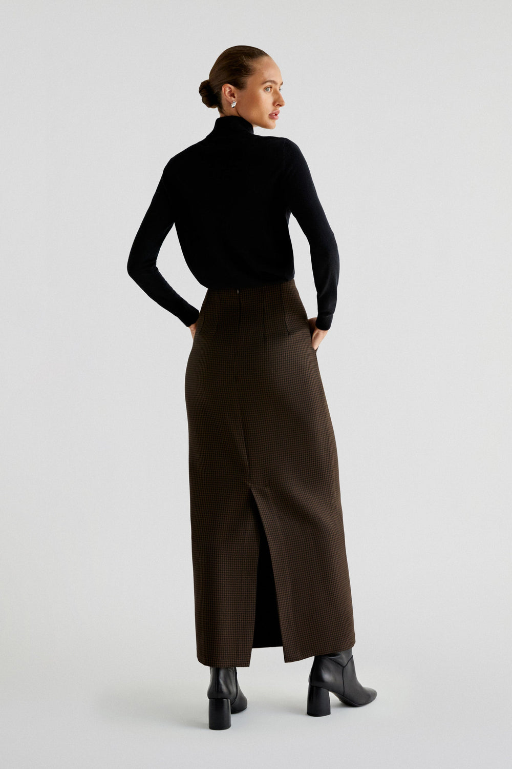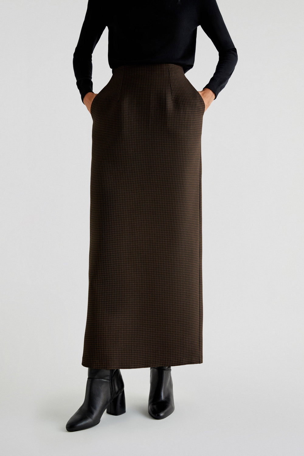 Saia direita confecionada em tecido pata de galo. Slim fit com pinças à frente, fecho de correr atrás e bolsos laterais. Abertura atrás na bainha.