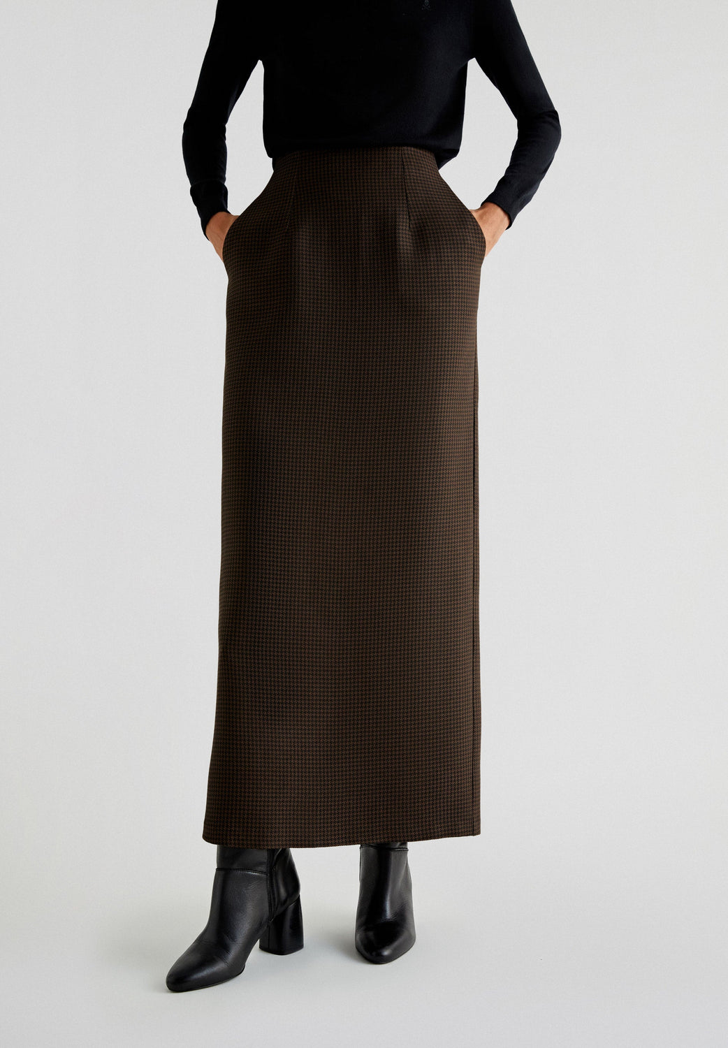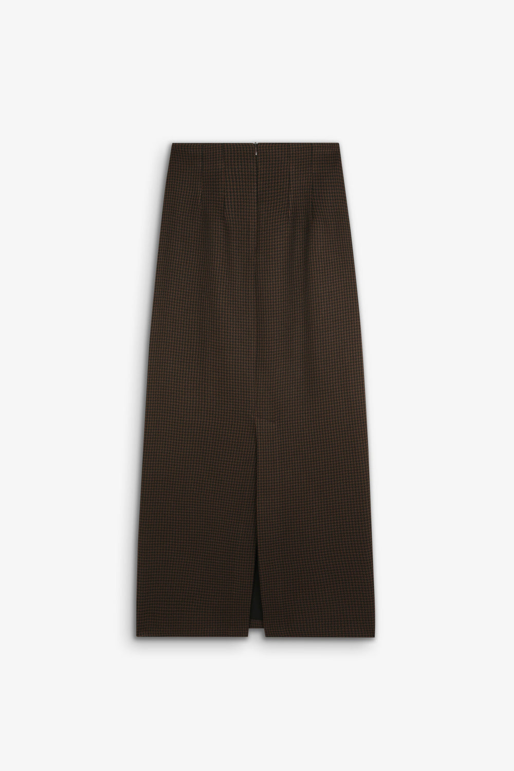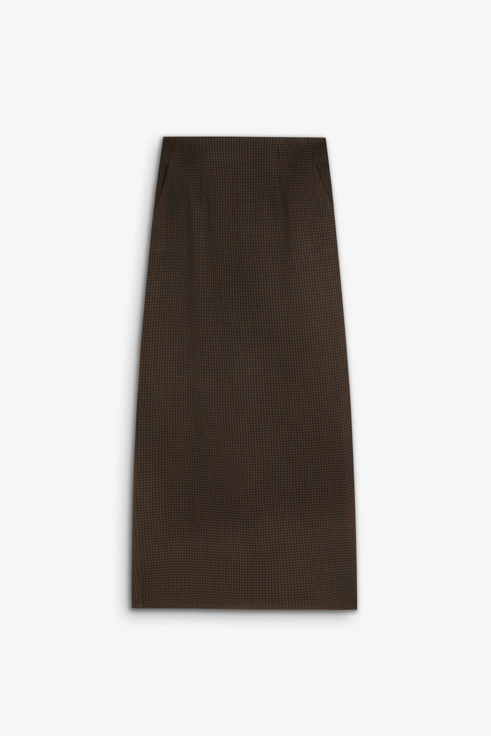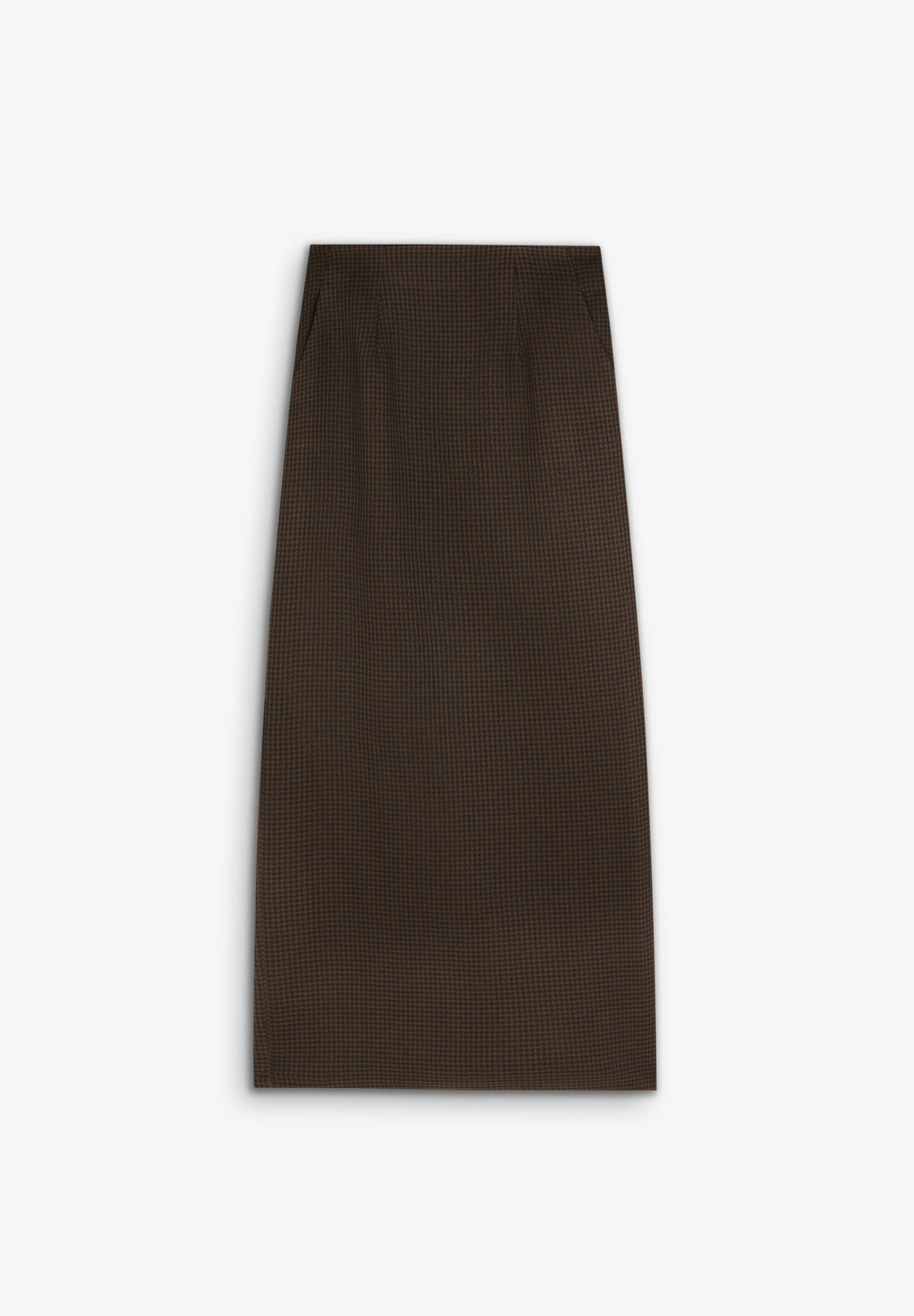 Saia direita confecionada em tecido pata de galo. Slim fit com pinças à frente, fecho de correr atrás e bolsos laterais. Abertura atrás na bainha.