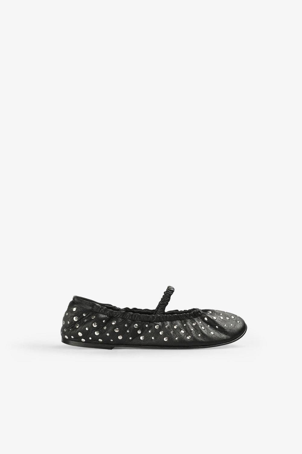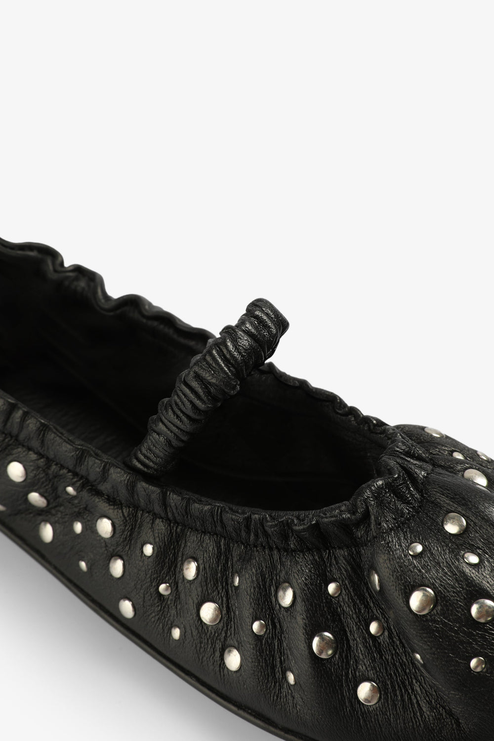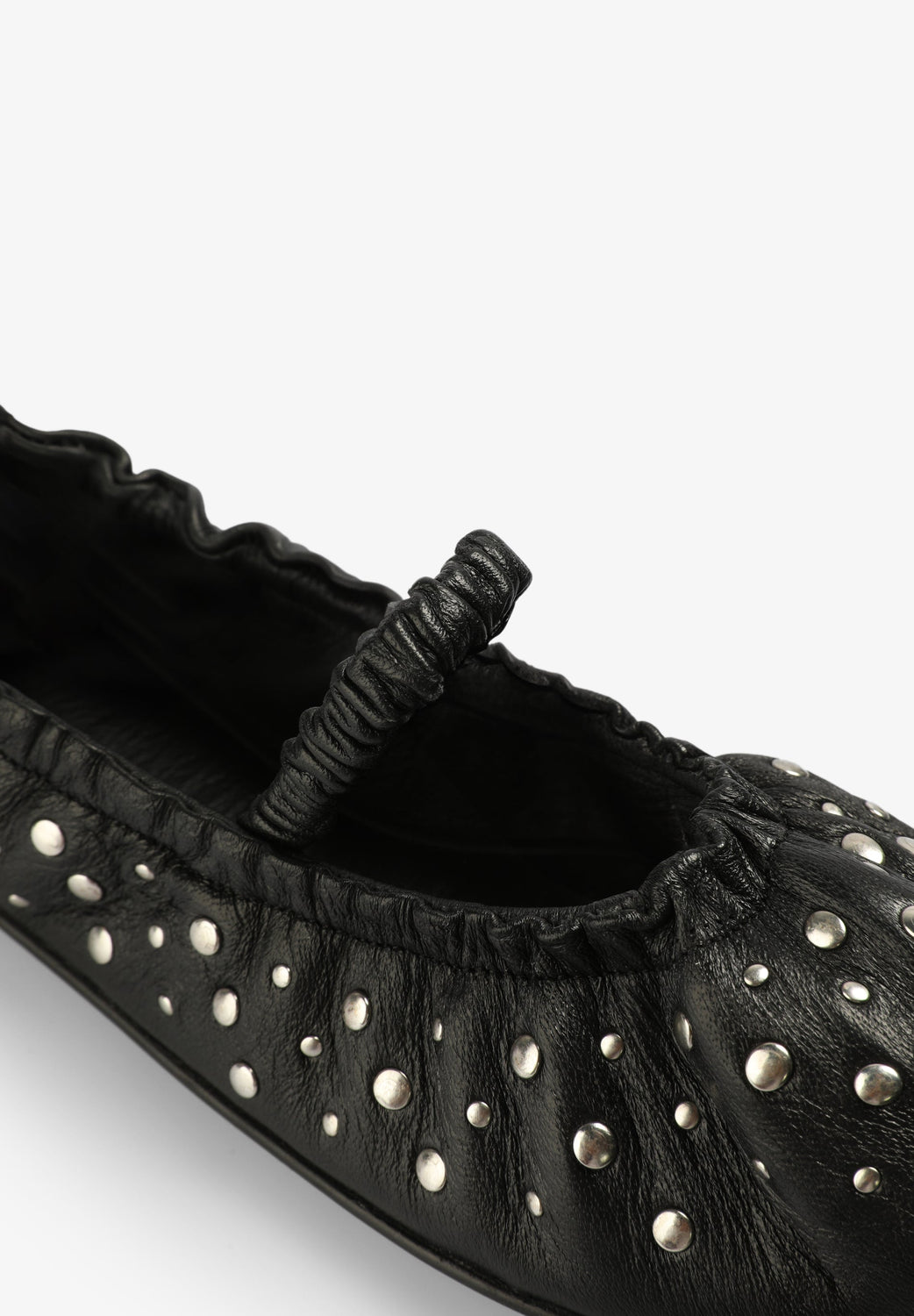 Sabrinas franzidas confecionadas em 100% pele. Sola de borracha, tira e pormenor de tachas all over.