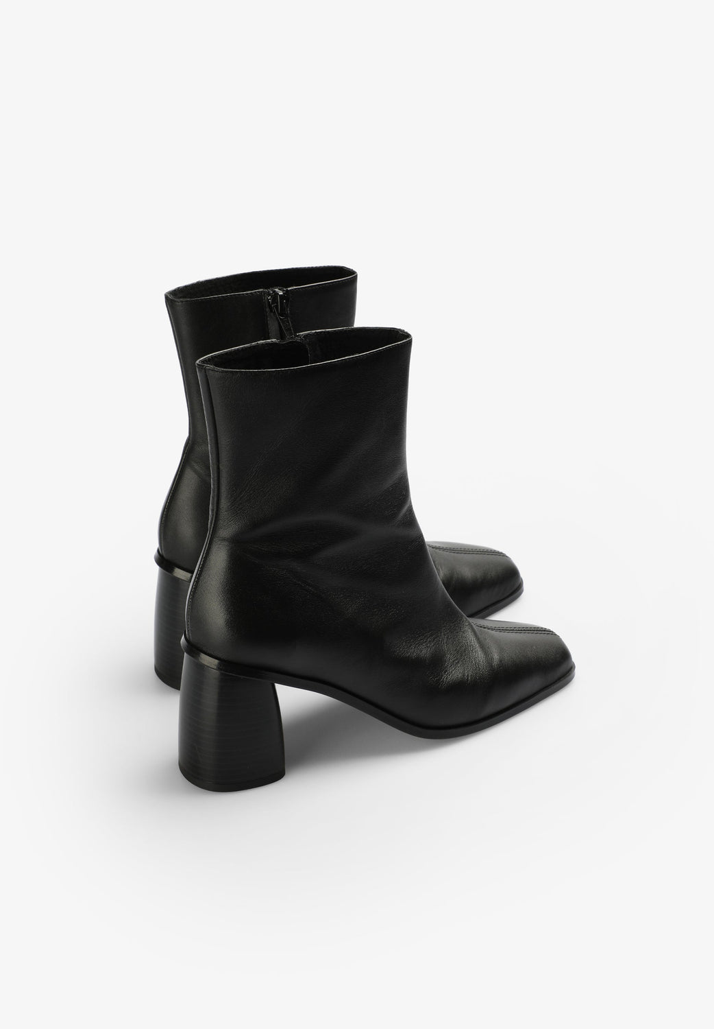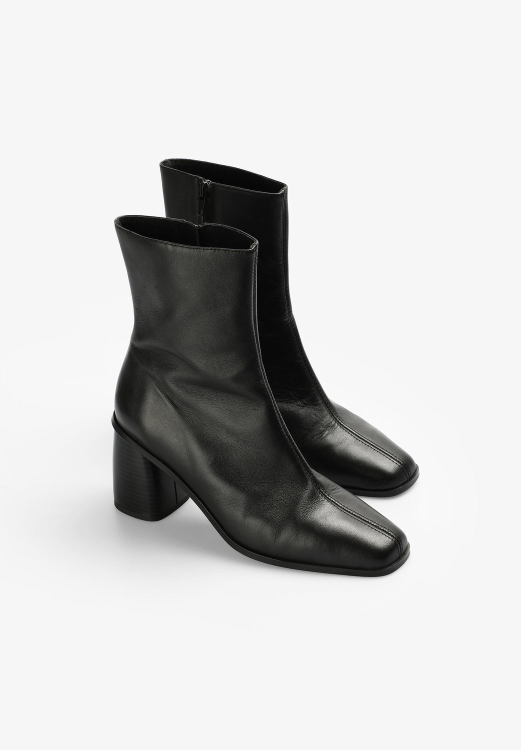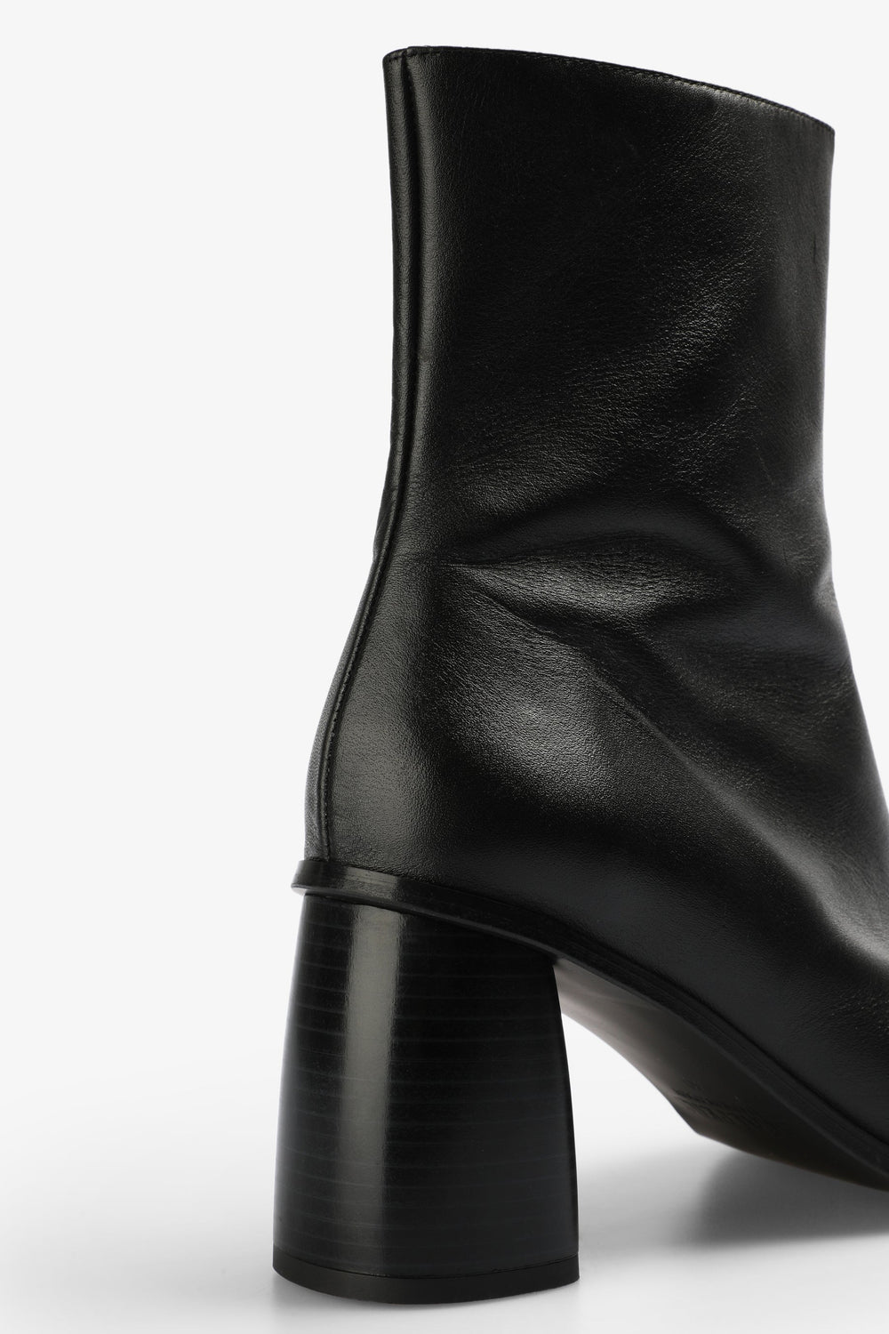 Botim confecionado em 100% pele soft. Cano midi estreito e fecho com zip lateral. Tacão: 7,5 cm.