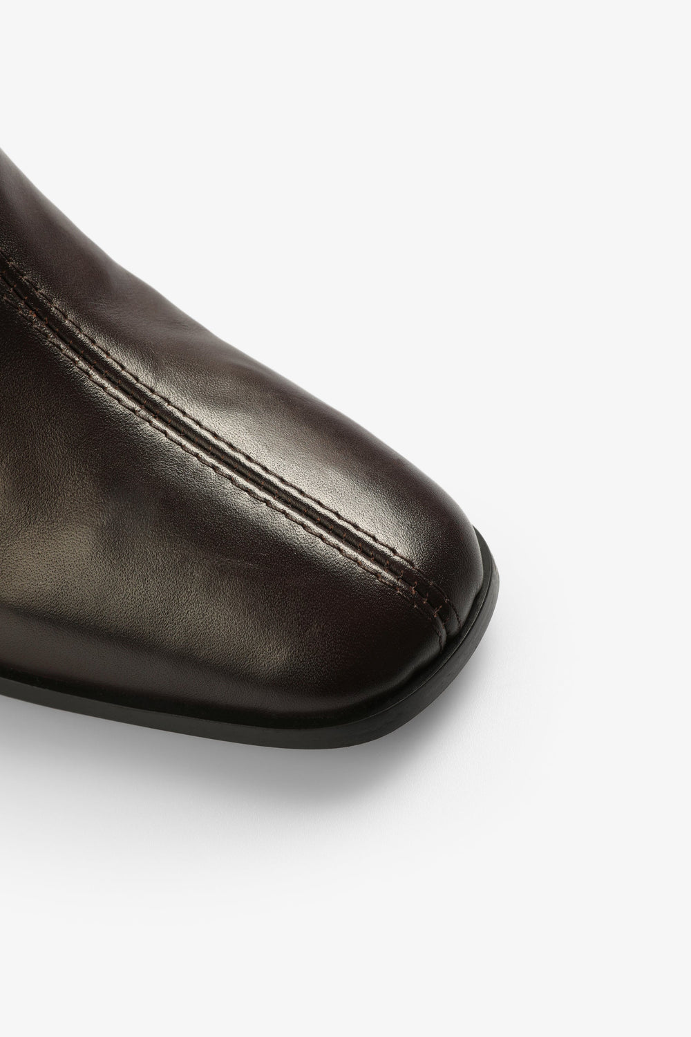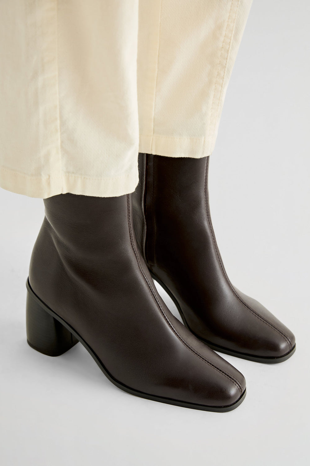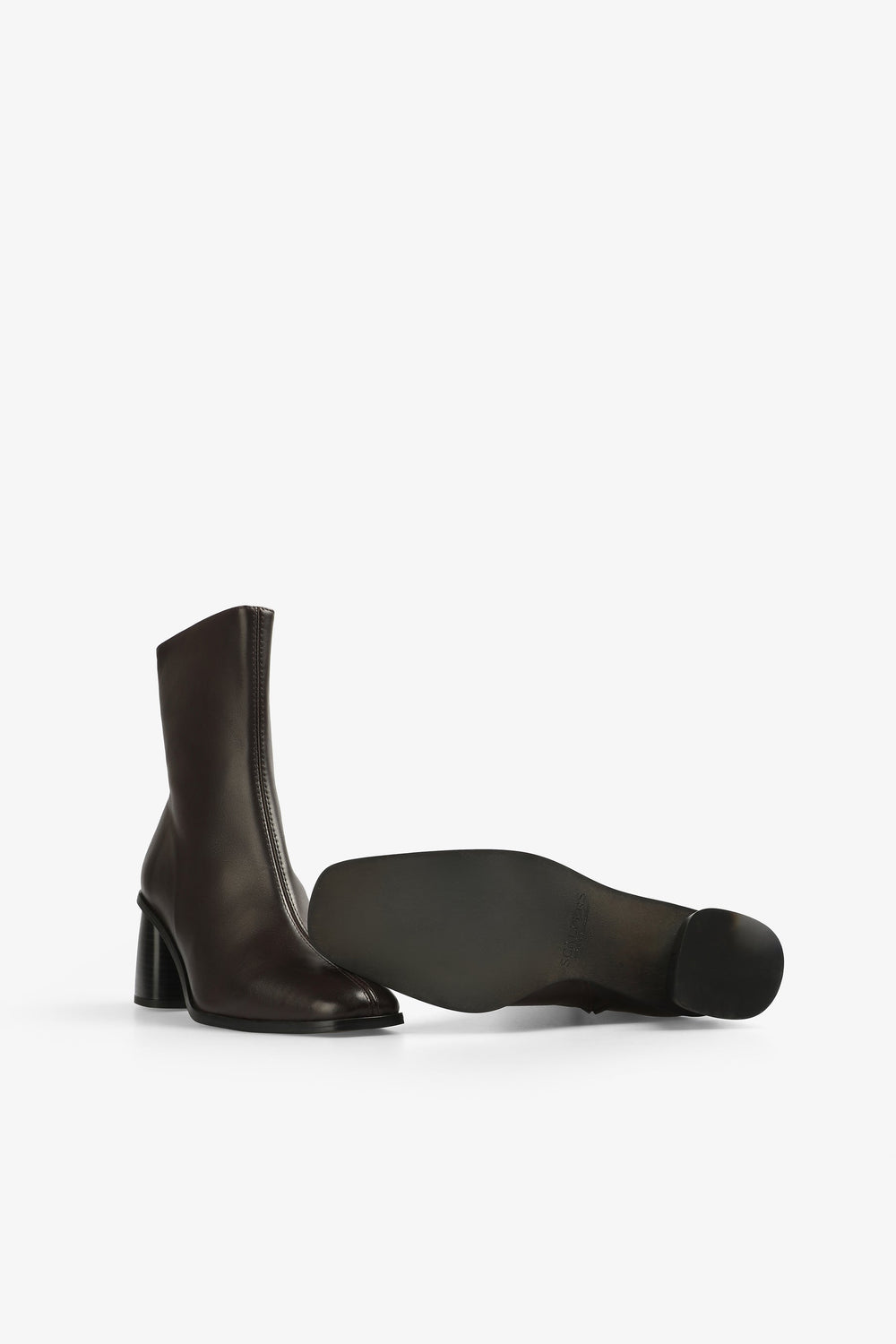 Botim confecionado em 100% pele soft. Cano midi estreito e fecho com zip lateral. Tacão médio.