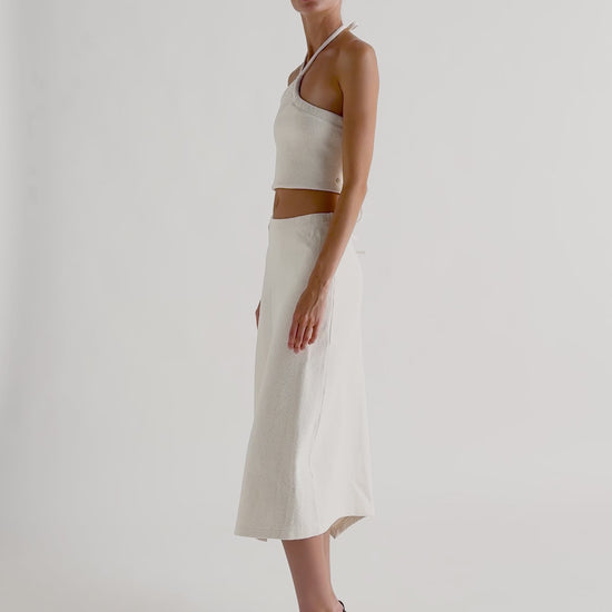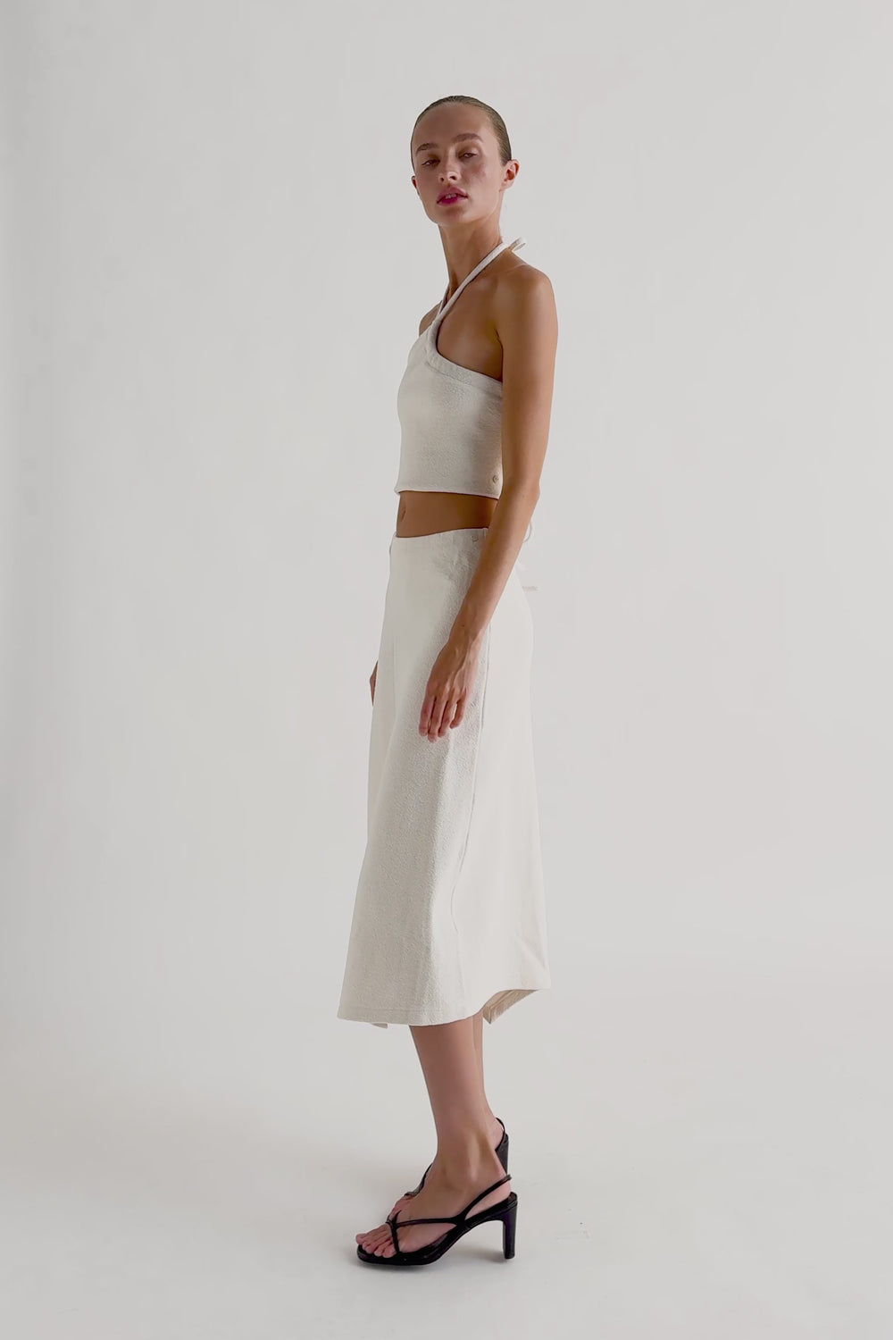 Top cropped confecionado em malha grossa 100% algodão. Slim fit, decote halter com cordões e fecho de tiras atrás.