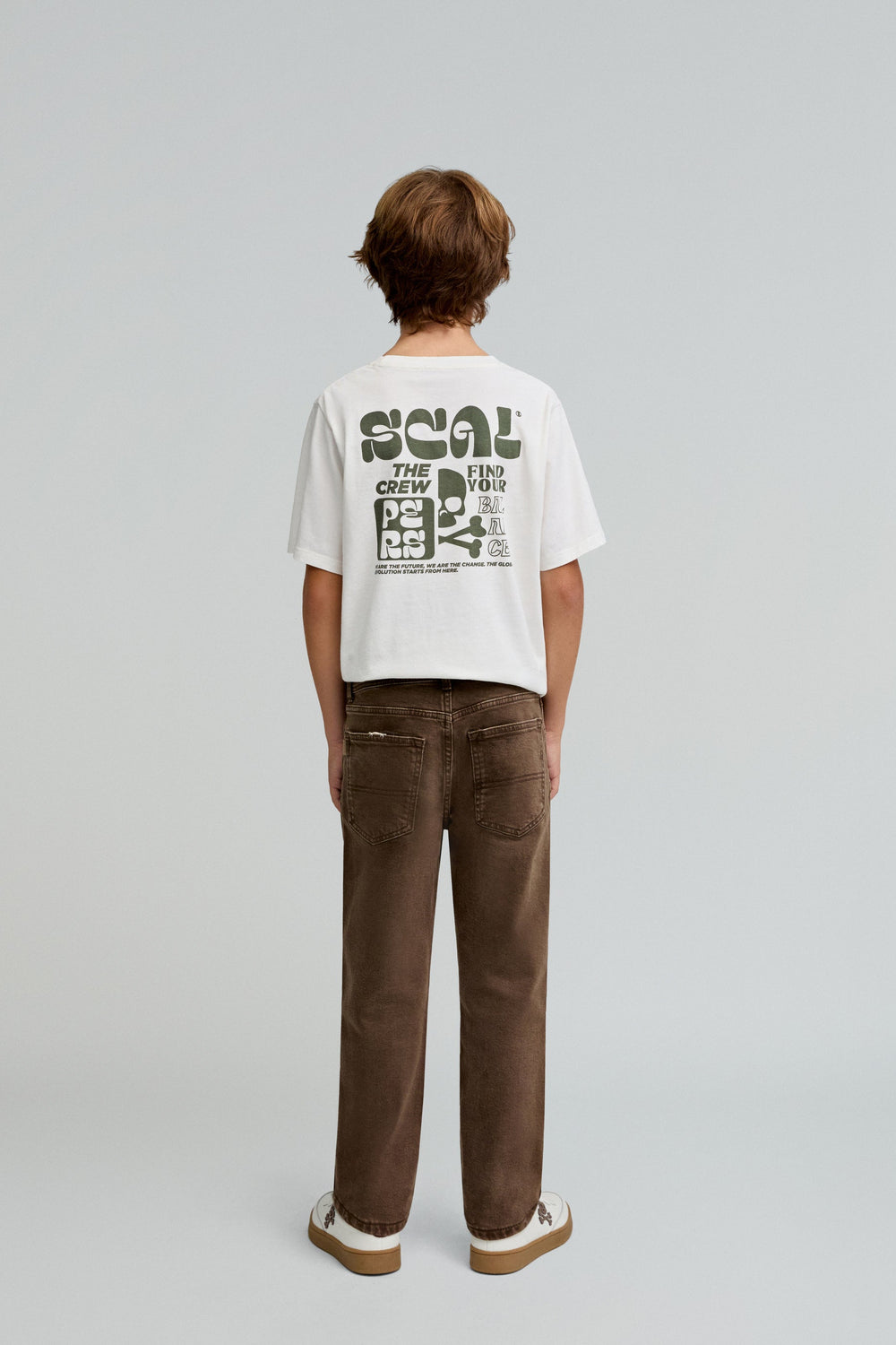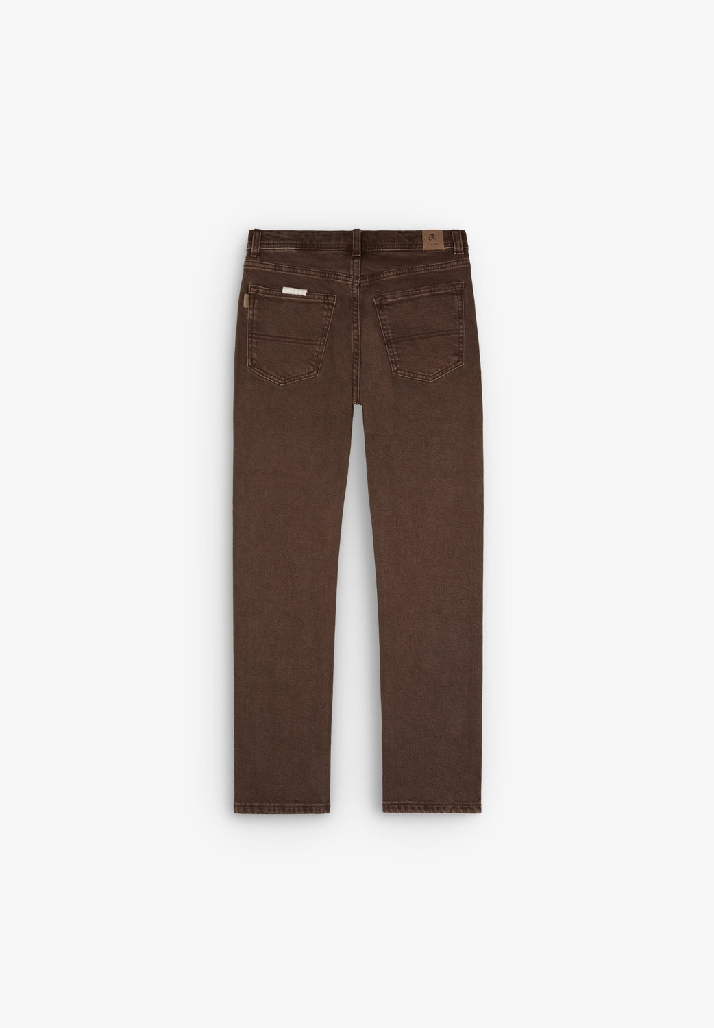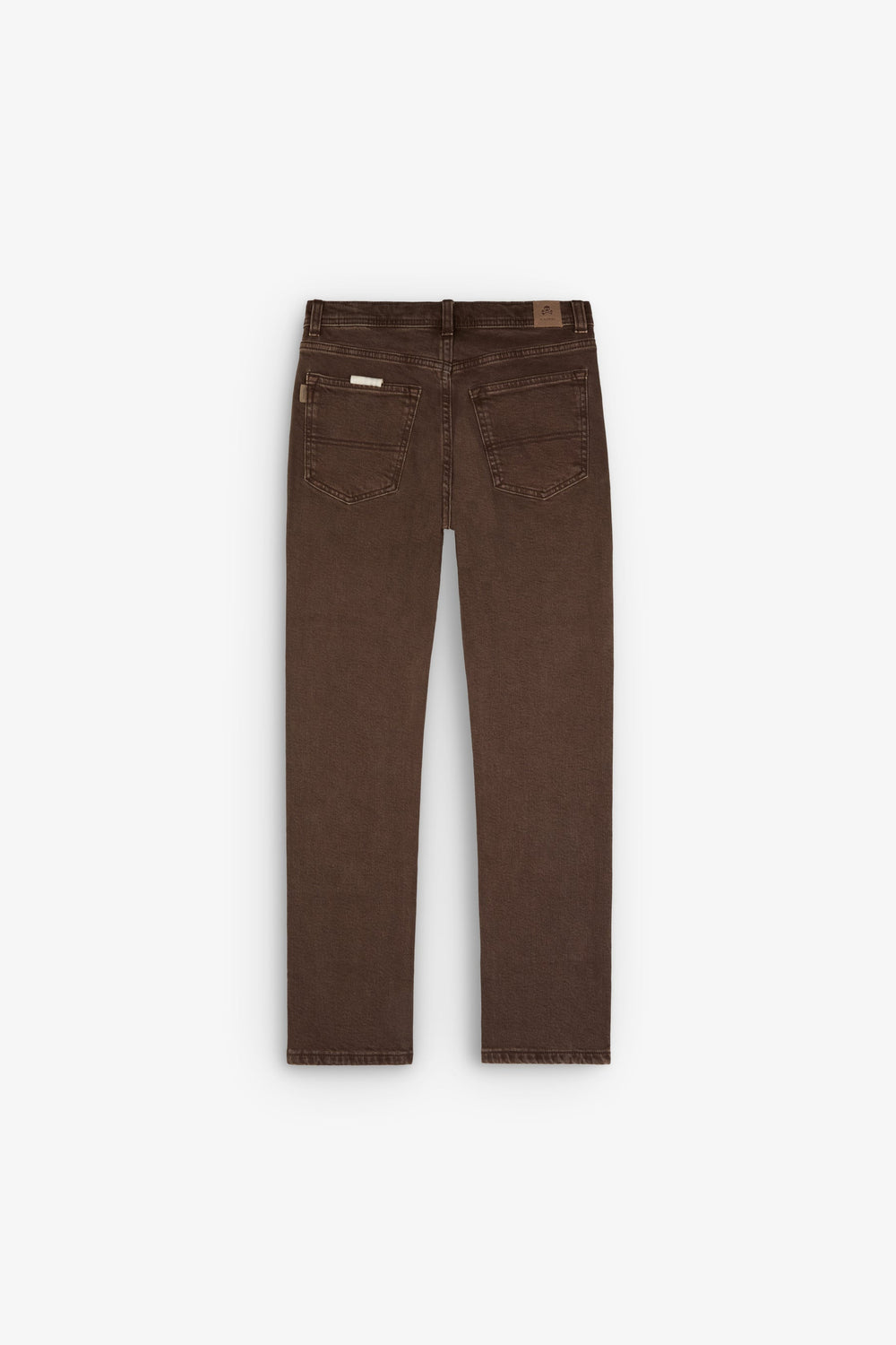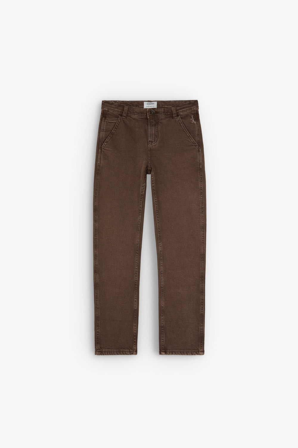Calças corte direito, desbotadas, confecionadas em algodão ligeiramente elástico. Corte direito, fecho com botão e zip, bolsos frontais e traseiros.