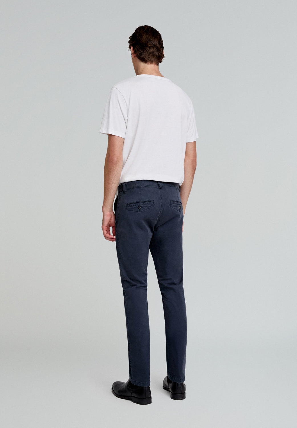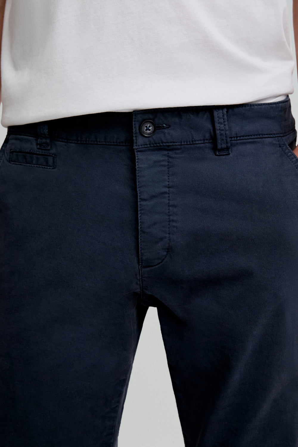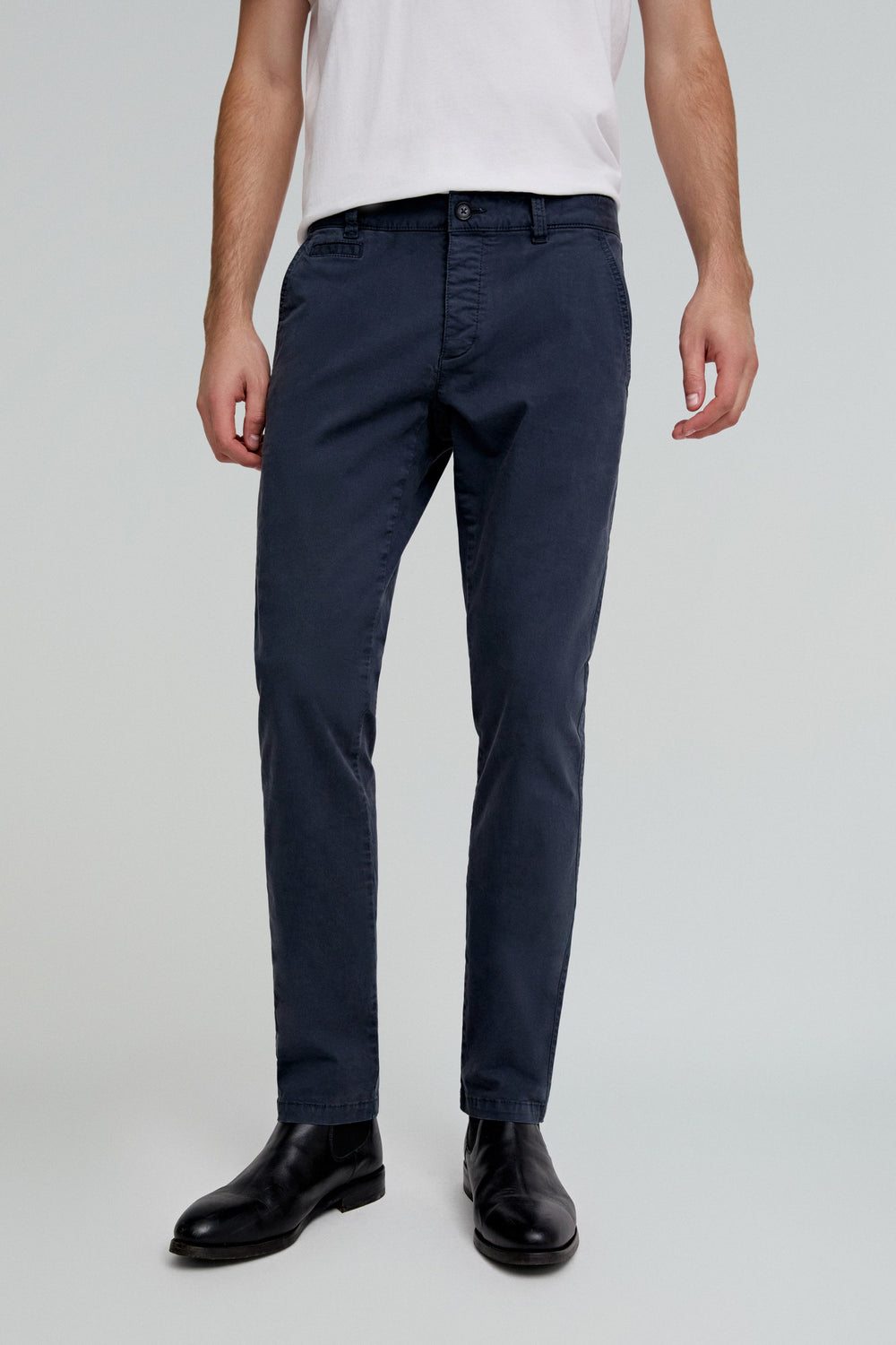 Pantalón chino casual confeccionado en mezcla de algodón ligeramente elástico. Cierre con botón y cremallera y bolsillos laterales y traseros. Trabillas en cintura.