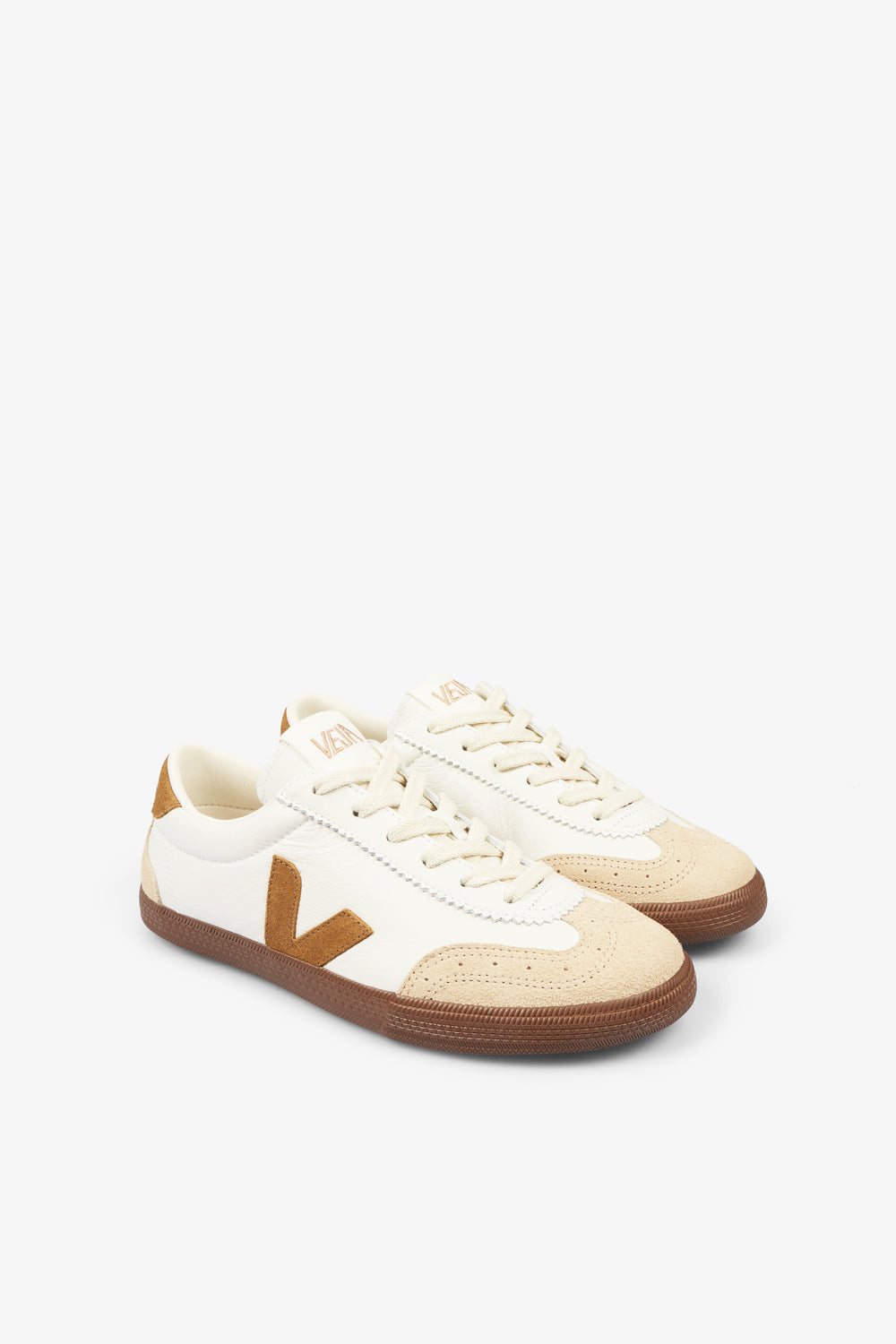 Sapatilhas Veja de vólei confecionadas em tecido de pele O.T. e camurça. Sola exterior recycled, palmilha interior, fecho com atacadores de algodão e pormenor do logótipo da marca.