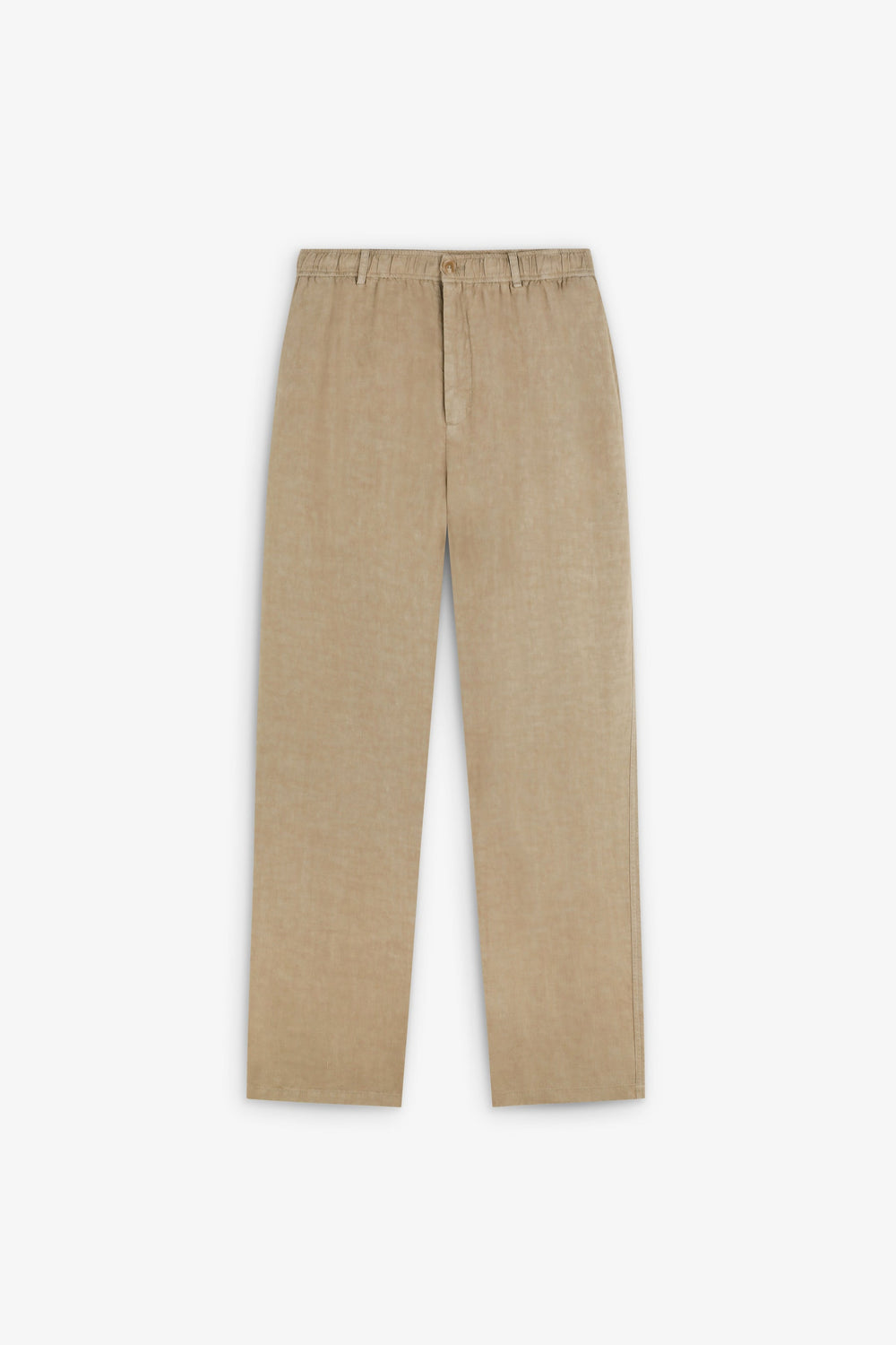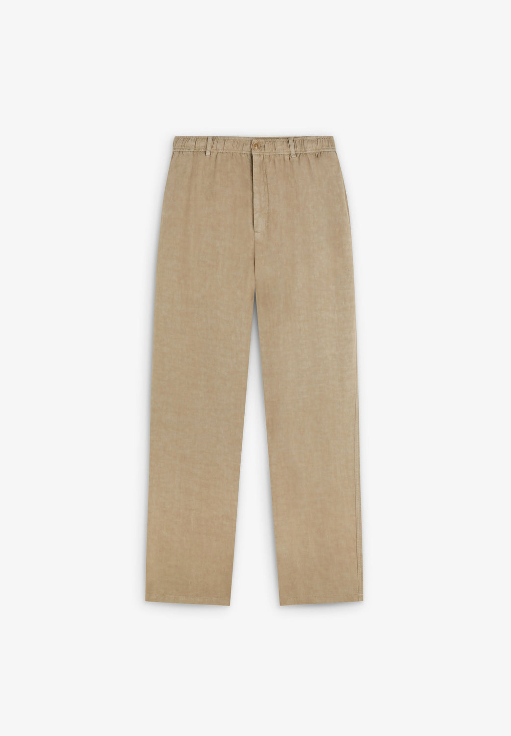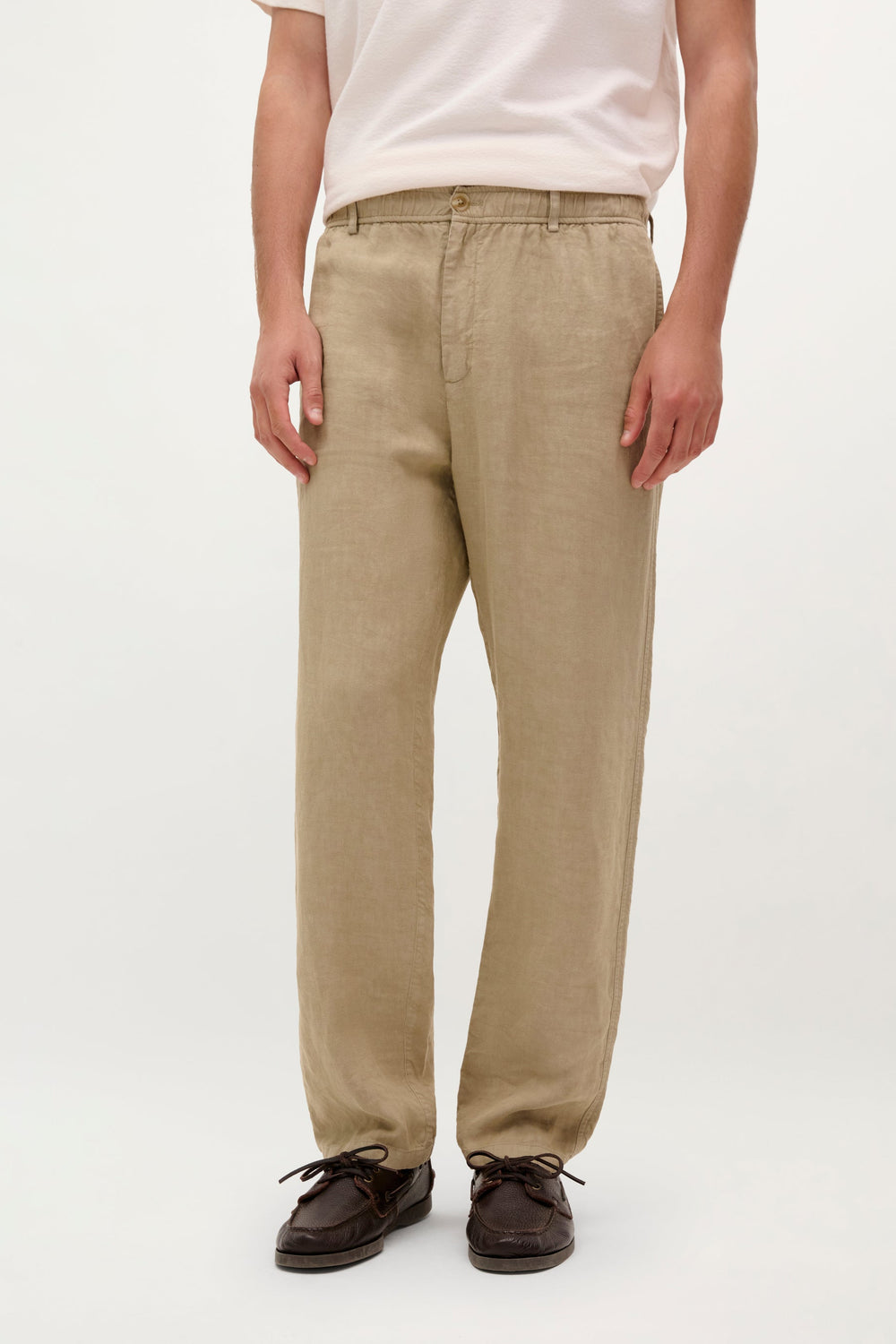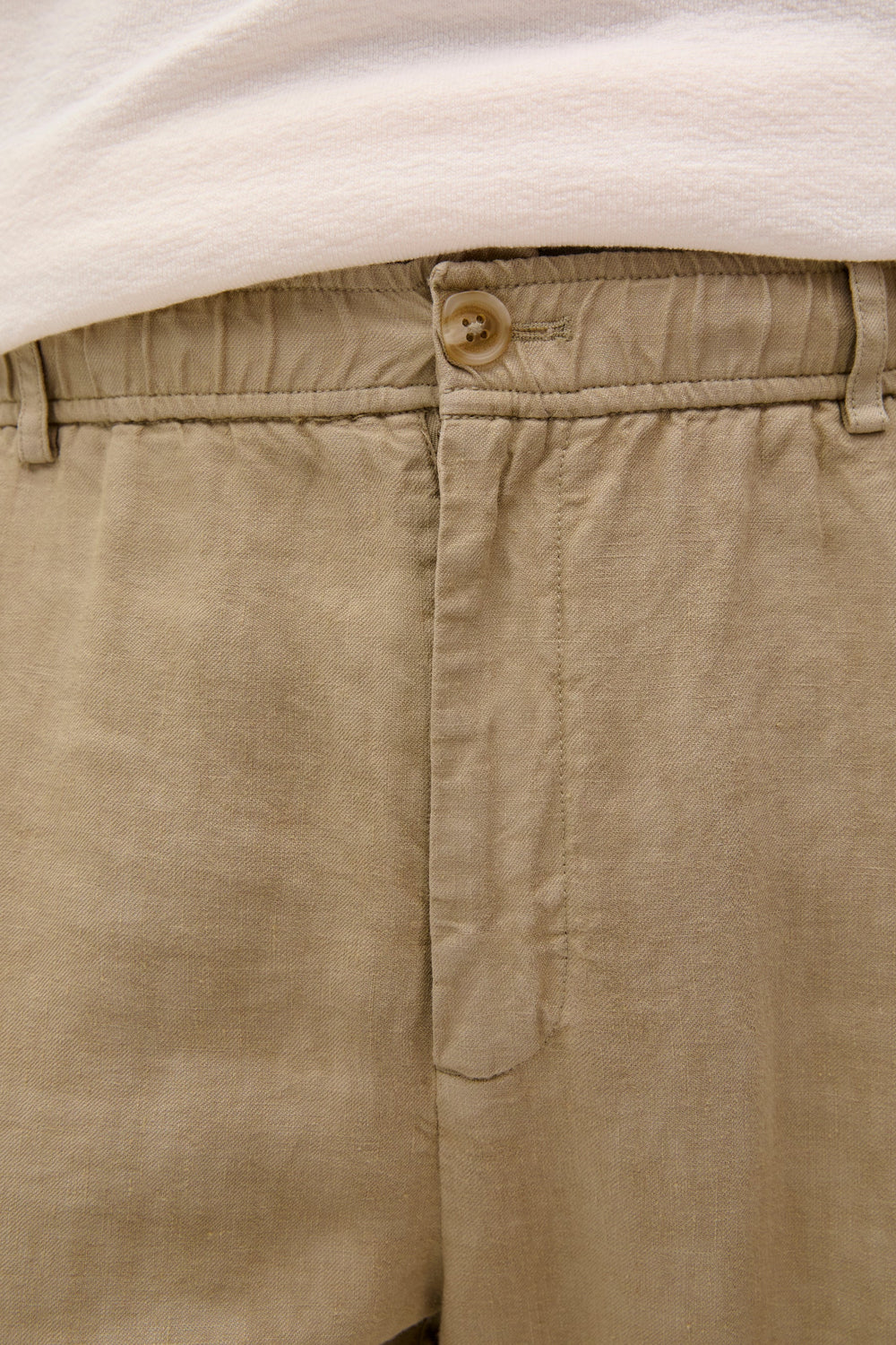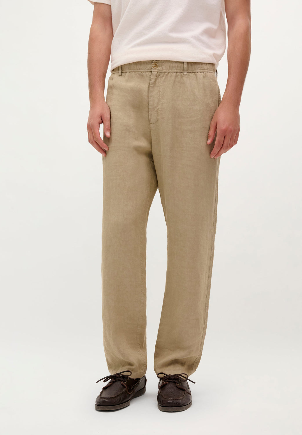 Calças confecionadas em 100% linho. Corte regular. Zip e botão frontal. Bolsos laterais e traseiros com fecho de botão.