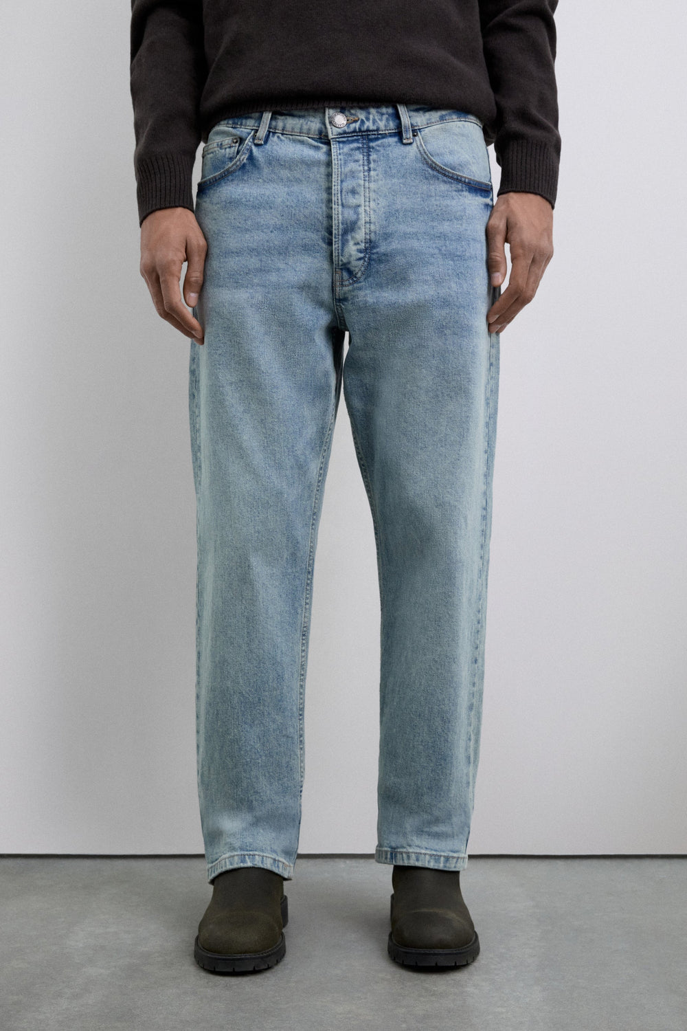 Jeans confecionados em algodão BCI ligeiramente elástico. Regular fit, fecho com botão e zip e bolsos laterais e atrás. Presilhas na cintura.