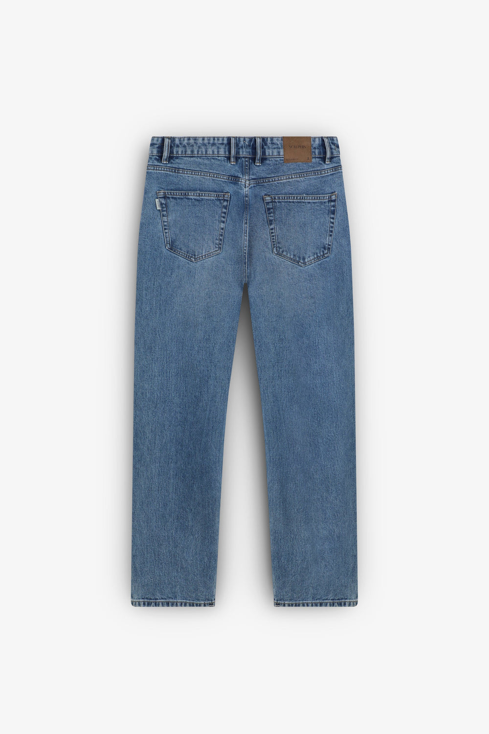 Jeans confecionados em algodão BCI ligeiramente elástico. Regular fit, fecho com botão e zip e bolsos laterais e atrás. Presilhas na cintura.