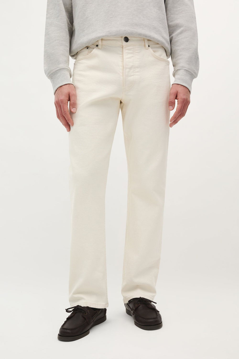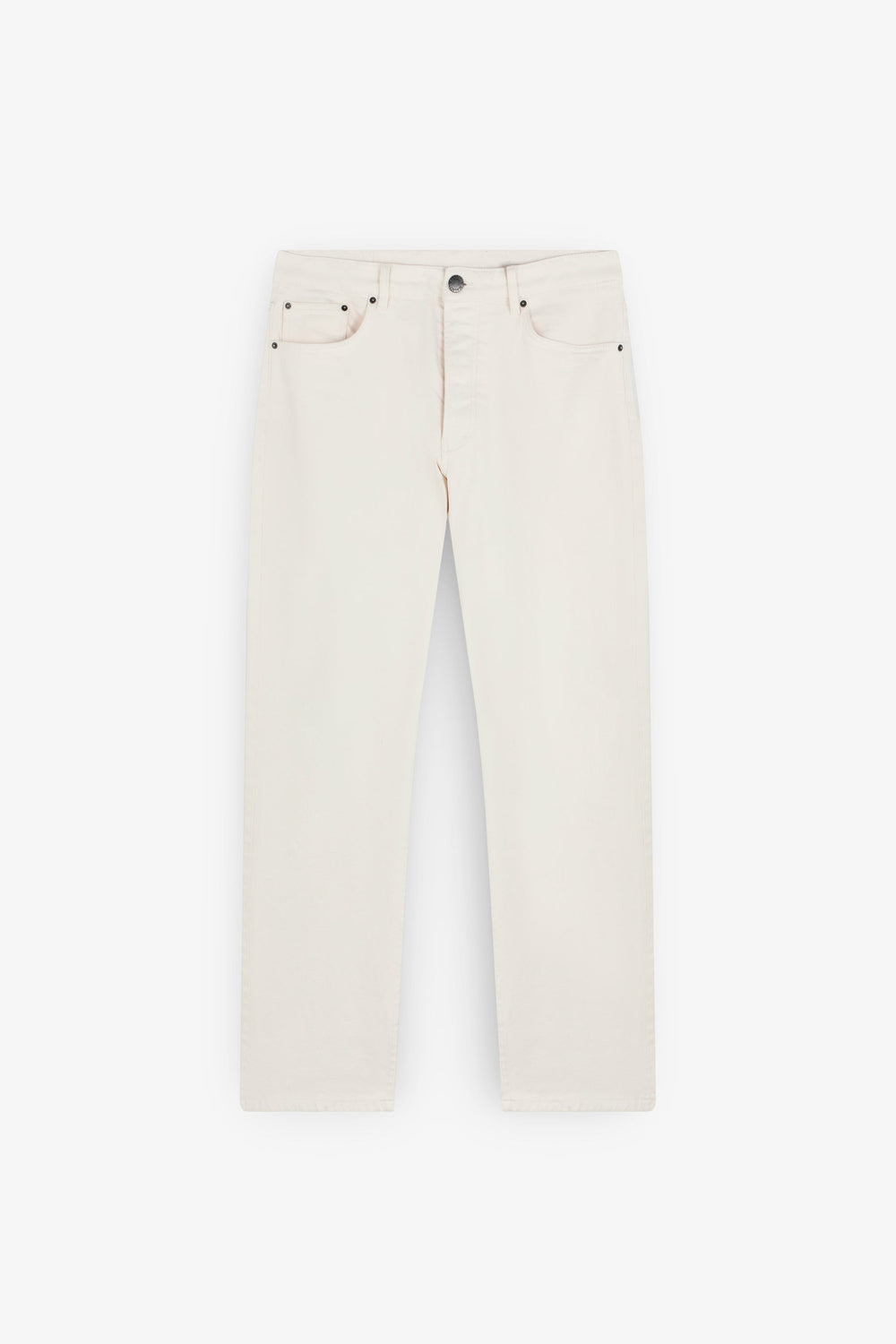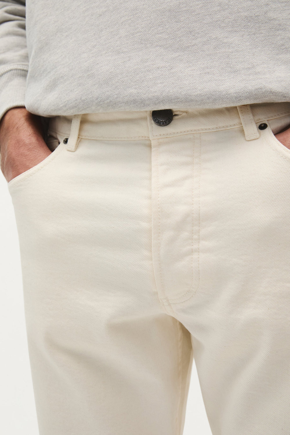 Jeans confecionados em algodão BCI ligeiramente elástico. Regular fit, fecho com botão e zip e bolsos laterais e atrás. Presilhas na cintura.