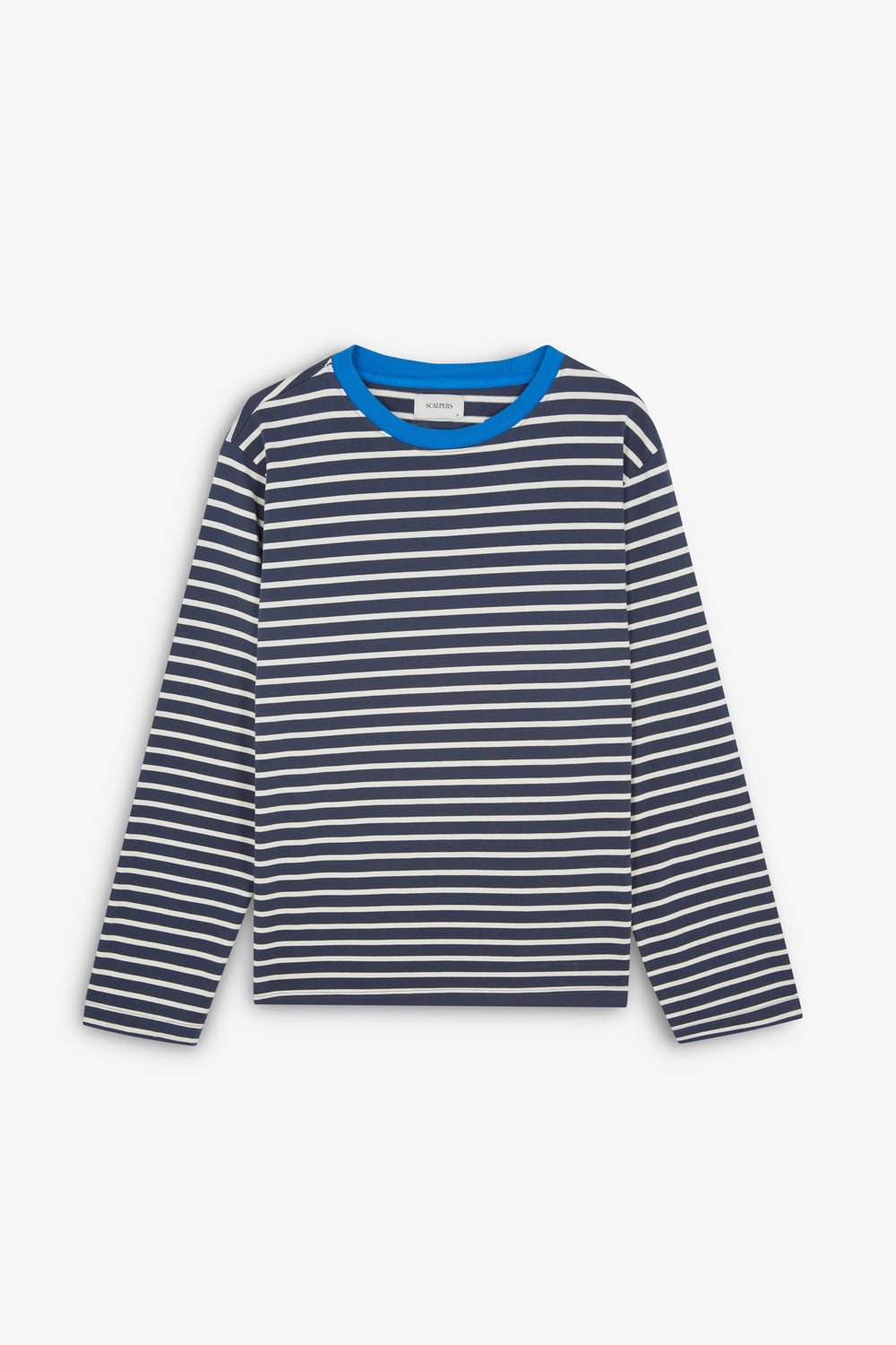 T-shirt às riscas. Confecionada em 100% algodão. Corte regular fit. Decote redondo com nervuras a contrastar. Manga comprida.