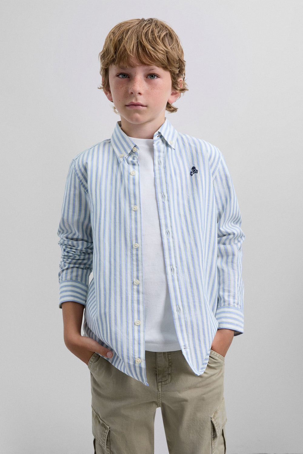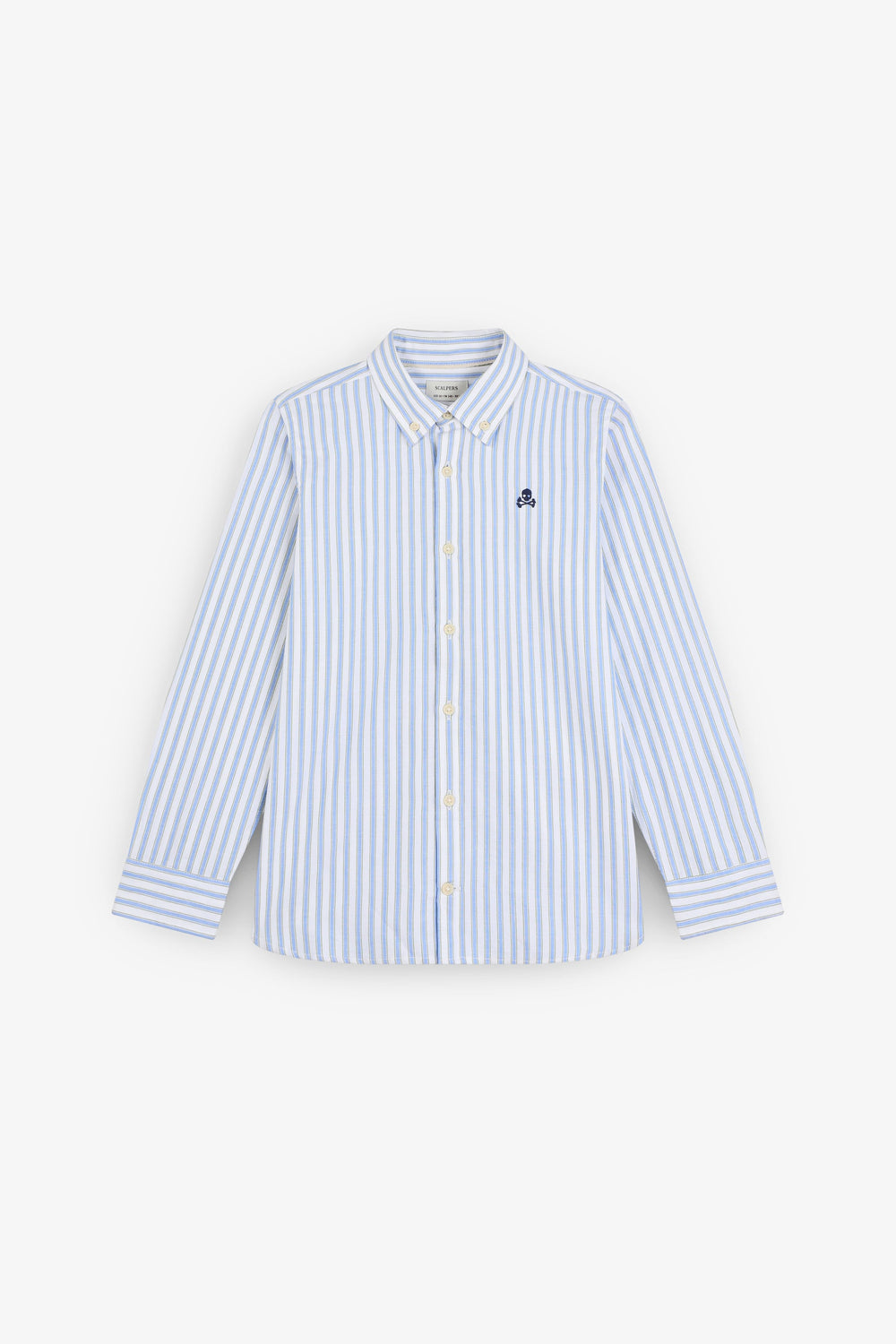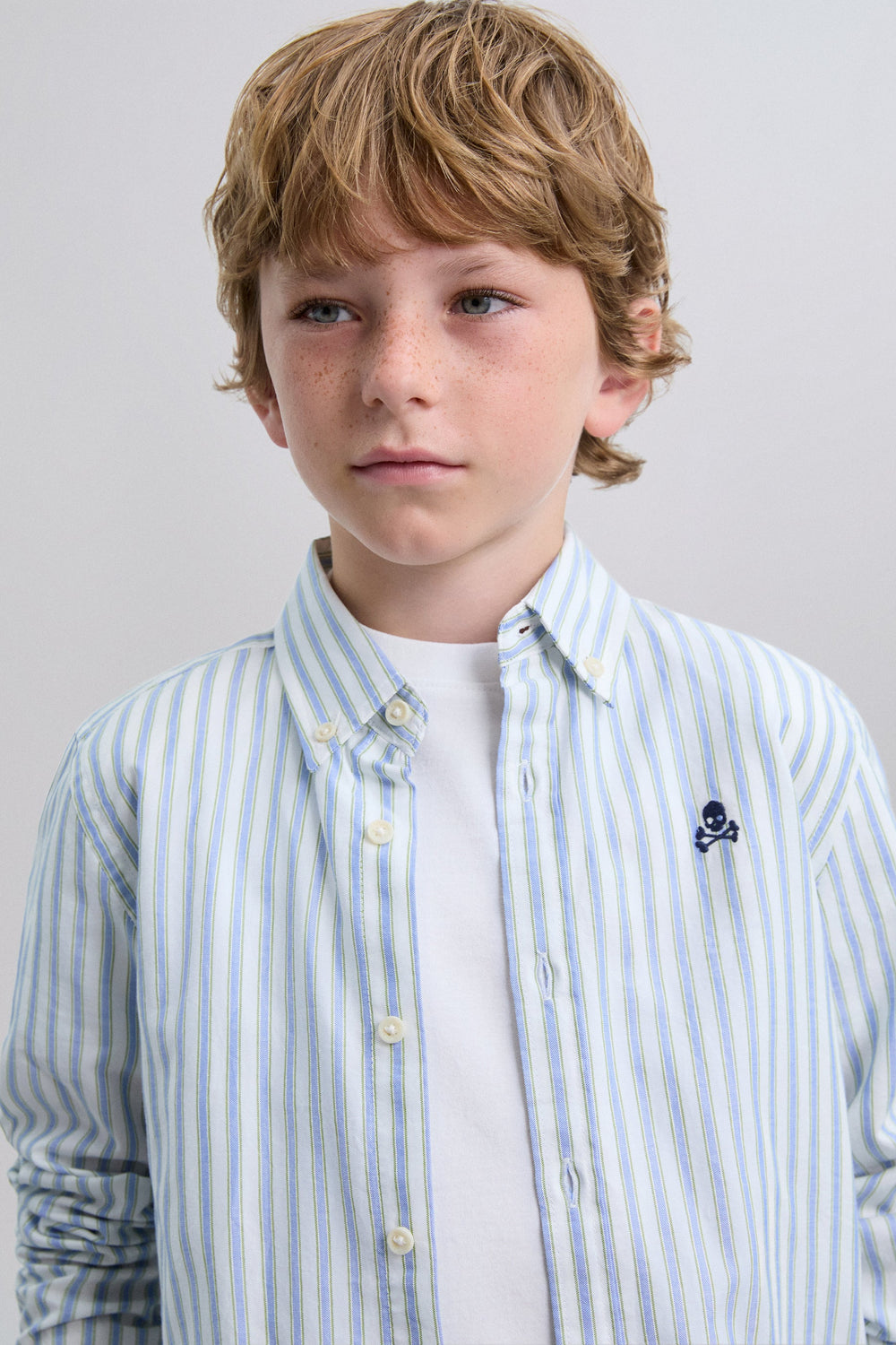 Camisa Oxford confecionada em 100% algodão BCI. Regular fit. Padrão às riscas. Pormenor de skull bordada em contraste no peito.
