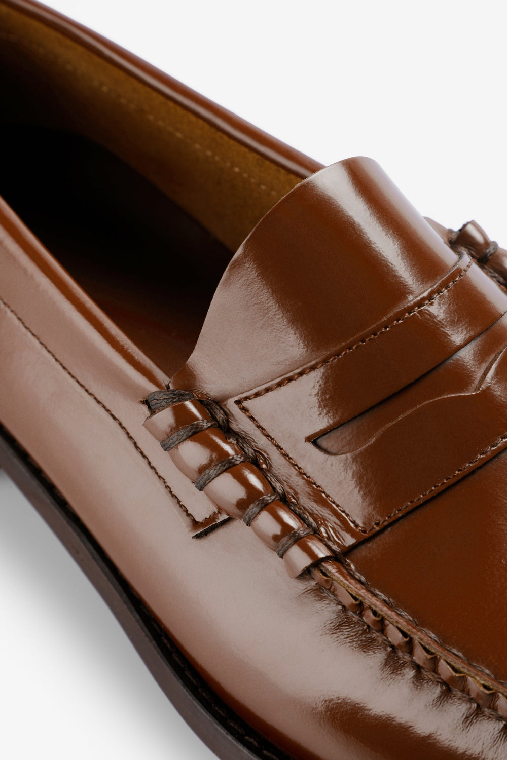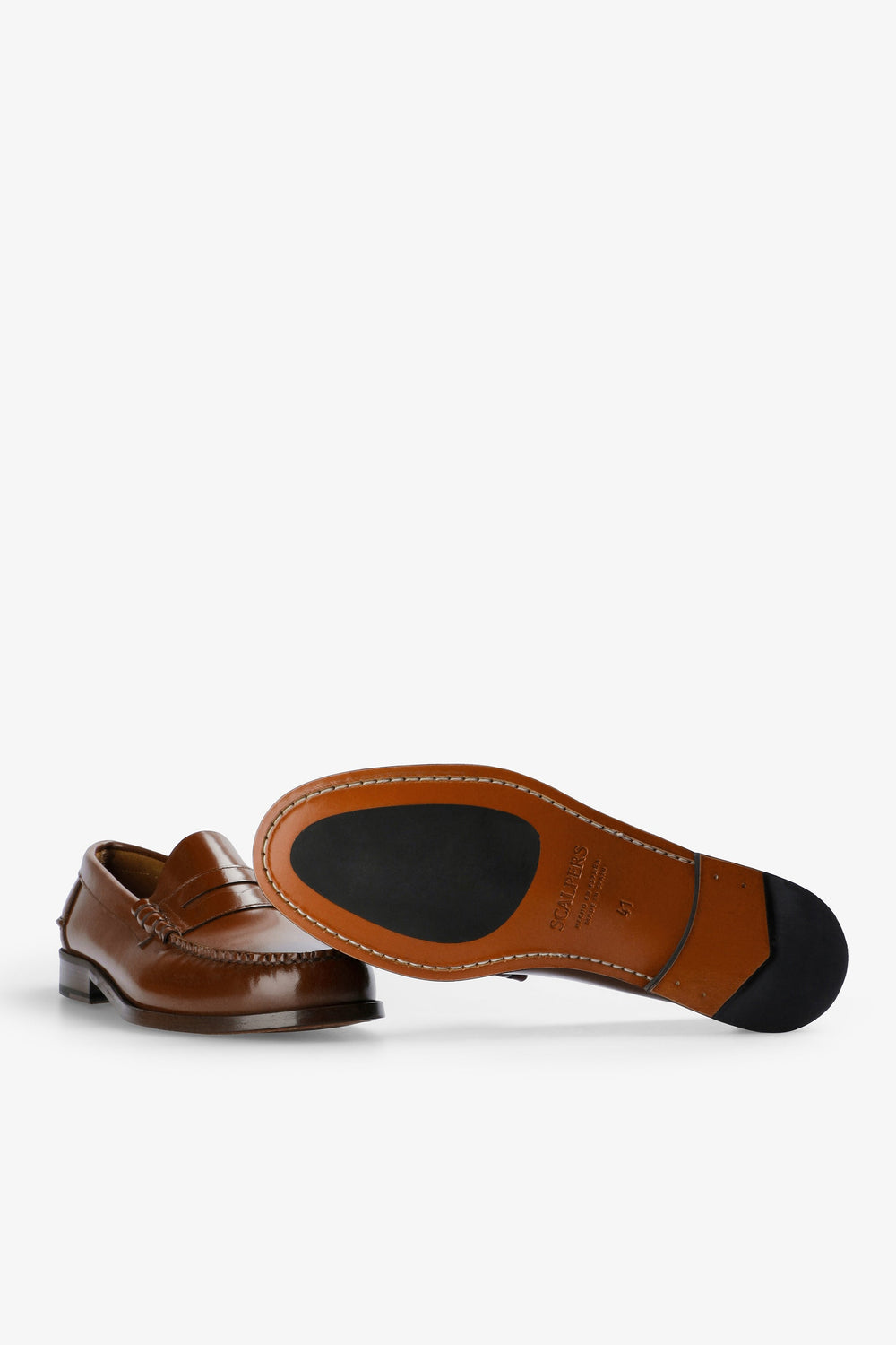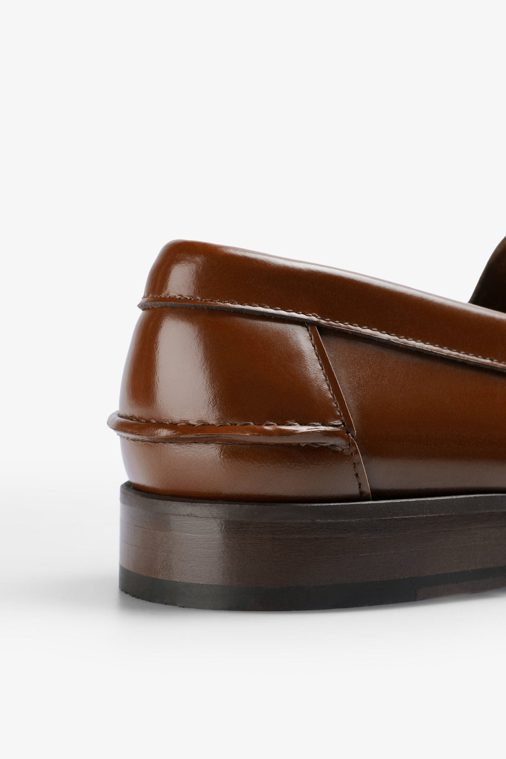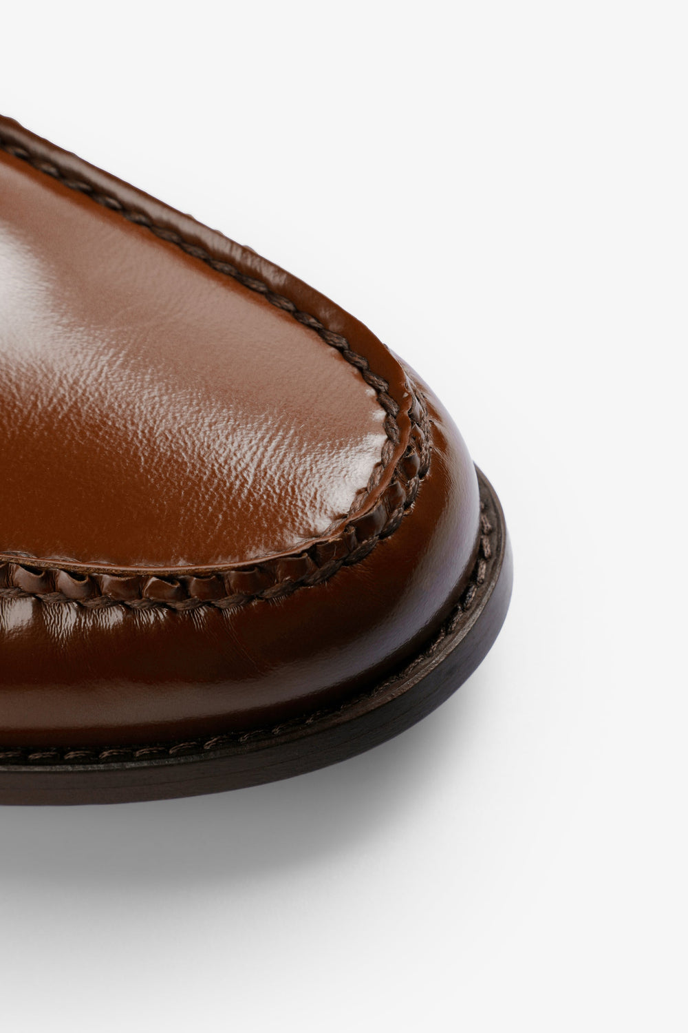 Mocassins elegantes com tira. Parte superior em pele 100% de alta qualidade com acabamento brilhante. Pormenor de tira cosida na gáspea. Palmilha interior em pele. Forma redonda. Sola em pele cosida ao corte.