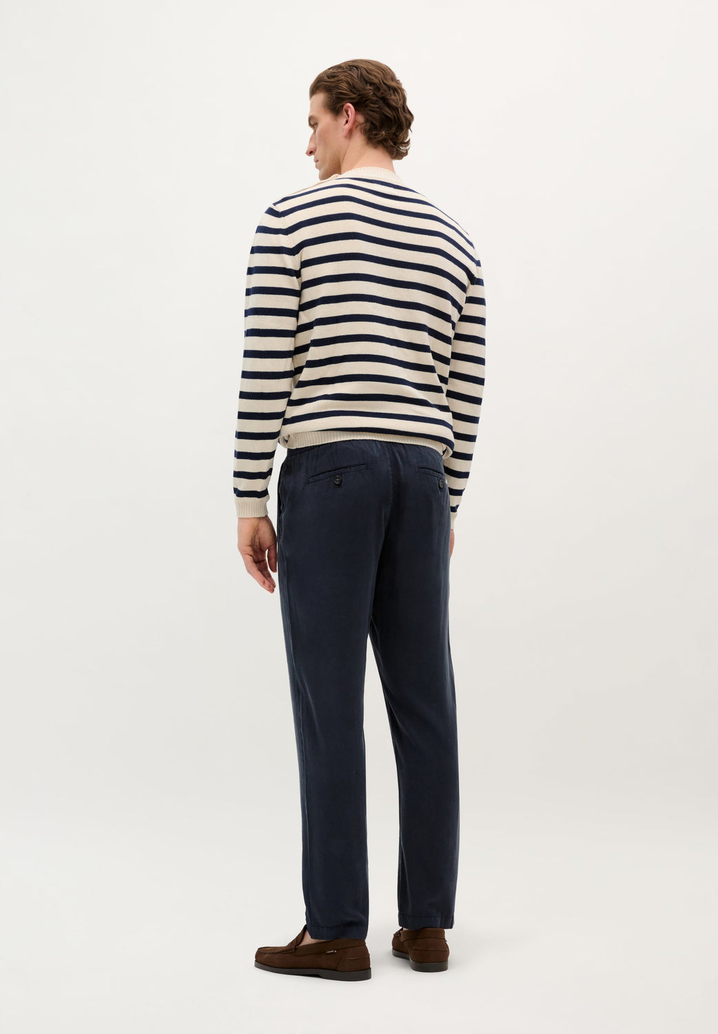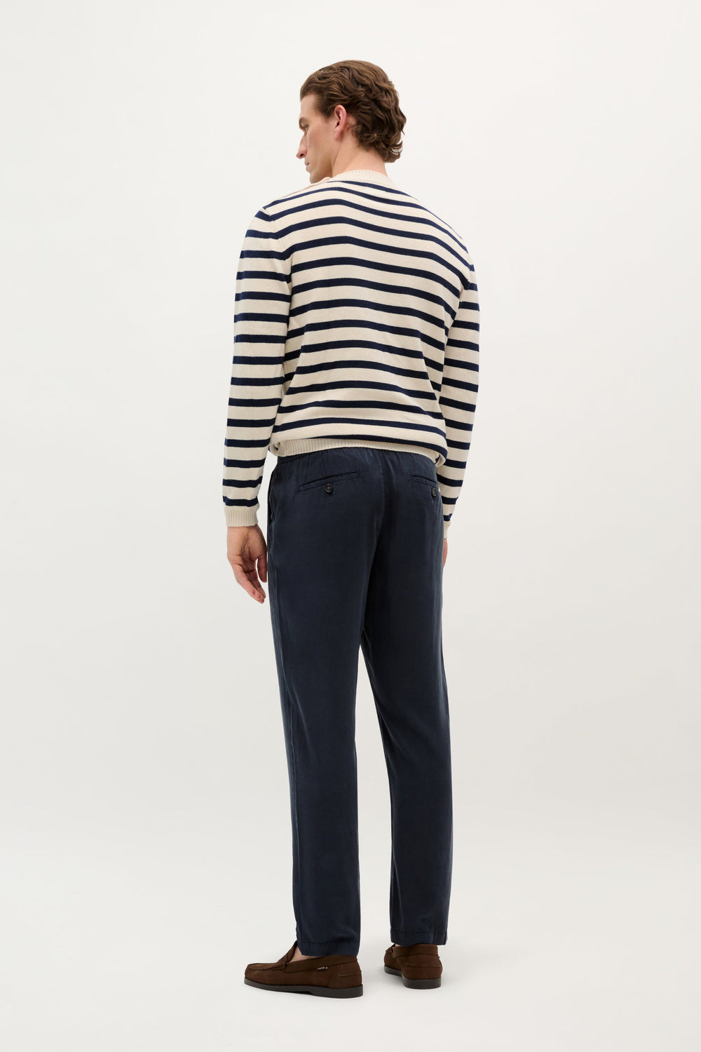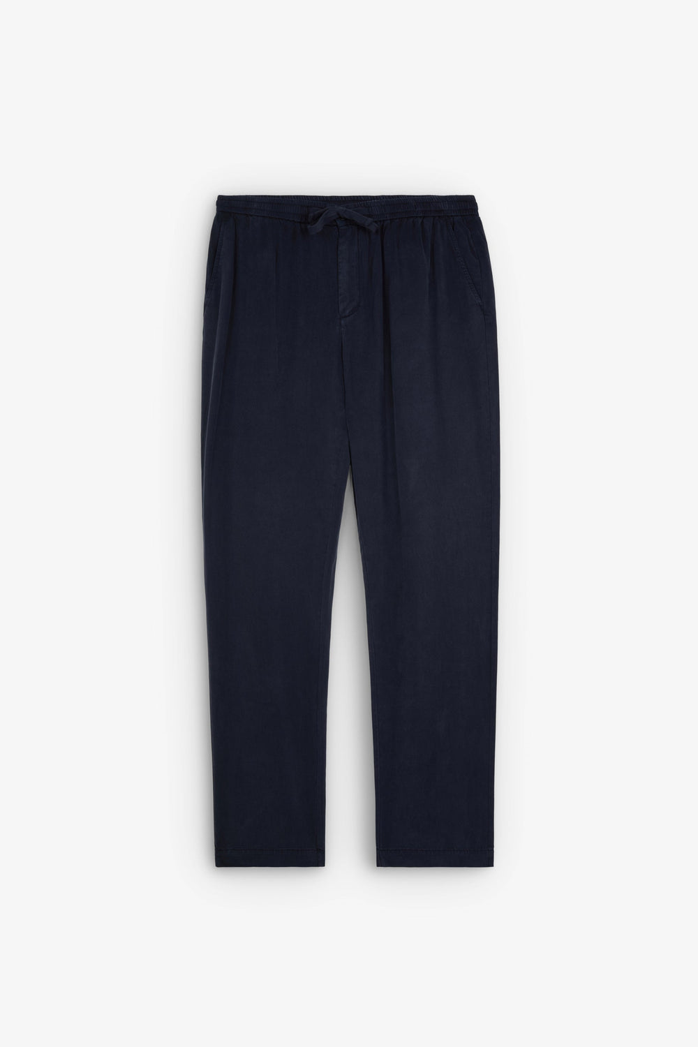 Calças regular fit confecionadas em 100% Tencel ligeiramente elástico e confortável. Cintura elástica ajustável com cordão. Bolsos laterais e pormenor de bolsos atrás com fecho de botão.