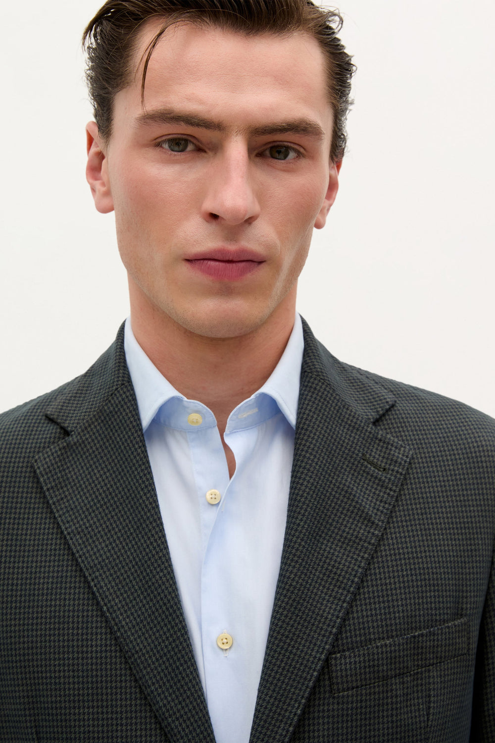 Blazer confecionado em tecido de mistura de algodão e linho. Corte Slim Fit, gola com lapelas entalhadas e casa de botão e fecho com dois botões. Manga comprida terminada em punho com três botões e bolsos à frente. Aberturas traseiras e bolsos interiores.