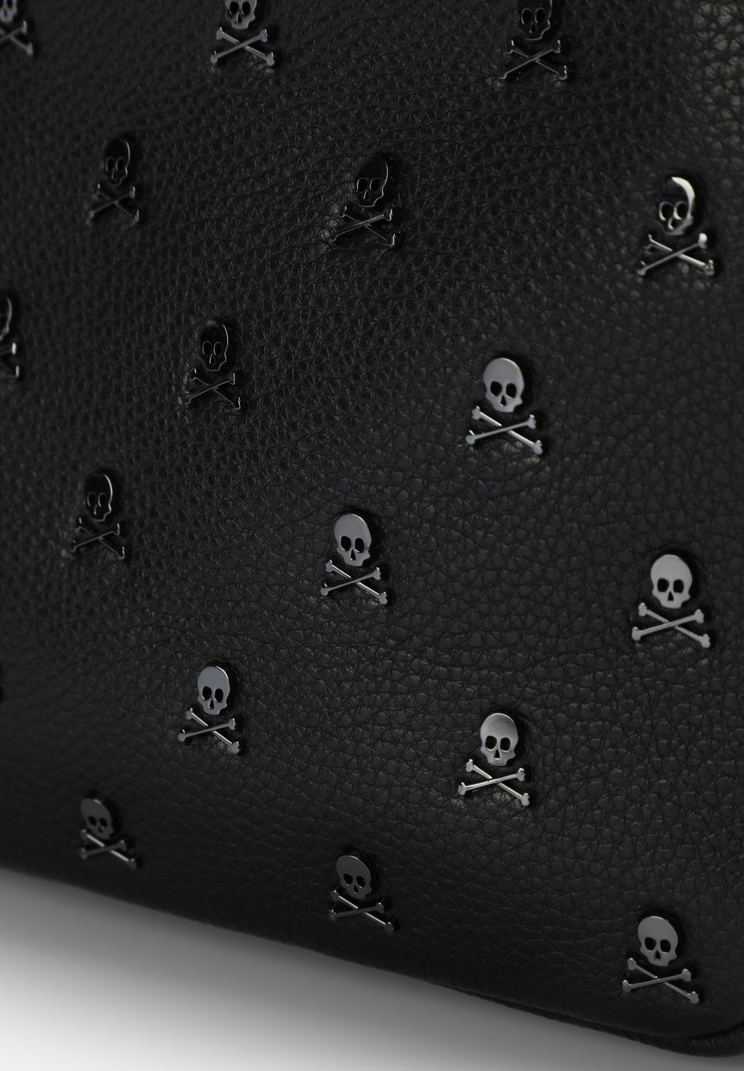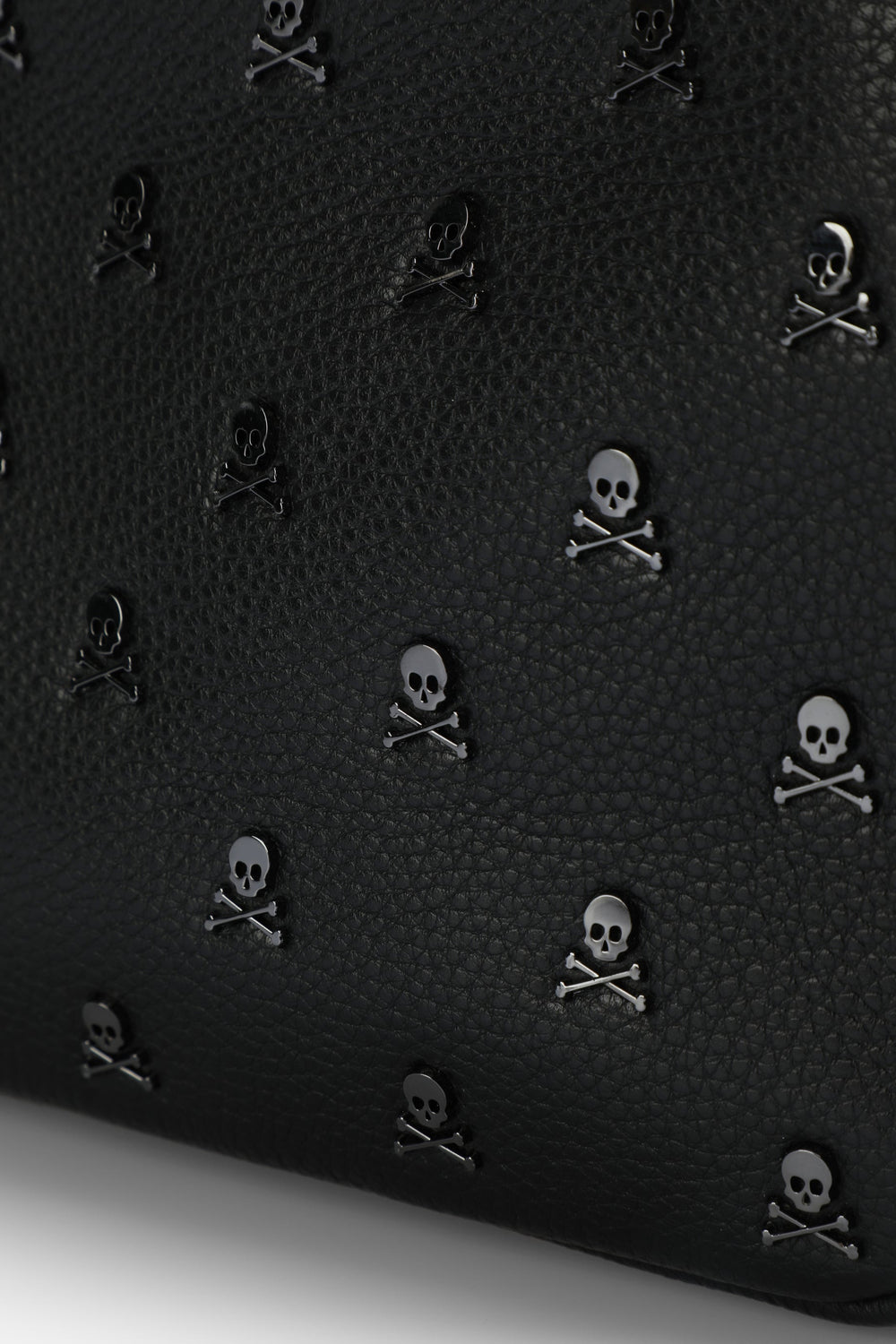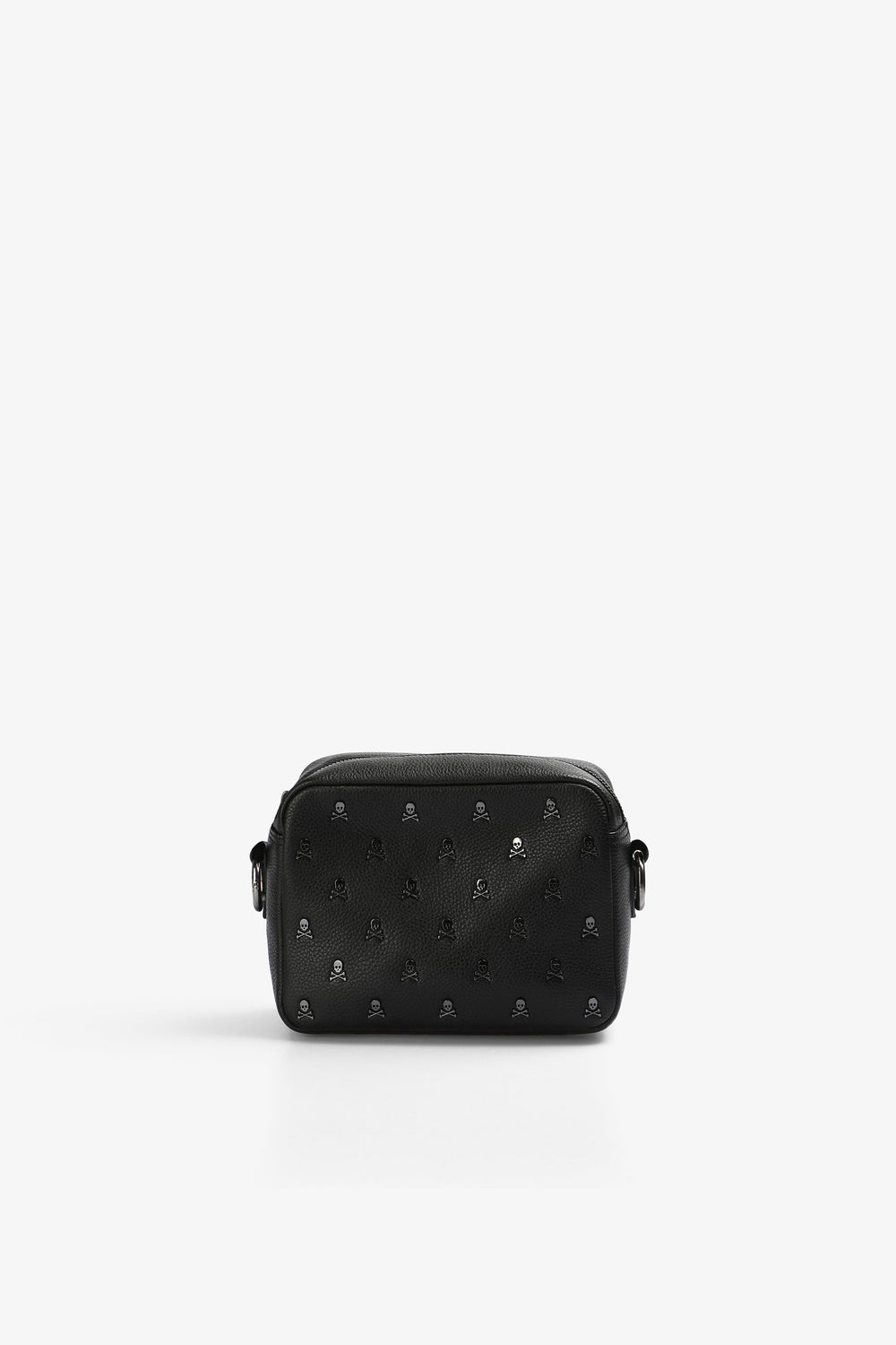 Bolso bandolera confeccionado en 100% piel. Cierre con cremallera, asa larga ajustable y calaveras metálicas all over.