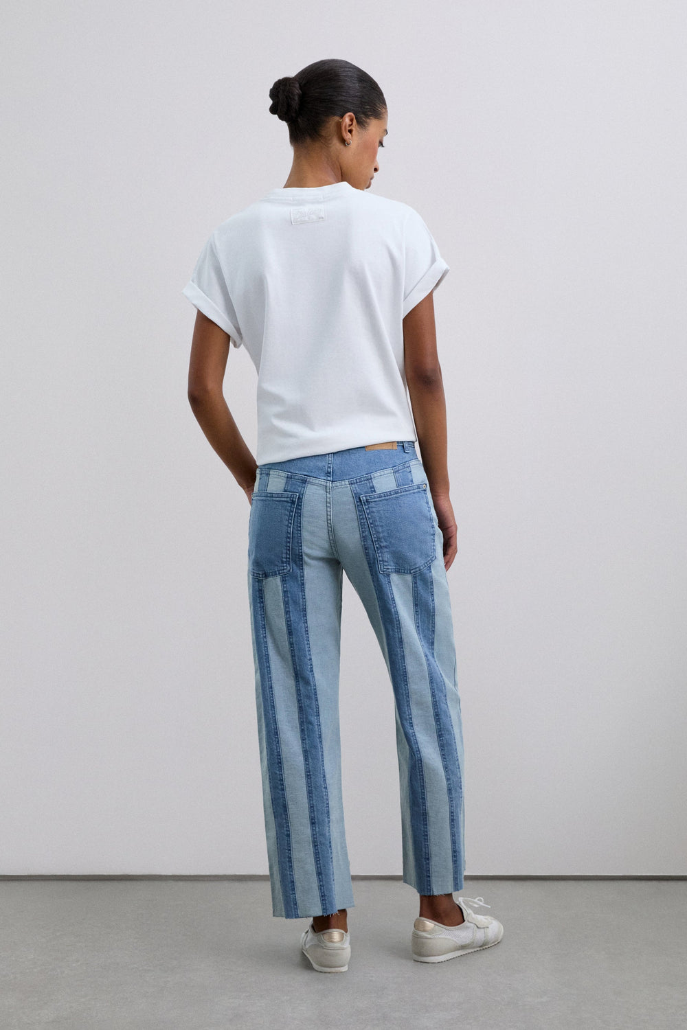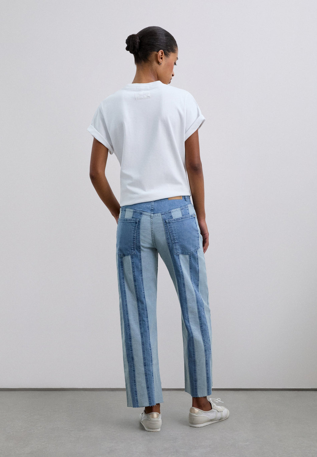 Calças jeans confecionadas em 98% Algodão Orgânico BCI. Corte direito. Dois bolsos à frente. Dois bolsos atrás. Pormenor denim a contrastar com motivo às riscas. Fecho com botão e zip à frente.