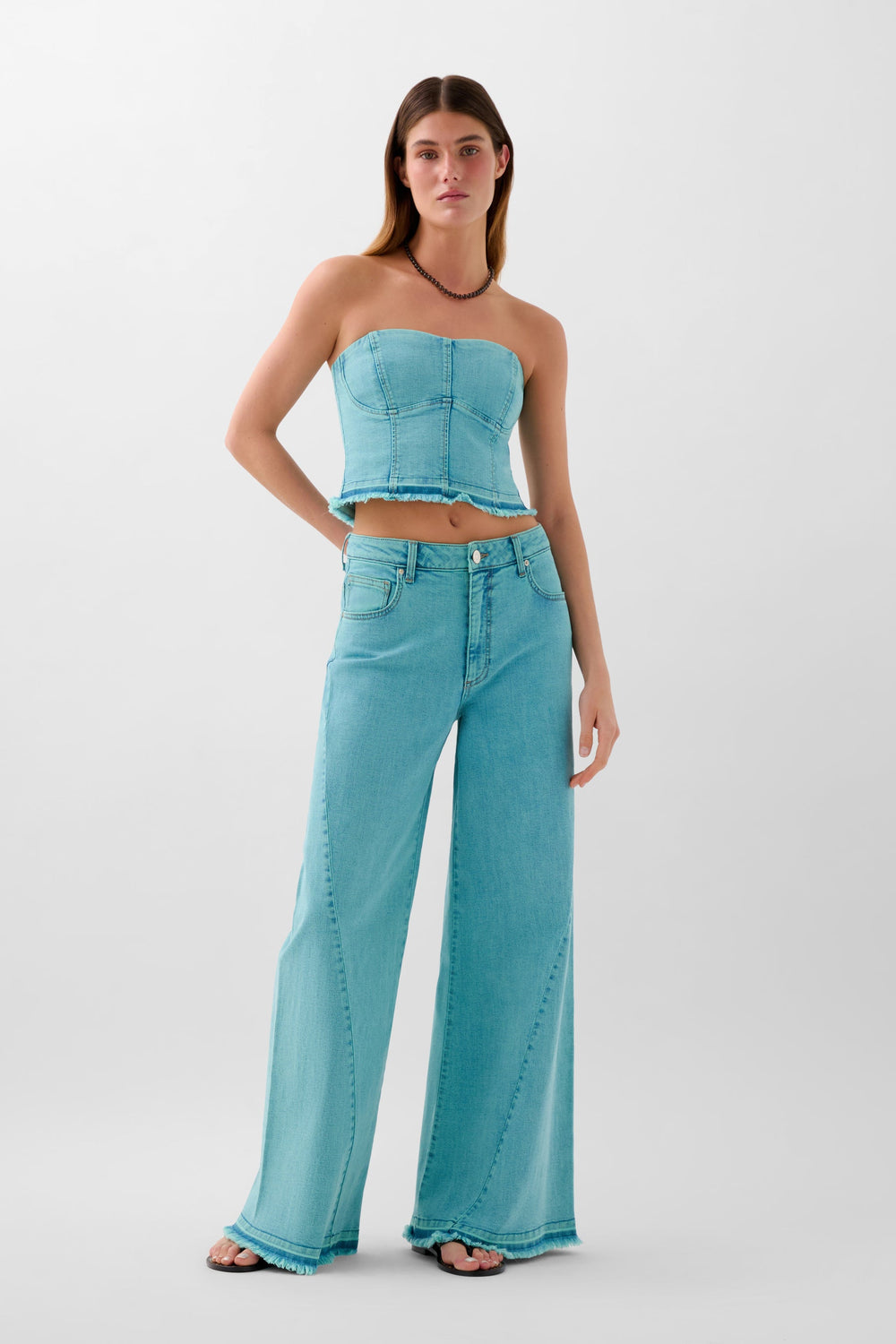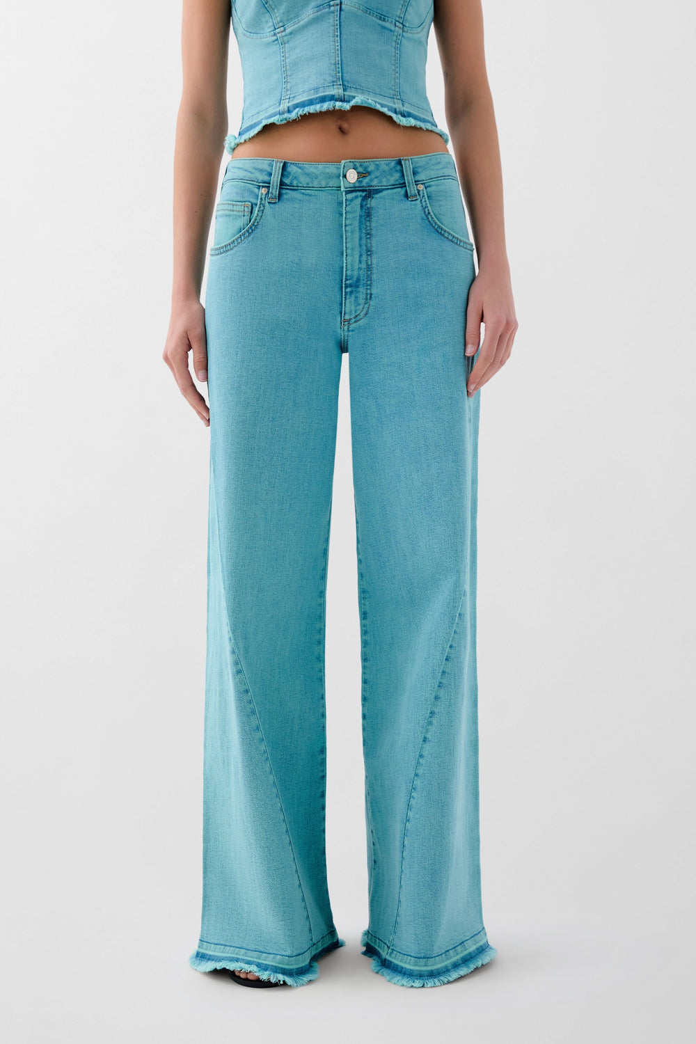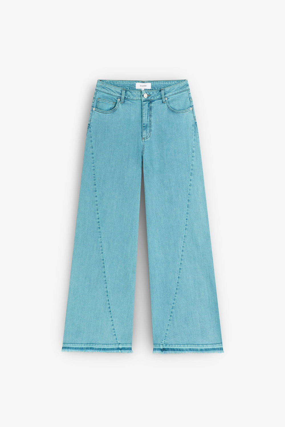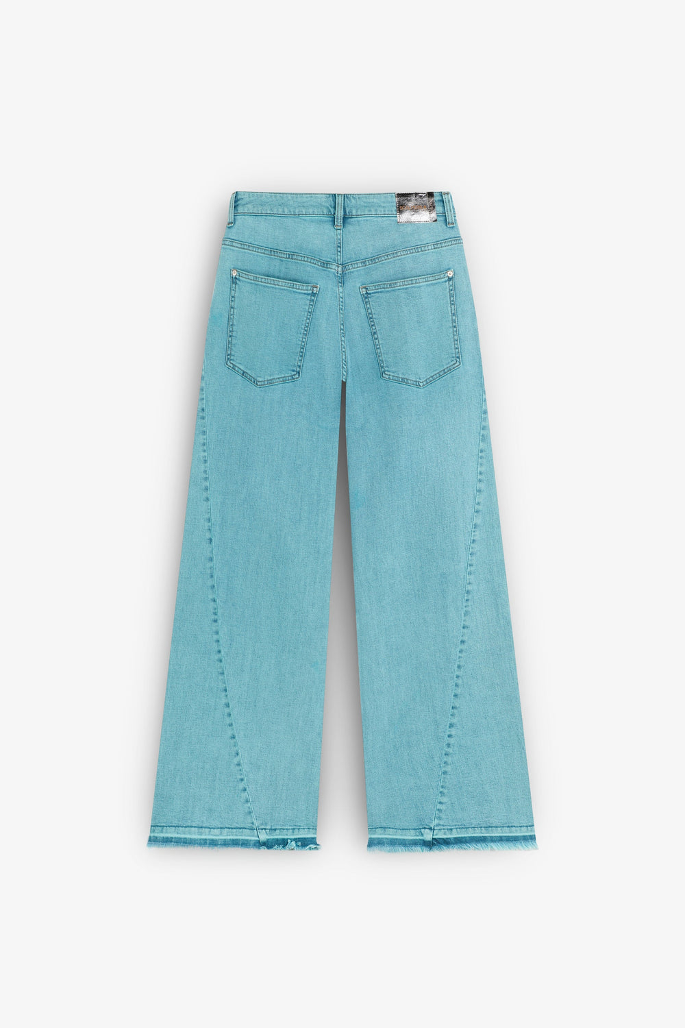 Calças denim confecionadas em algodão. Corte regular fit, culottes, efeito desbotado. Fecho de correr e botão. Bolsos à frente inclinados e de remendo atrás. Bainha desfiada.