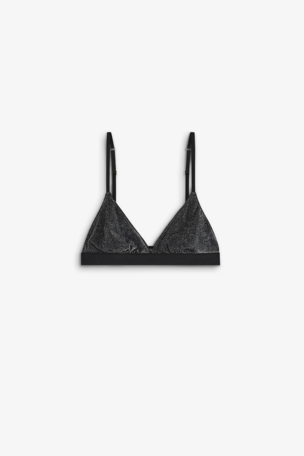 Bralette confecionado em tecido com fio metalizado. Alças ajustáveis.