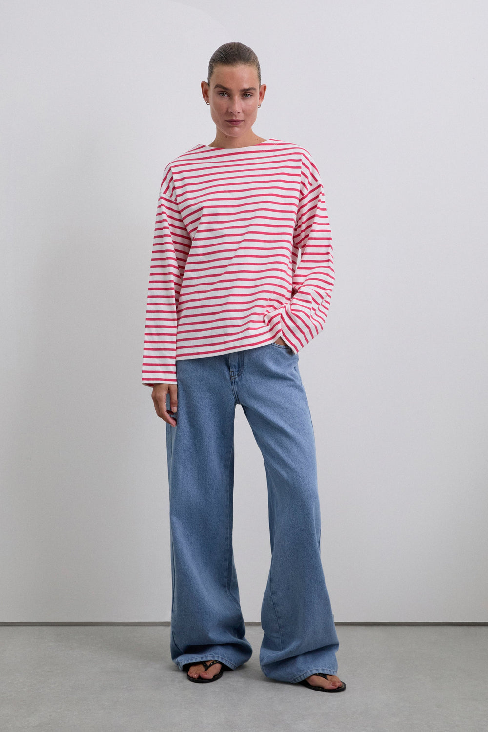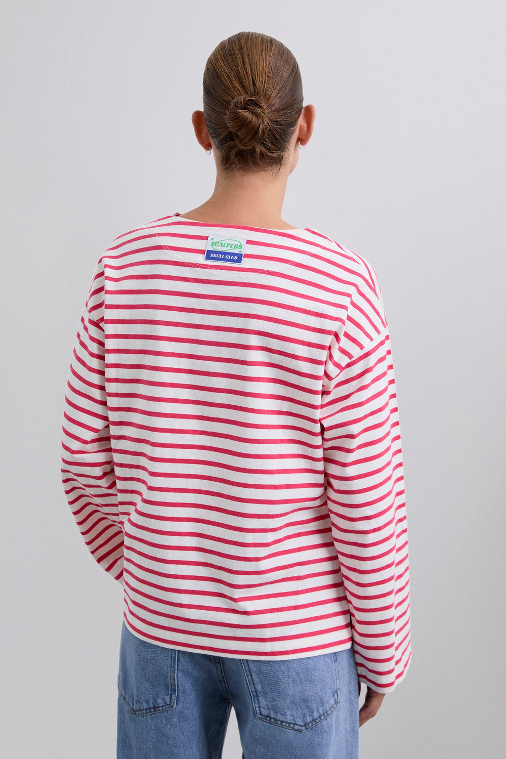T-shirt às riscas confecionada em 100% algodão. Relaxed fit, decote redondo e manga comprida. Pormenor de etiqueta de logótipo atrás.