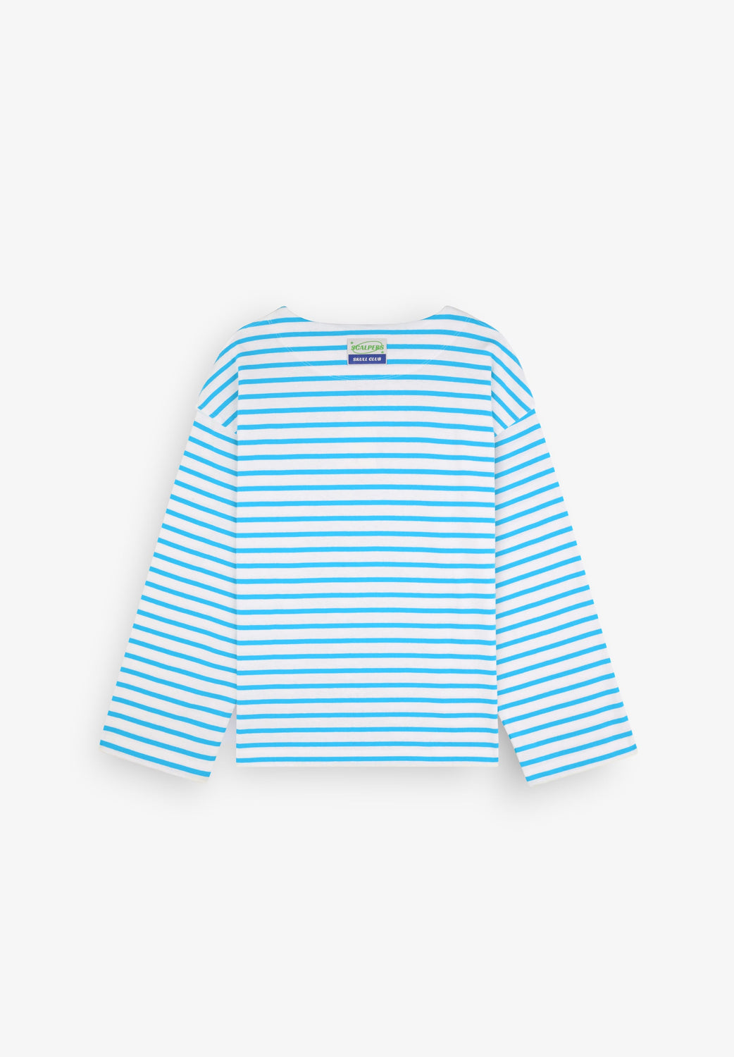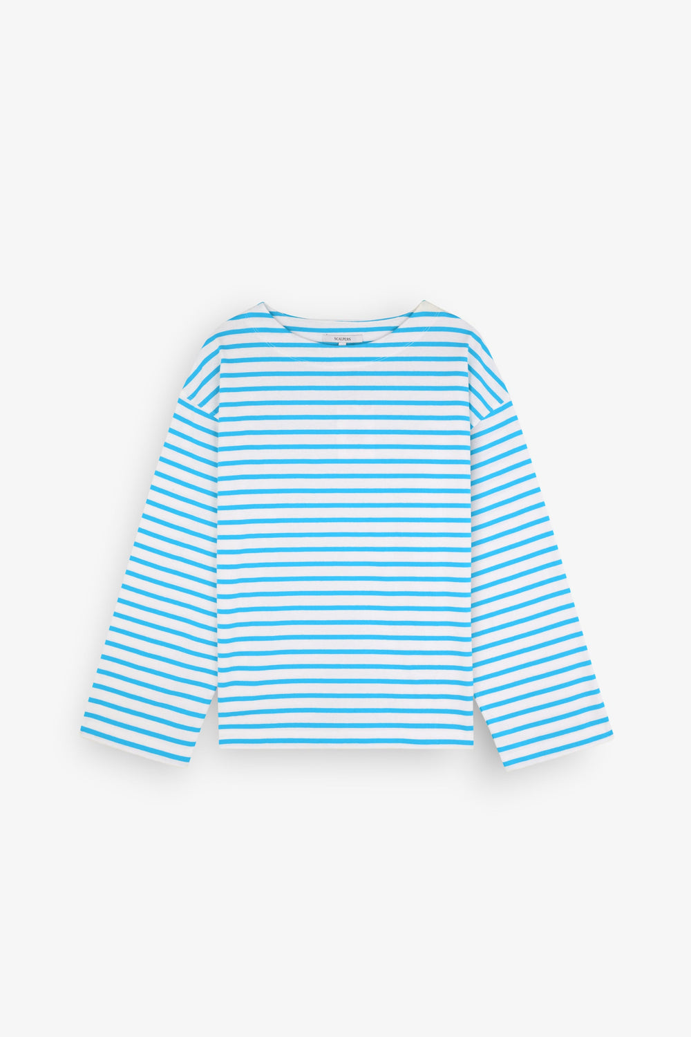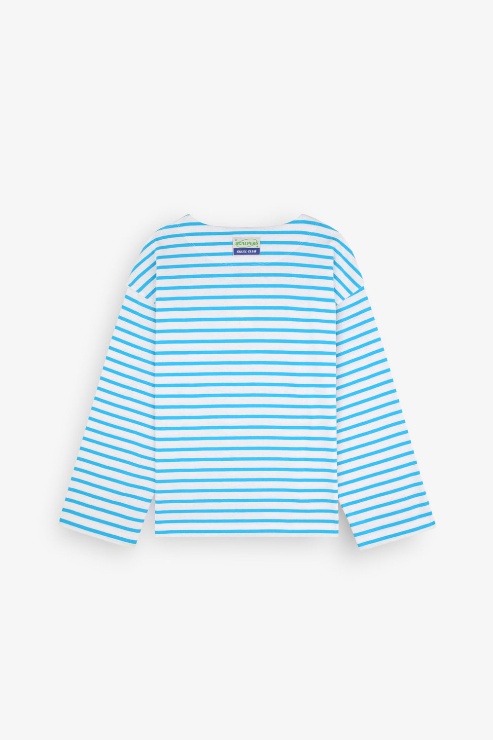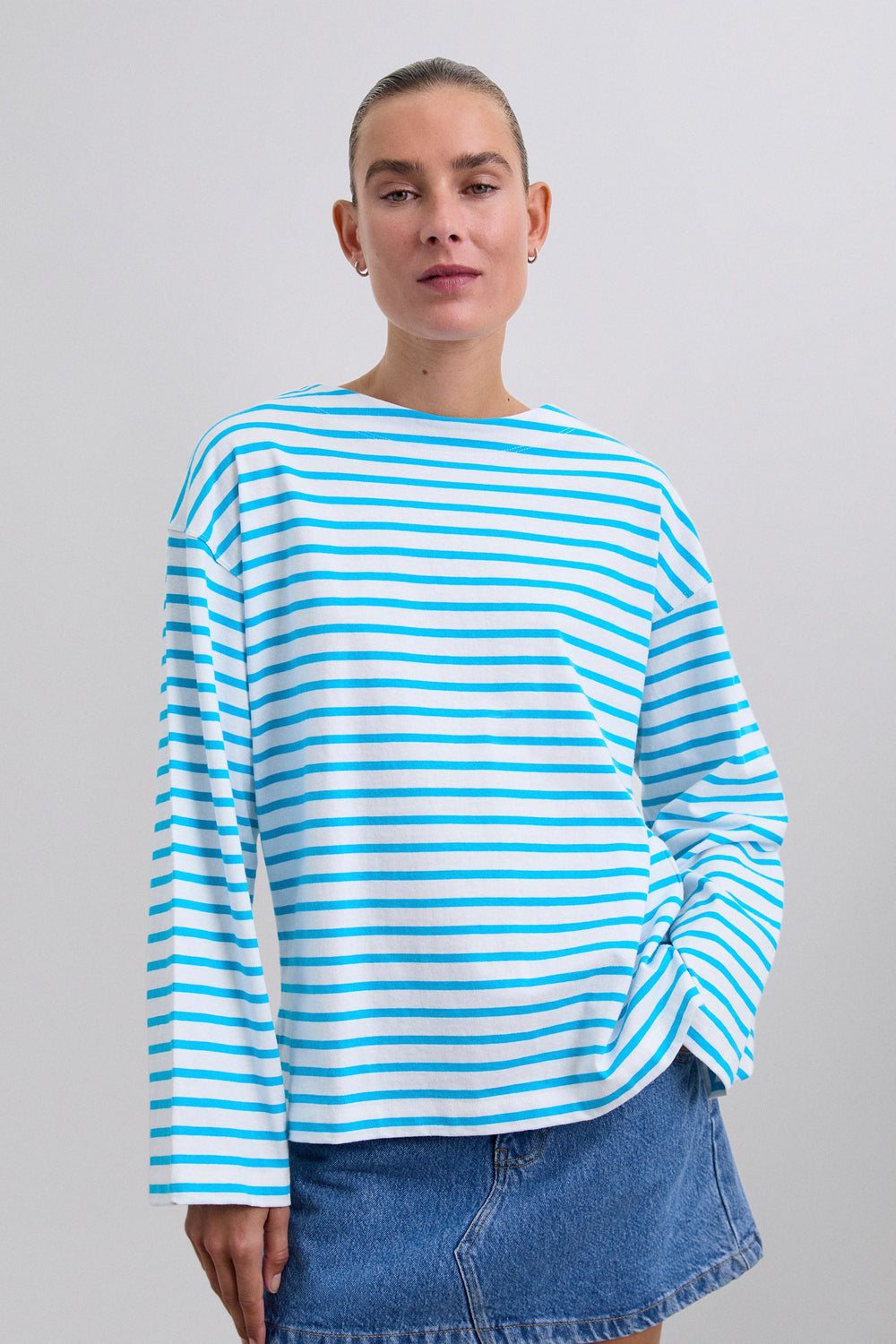 T-shirt às riscas confecionada em 100% algodão. Relaxed fit, decote redondo e manga comprida. Pormenor de etiqueta de logótipo atrás.