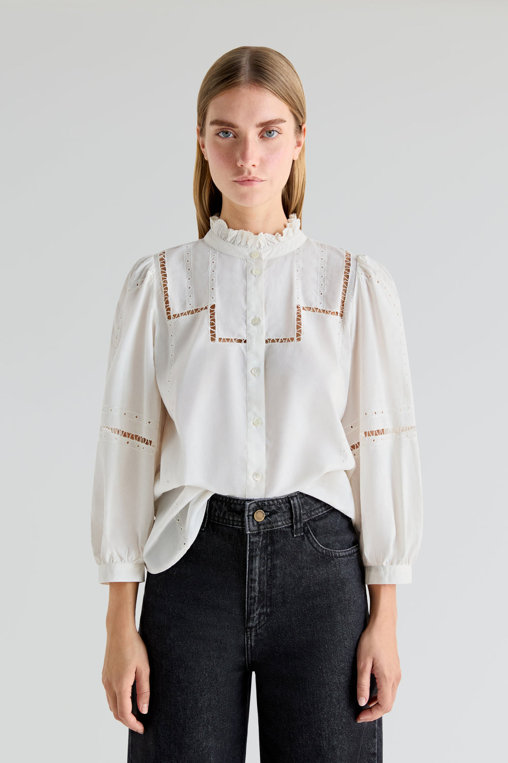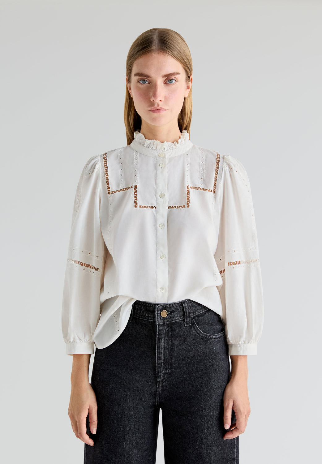- Fecho com botões à frente.