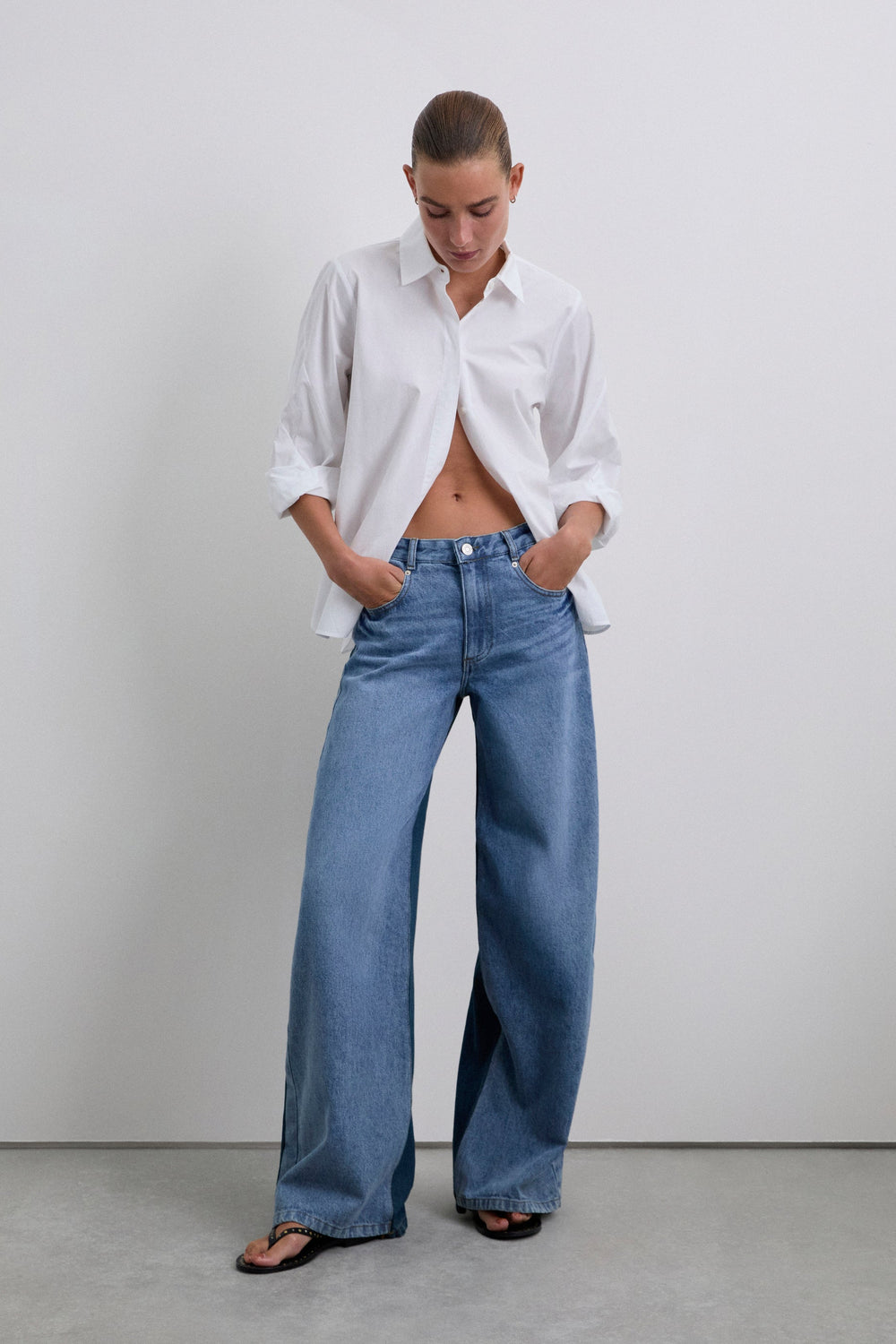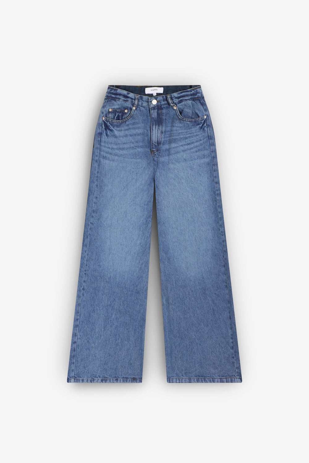 Calças denim confecionadas em 100% algodão. Corte regular fit, bicolores, fecho de correr e botão, presilhas na cintura, five pockets.