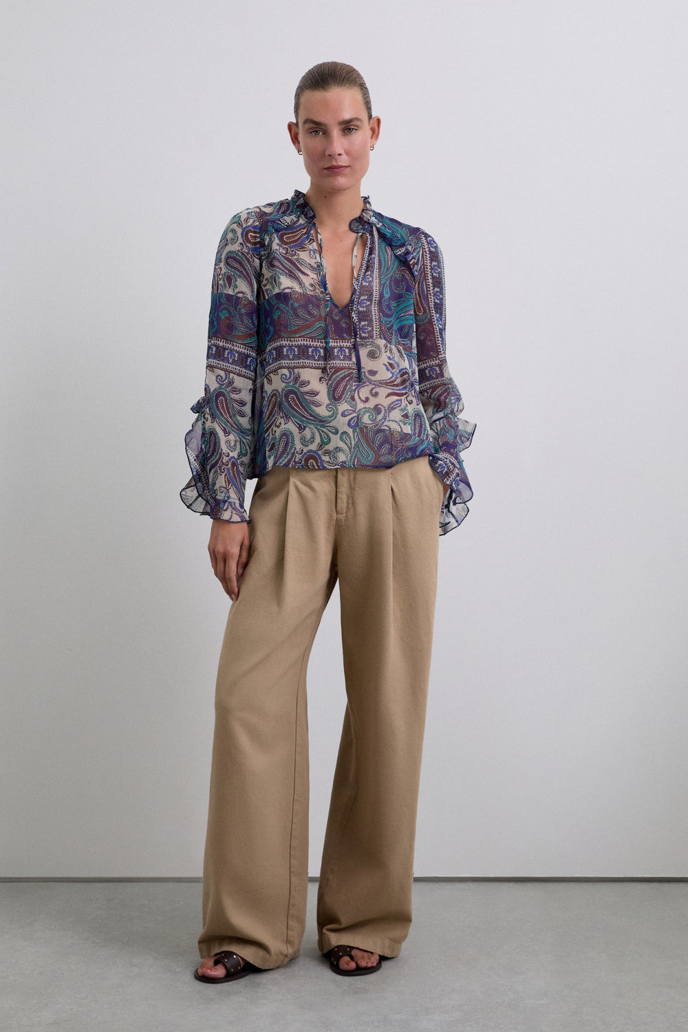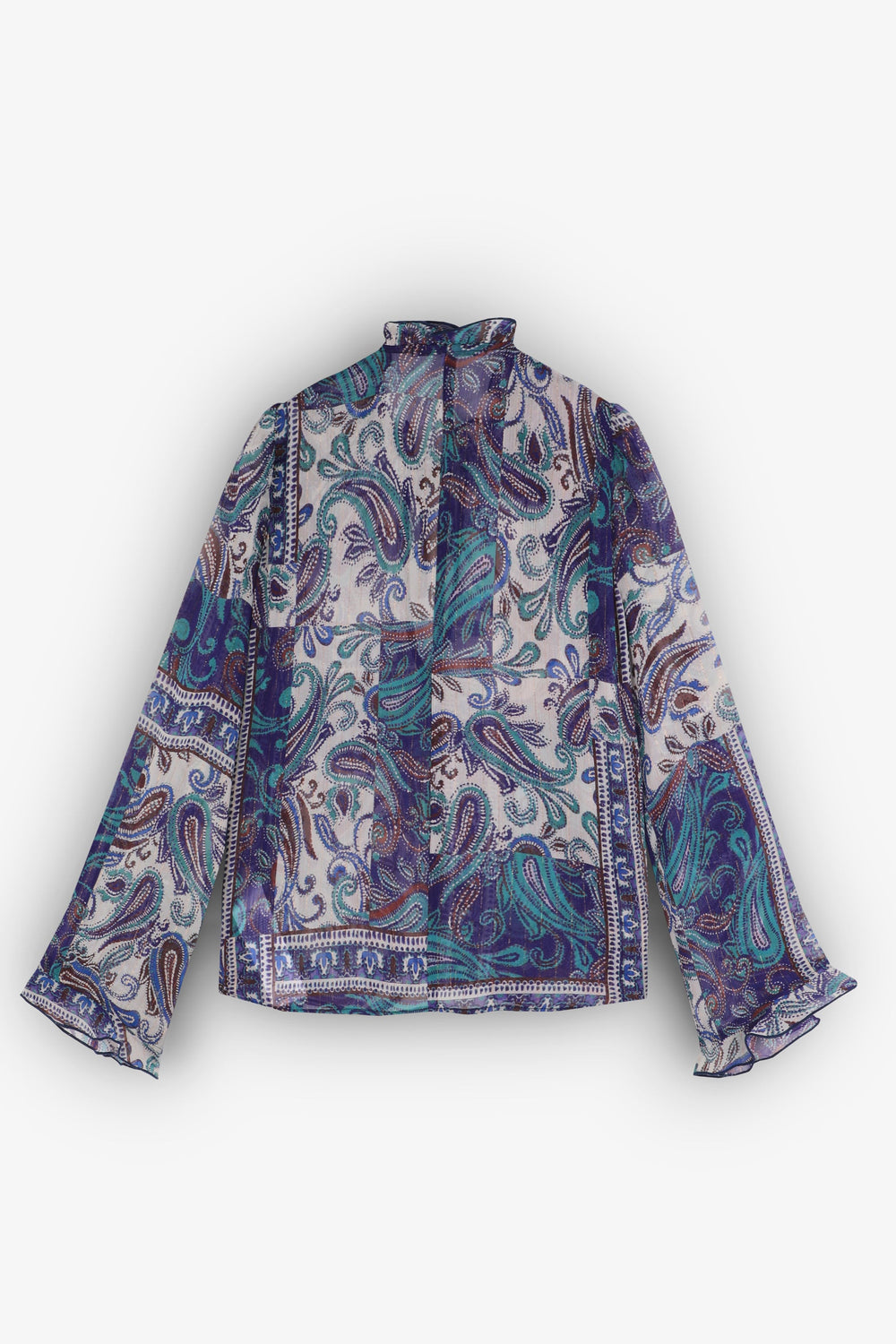 Blusa confeccionada en tejido fluido con estampado Pasley. Corte regular fit, escote en V con detalles en hombros. Manga larga ligeramente abullonada con detalle de volante.