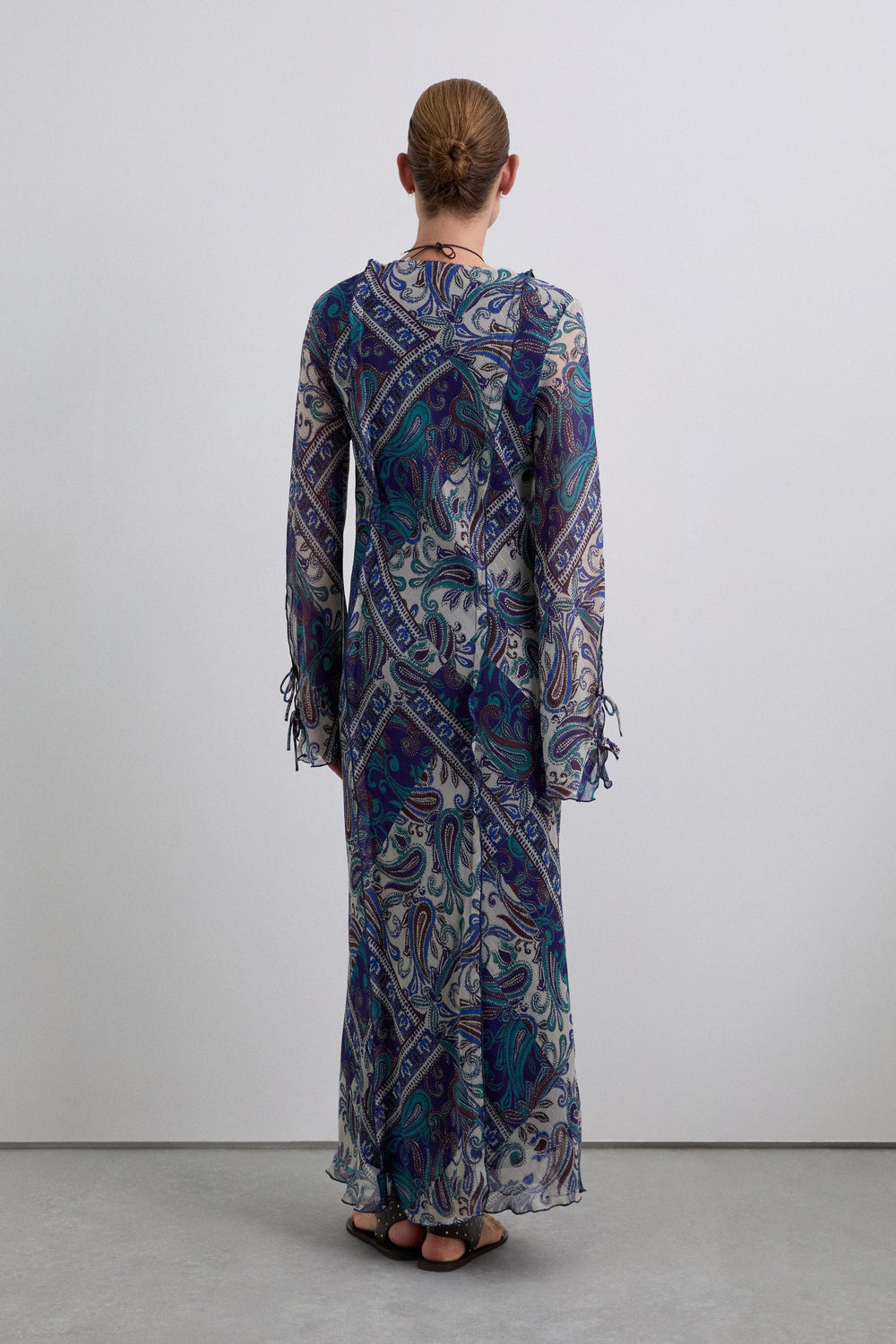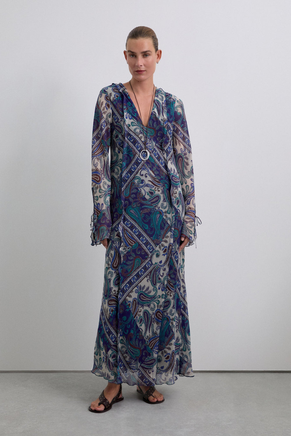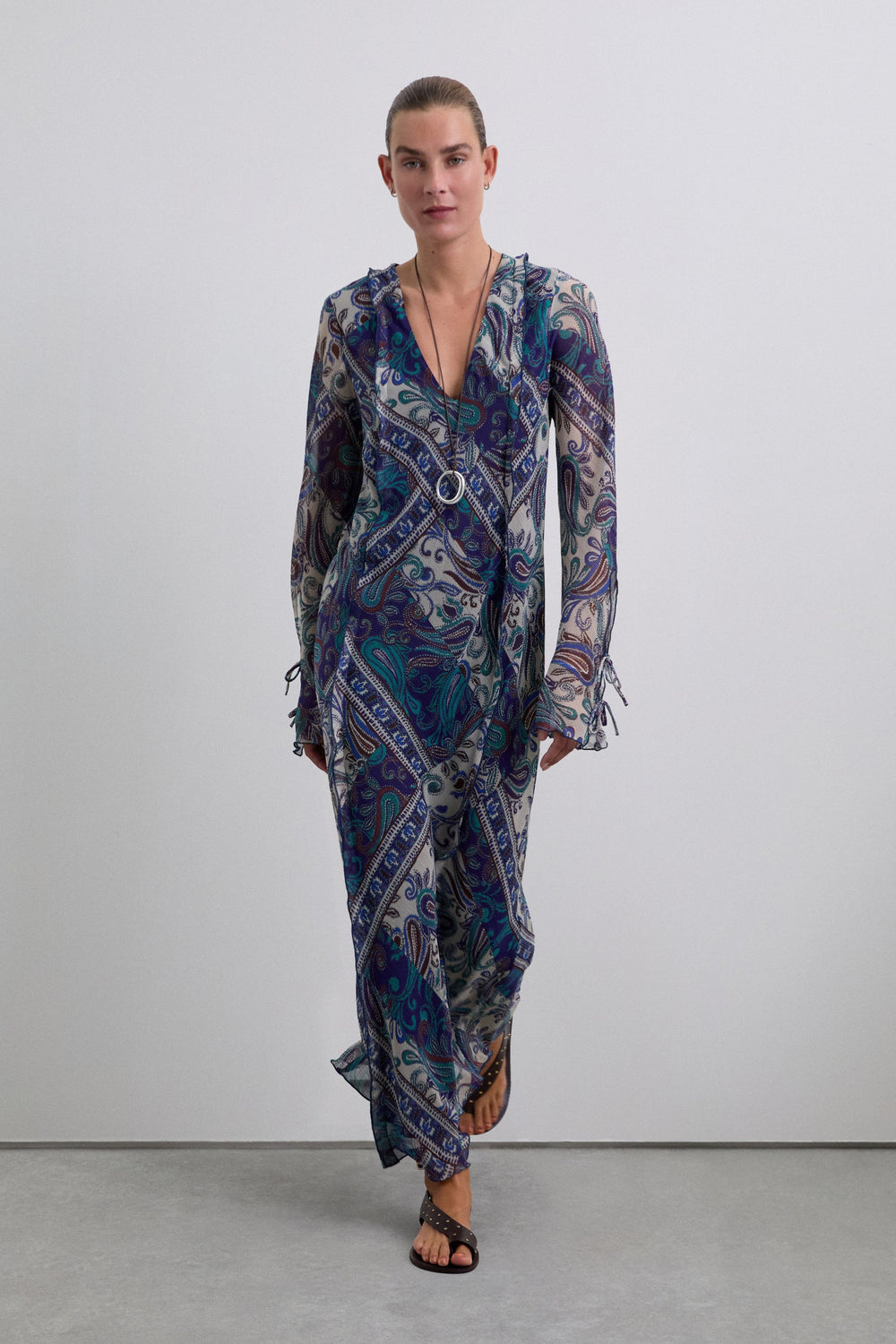 Vestido comprido com padrão paisley confecionado em tecido fluido com fibra metálica. Regular fit, decote em bico. Manga comprida terminada em laço e pormenor de pregas.