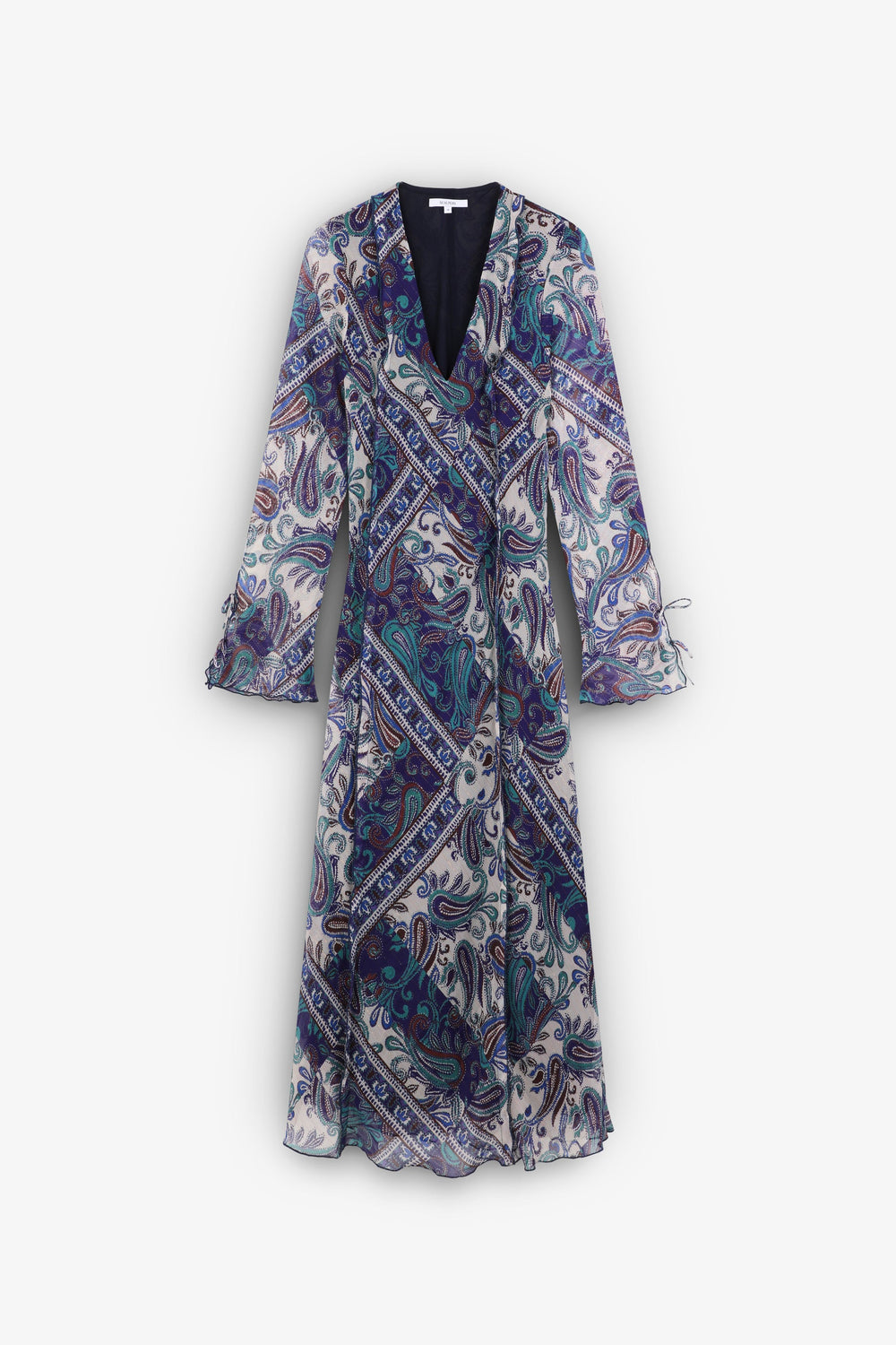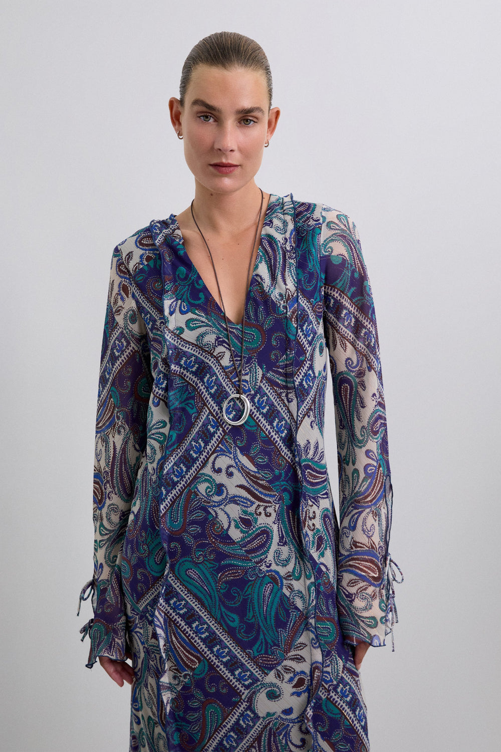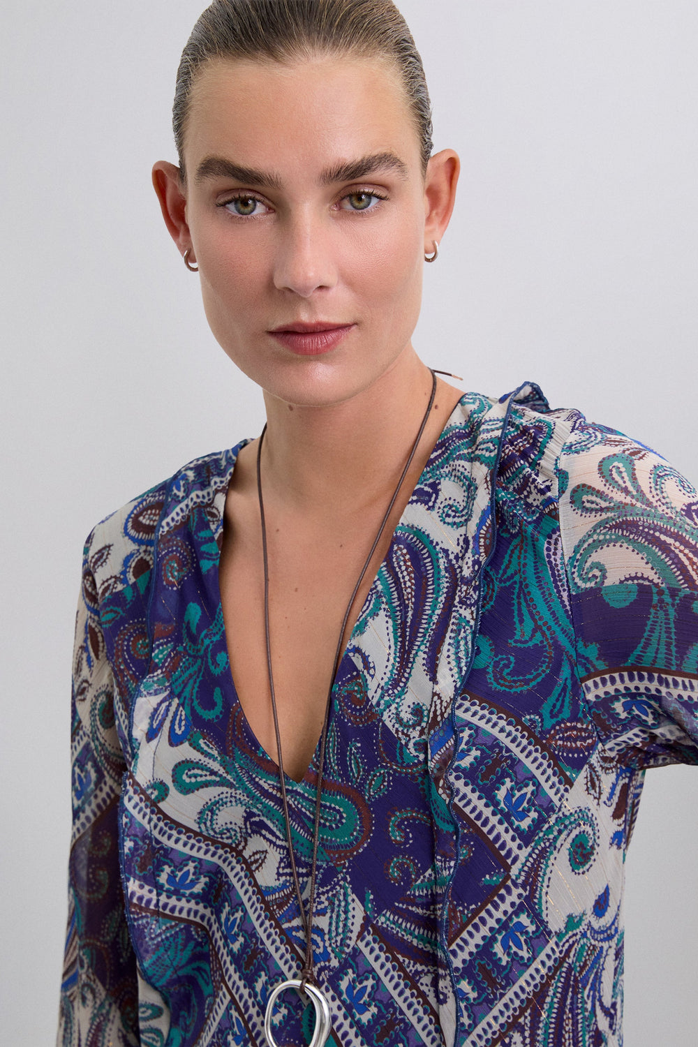 Vestido comprido com padrão paisley confecionado em tecido fluido com fibra metálica. Regular fit, decote em bico. Manga comprida terminada em laço e pormenor de pregas.