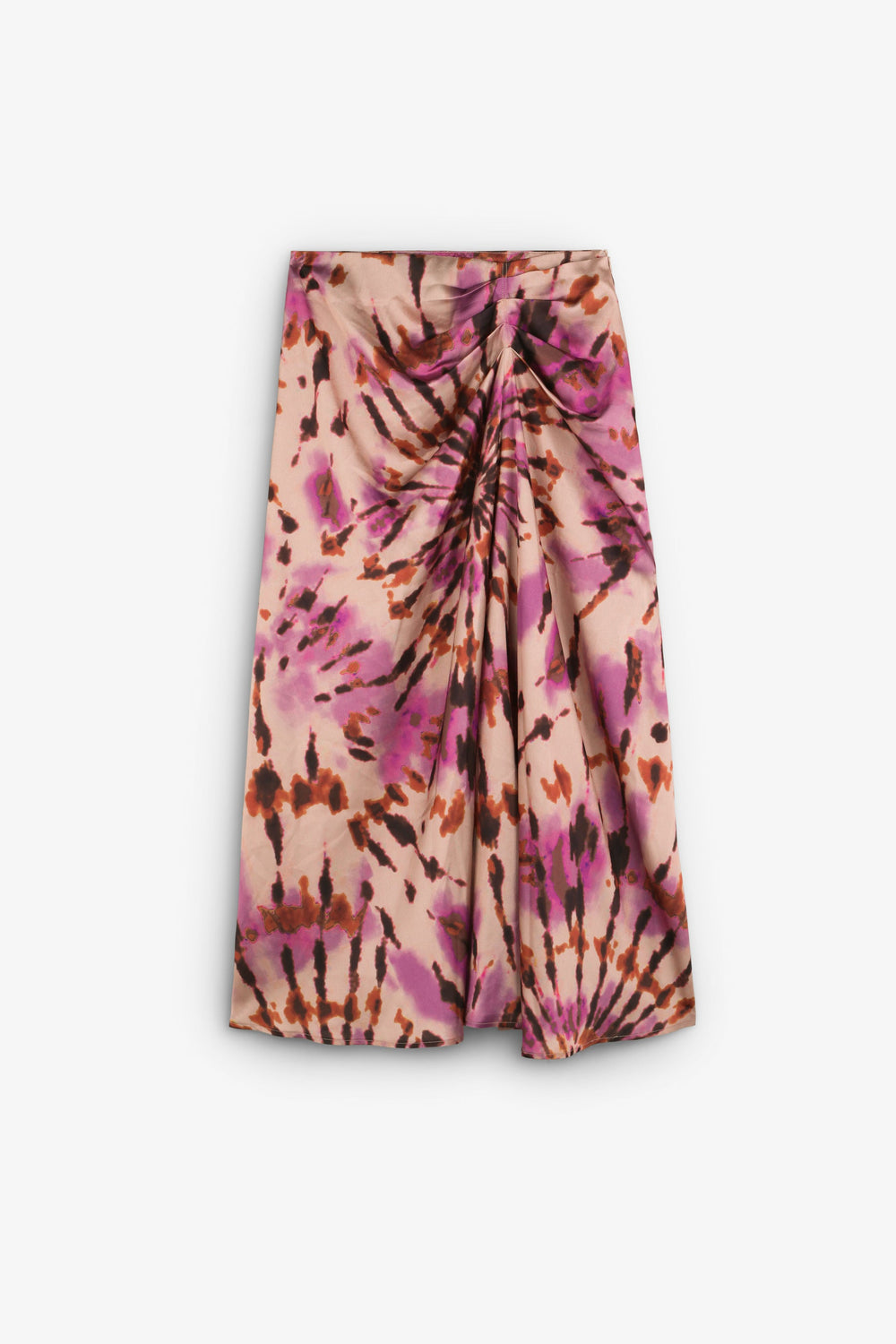 Saia midi com padrão tie-dye confecionada em tecido fluido. Regular fit com frente drapeada e fecho lateral.
