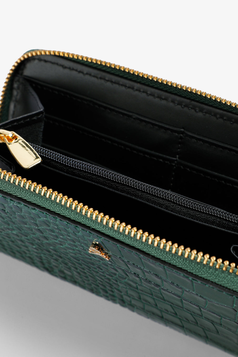 Carteira confecionada em 100% pele com textura estampado animal. Interior com espaço para cartões e bolso com fecho de correr. Fecho de correr e logótipo metalizado à frente.