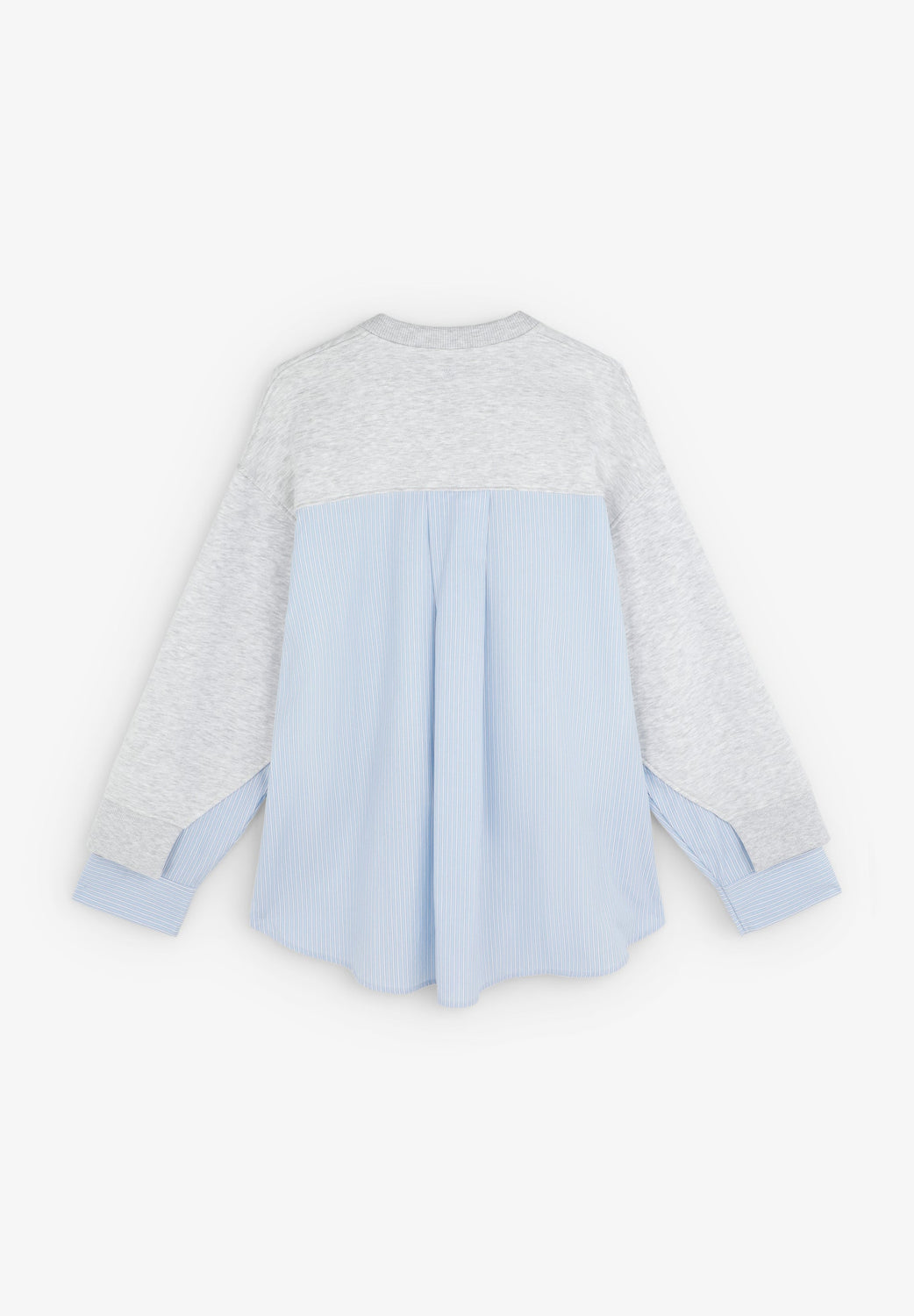 Sweatshirt frontal com parte de trás de camisa às riscas confecionada em mistura de algodão. Corte regular fit, com aberturas laterais e parte de trás ligeiramente mais comprida. Decote redondo com manga comprida com punhos acabados em nervuras e punho de camisa por baixo.