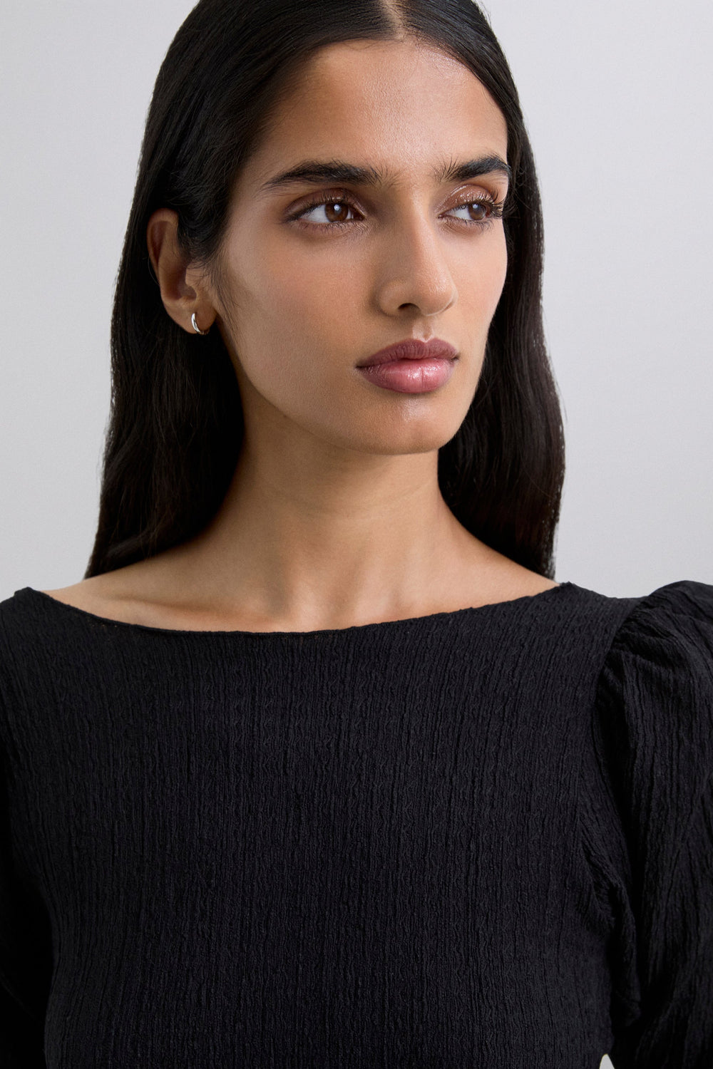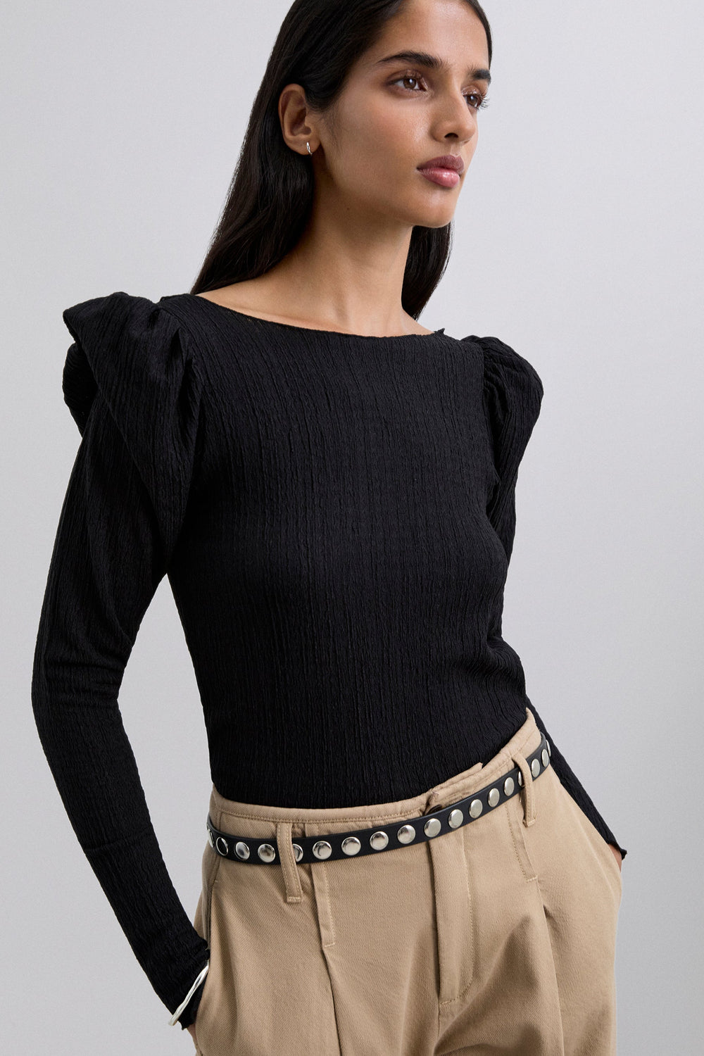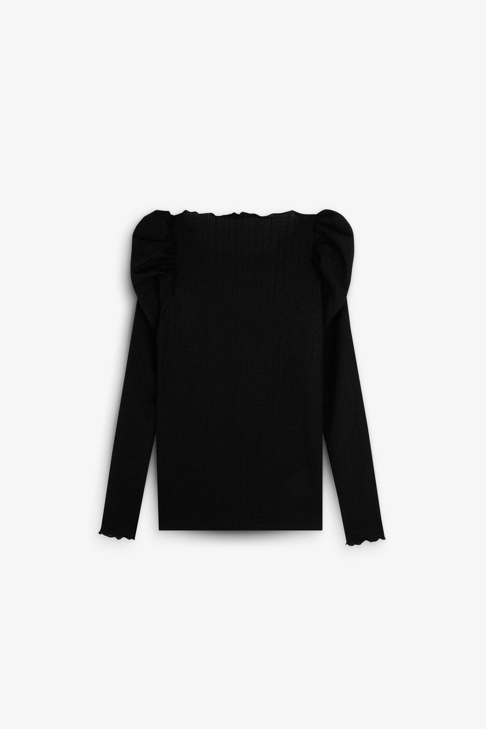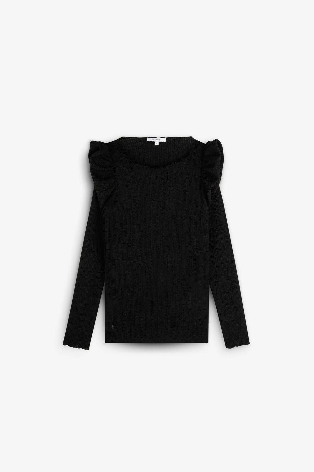 Camiseta confeccionada en tejido con textura ligeramente elástica. Manga larga. Cuello redondo. Volantes en hombros.