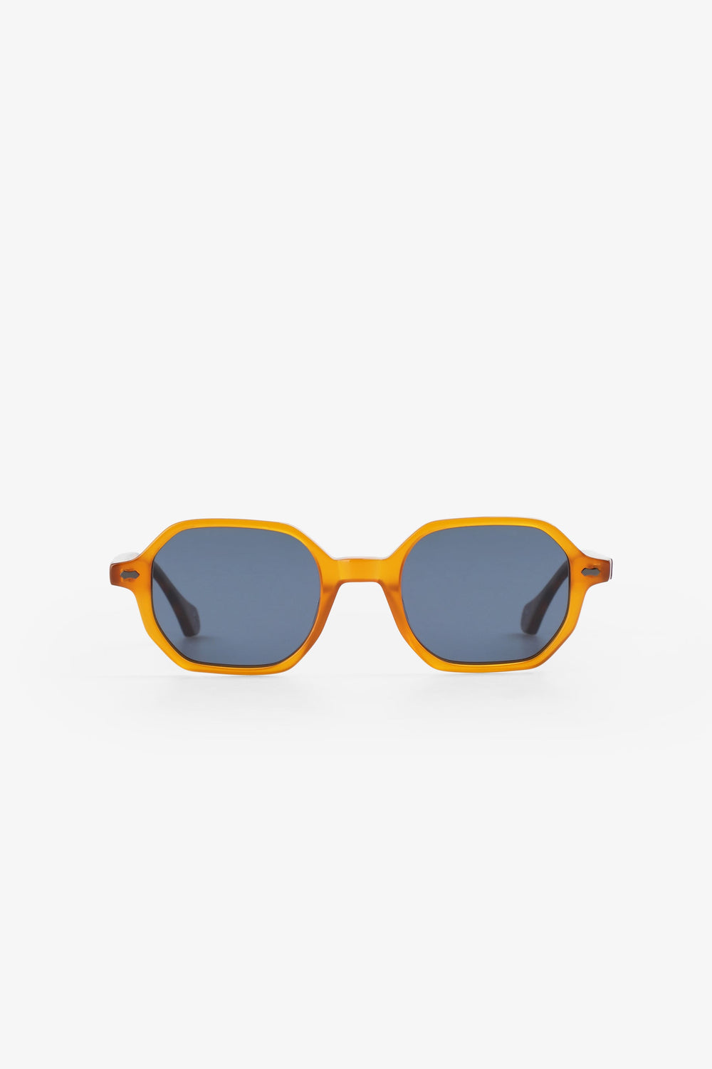 Óculos de sol com armação quadrada e ponte de ferradura. Fabrico em acetato cor mostarda à frente e padrão cinzento na haste. Lentes polarizadas. O logótipo metálico na haste destaca-se.