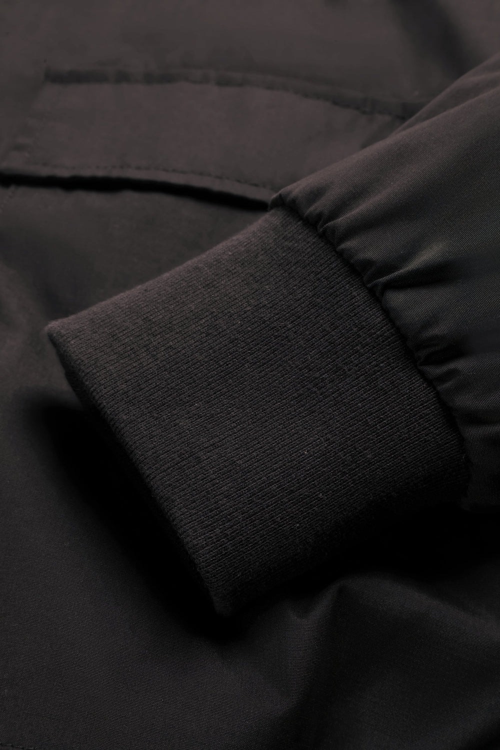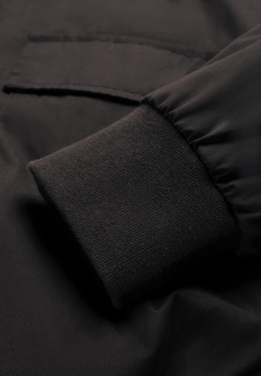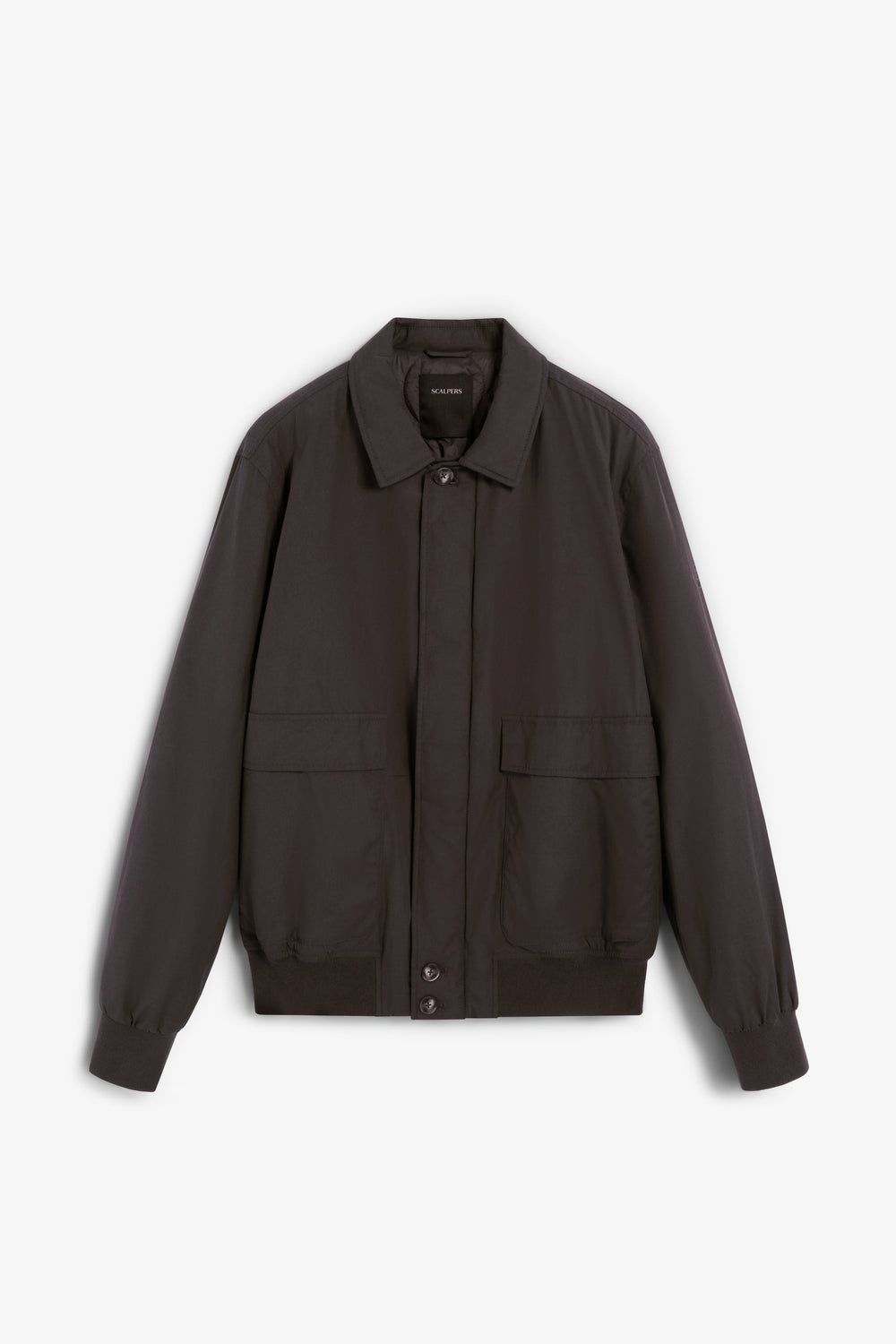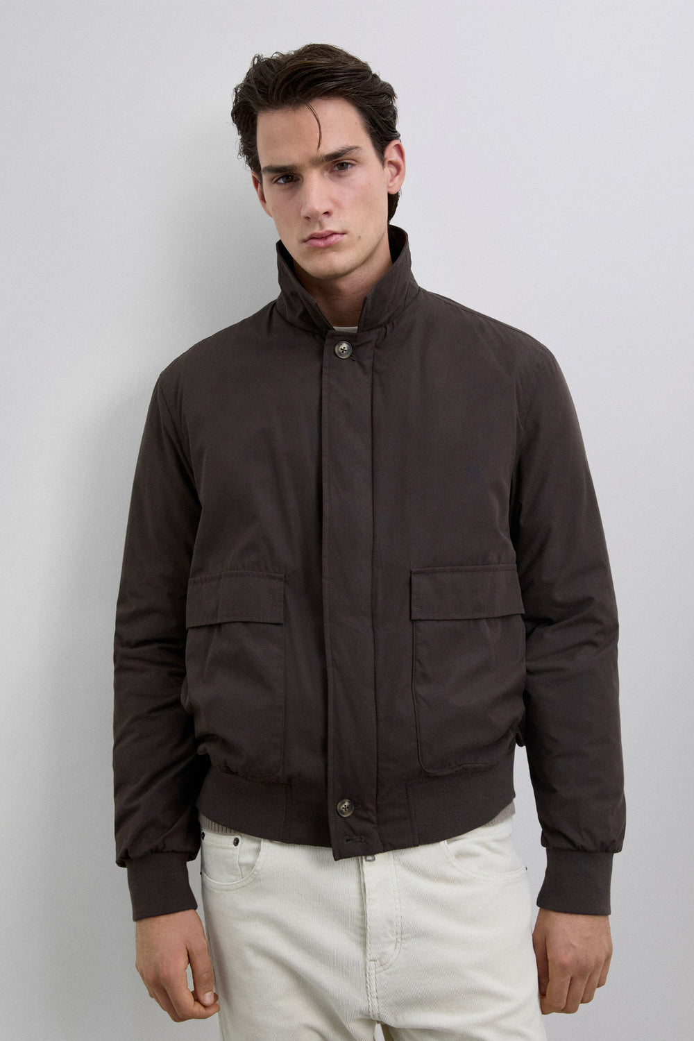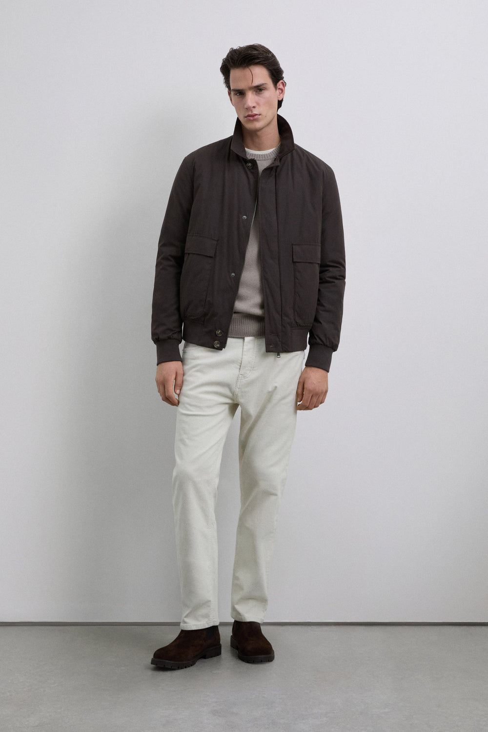 Blusão bomber confecionado em mistura de algodão. Fecho com botão e zip oculto. Bolsos à frente com aba. Bolsos laterais. Forro acolchoado. Bolso escondido interior com zip. Bainha e punhos canelados. Pormenor de logótipo no tom na manga.