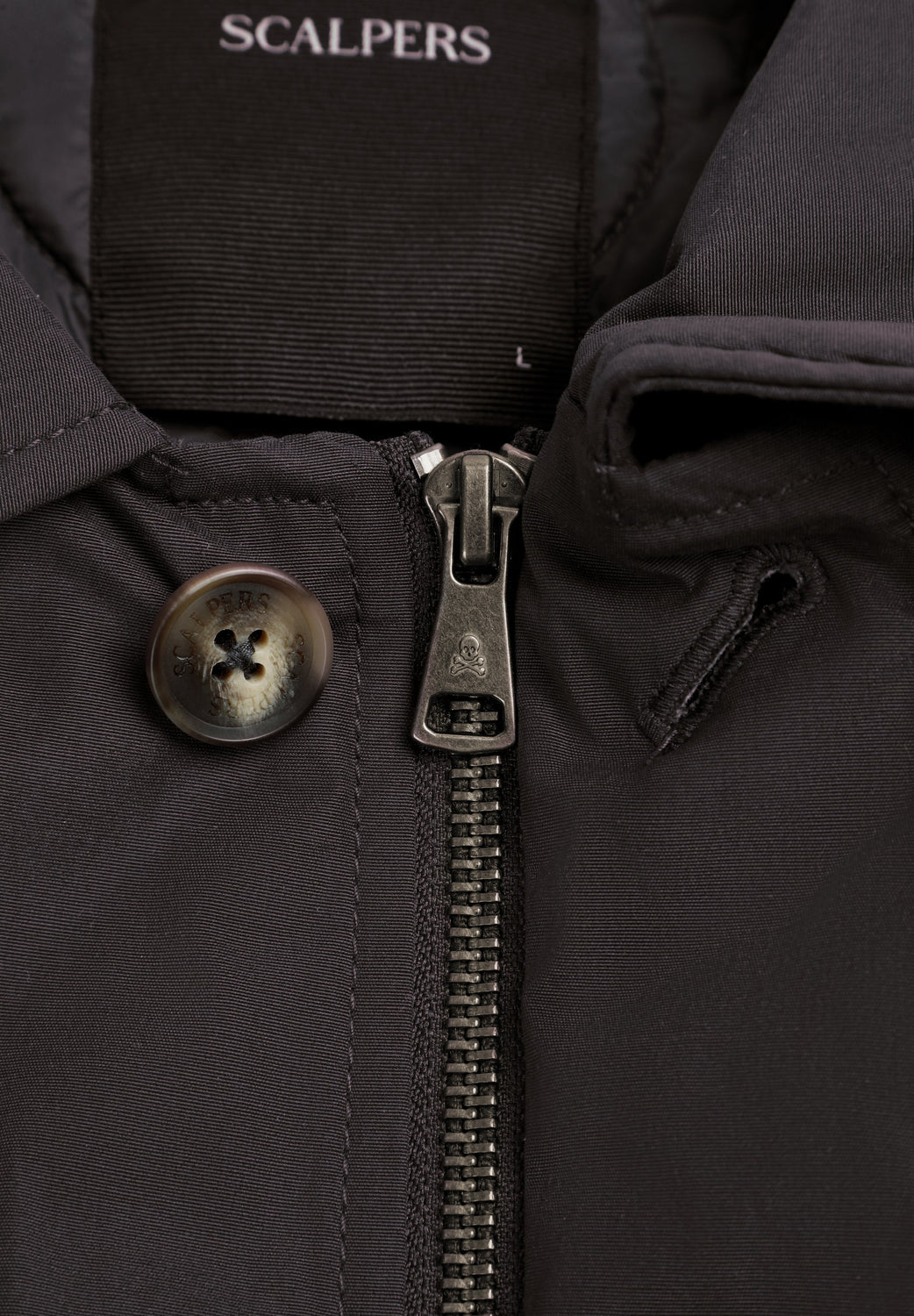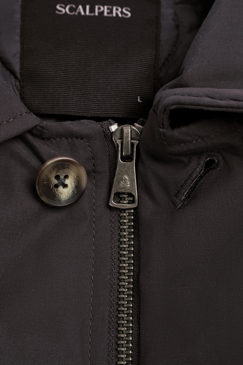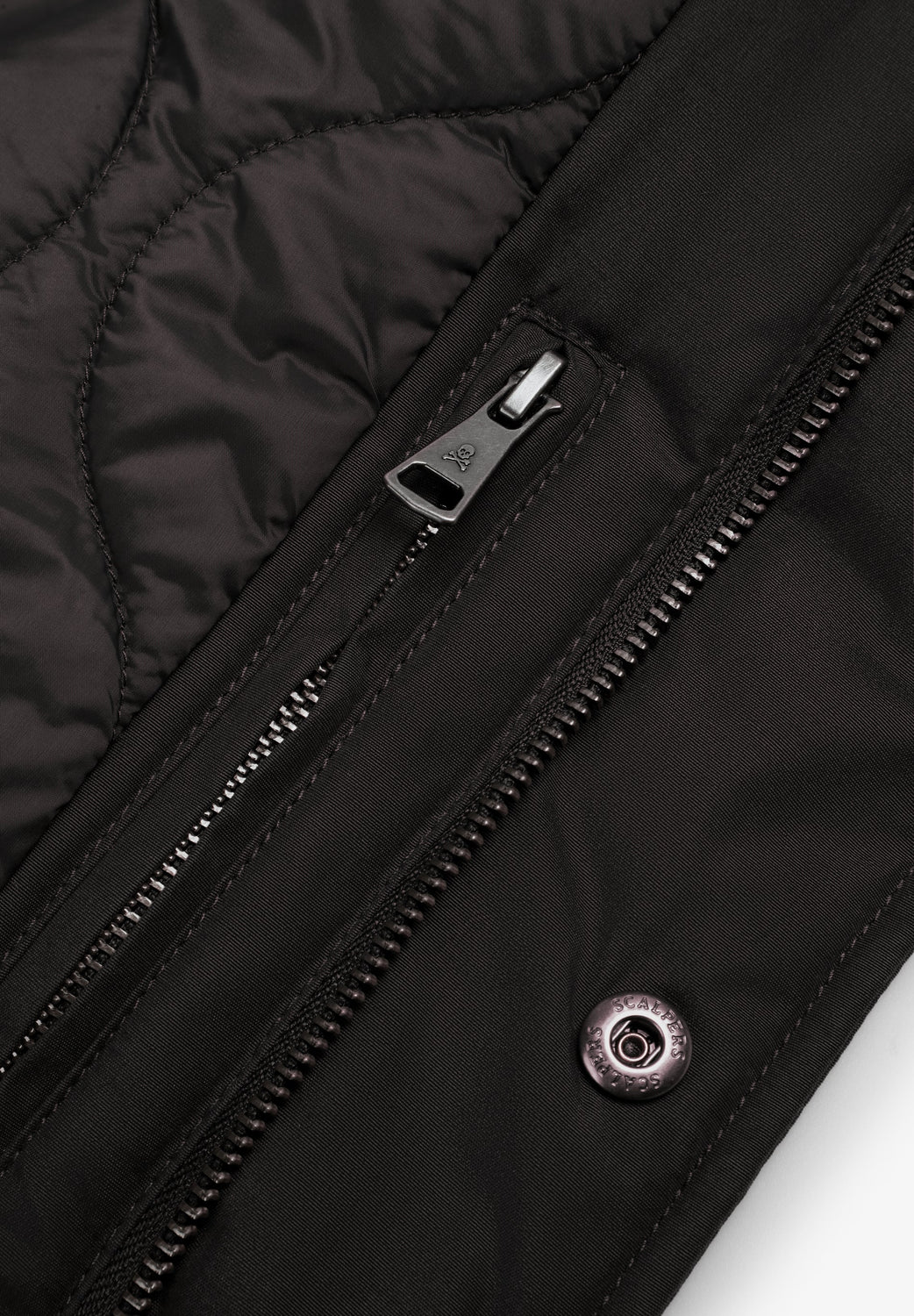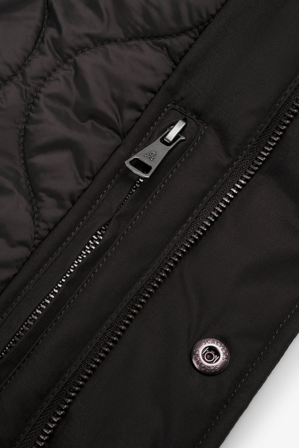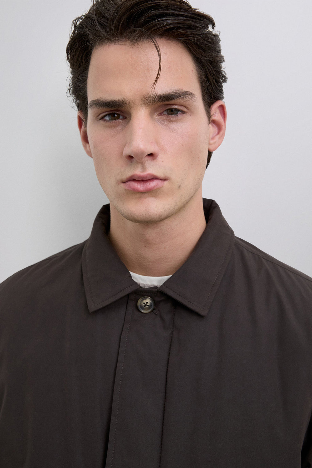 Blusão bomber confecionado em mistura de algodão. Fecho com botão e zip oculto. Bolsos à frente com aba. Bolsos laterais. Forro acolchoado. Bolso escondido interior com zip. Bainha e punhos canelados. Pormenor de logótipo no tom na manga.