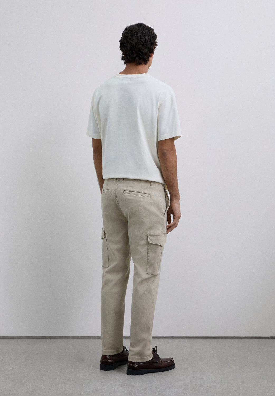 Calças cargo confecionadas em tecido de algodão com elasticidade. Cropped fit. Bolsos frontais e pormenor de bolsos traseiros em linhas vivas. Aplique de bolsos de patch com aba nas perneiras. Fecho de correr e botão à frente.