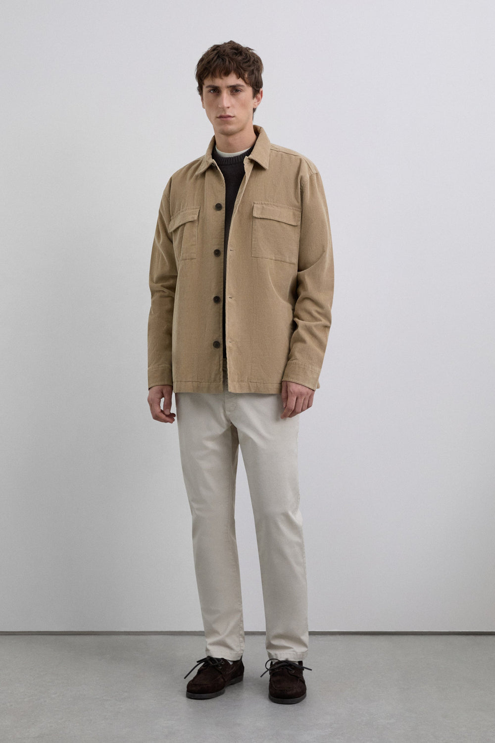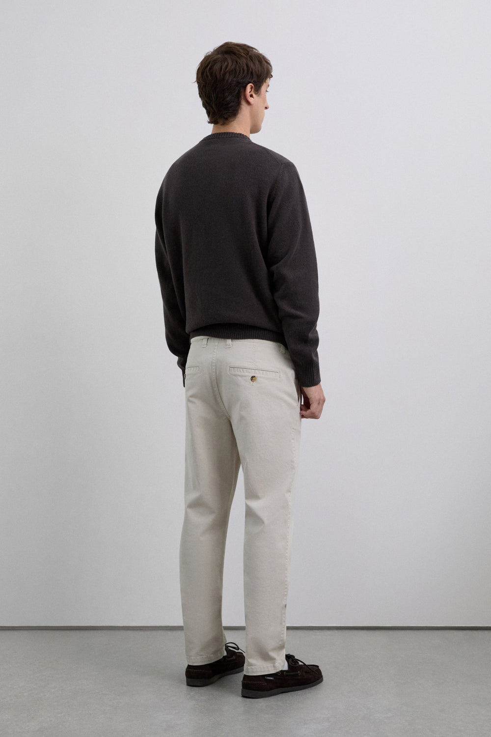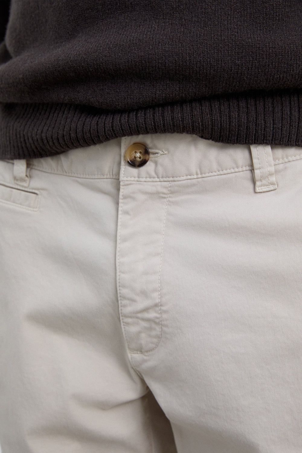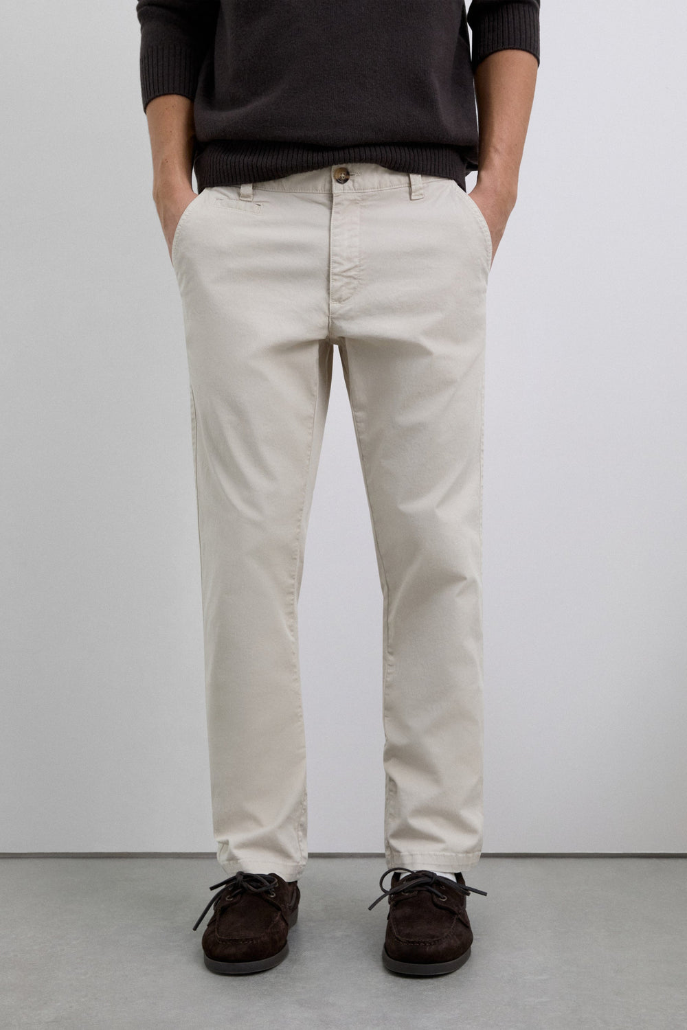 Calças chinos casual confecionadas em mistura de algodão ligeiramente elástico. Fecho com botão e fecho de correr. Bolsos laterais e atrás. Presilhas na cintura. Pormenor de etiqueta interior com logótipo a cintura.