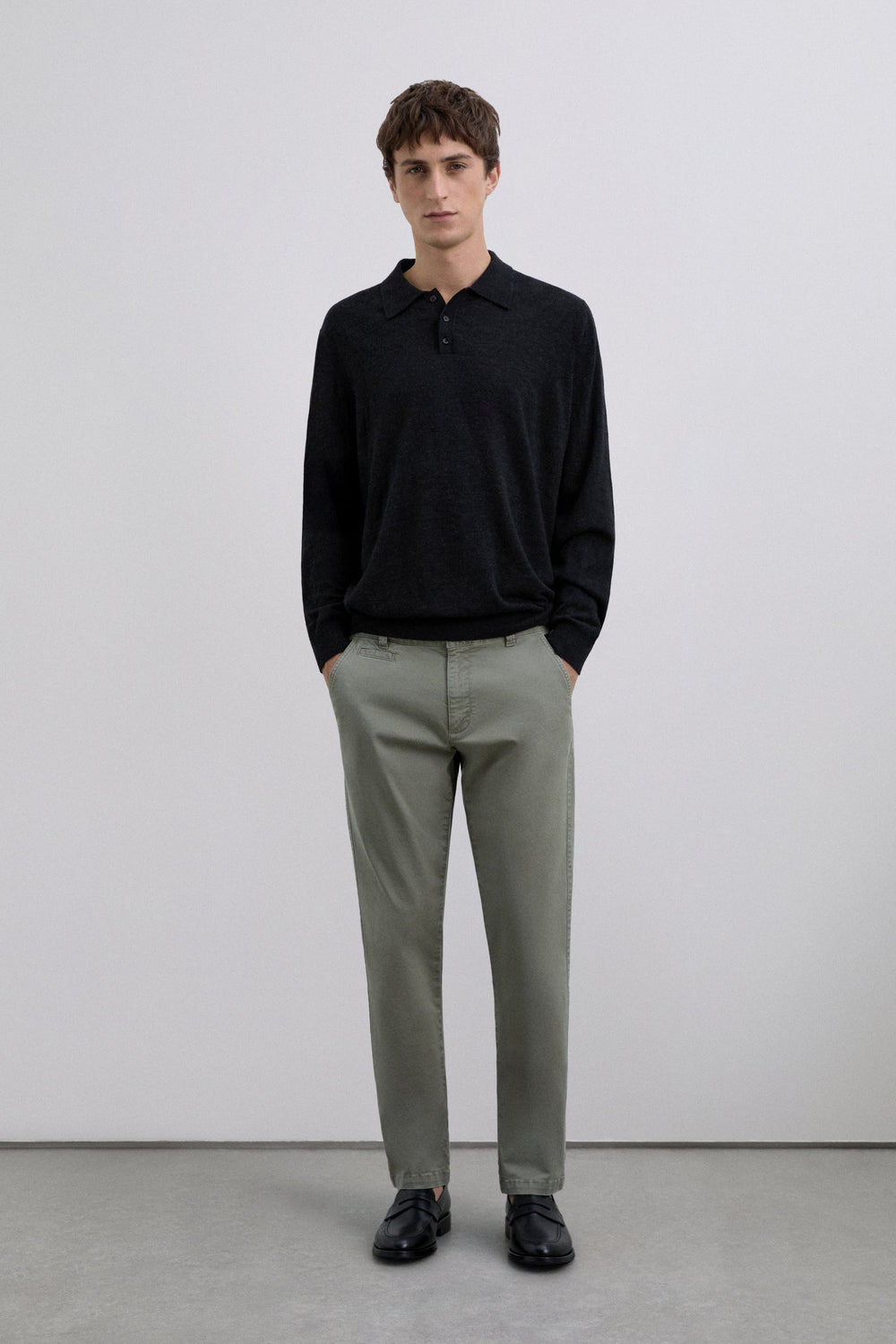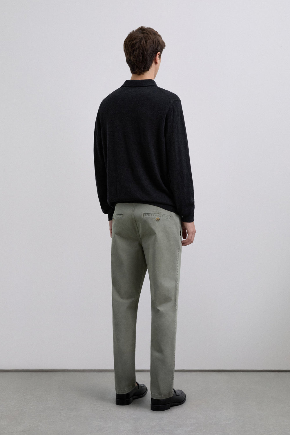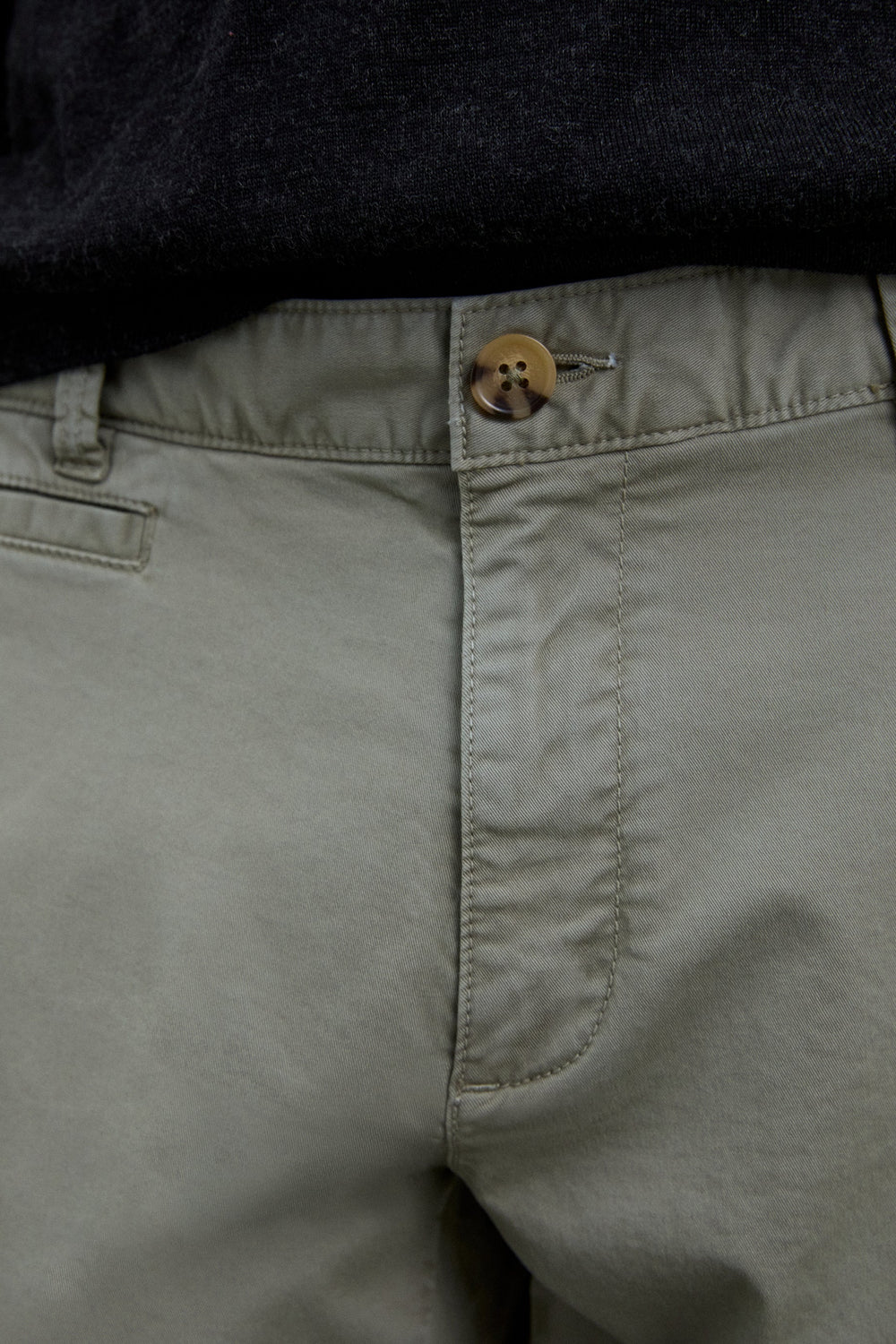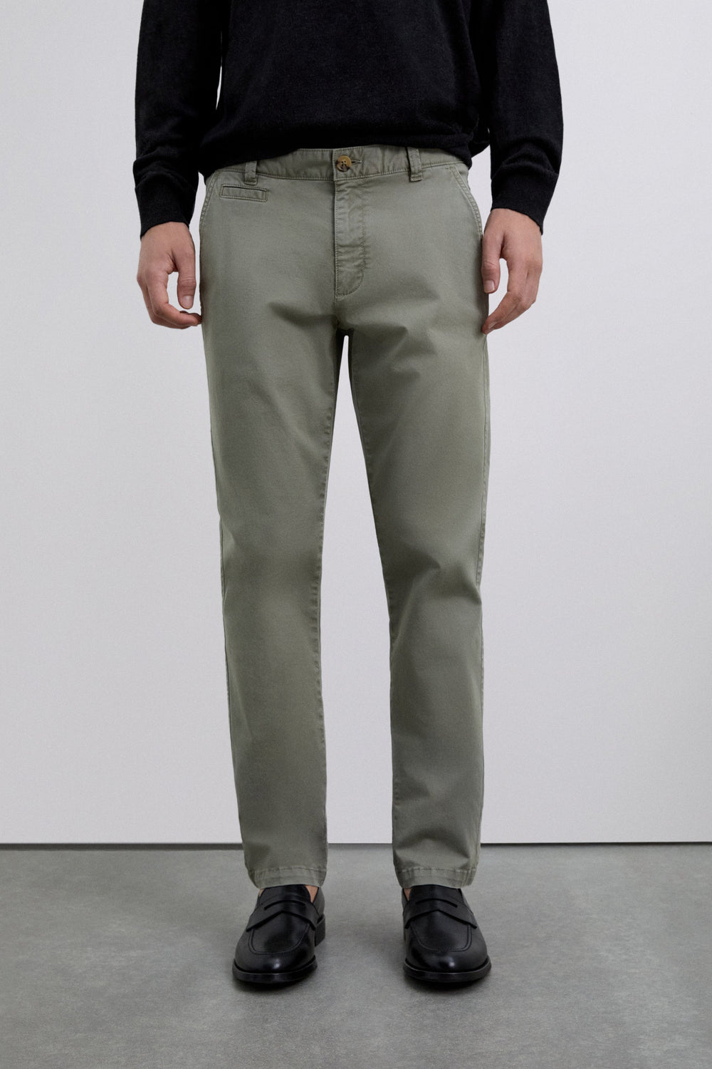 Calças chinos casual confecionadas em mistura de algodão ligeiramente elástico. Fecho com botão e fecho de correr. Bolsos laterais e atrás. Presilhas na cintura. Pormenor de etiqueta interior com logótipo a cintura.