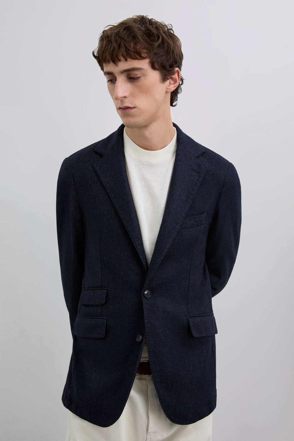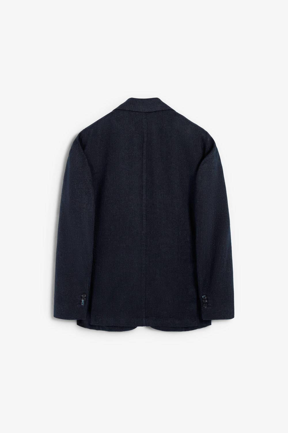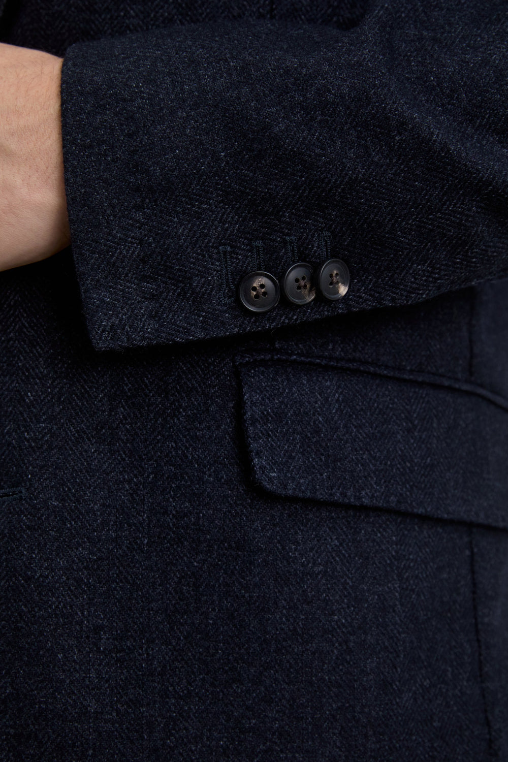 Blazer confecionado em lã. Design em espiga. Três bolsos com aba. Fecho de duplo botão. Bolso no peito com debrum. Manga comprida.