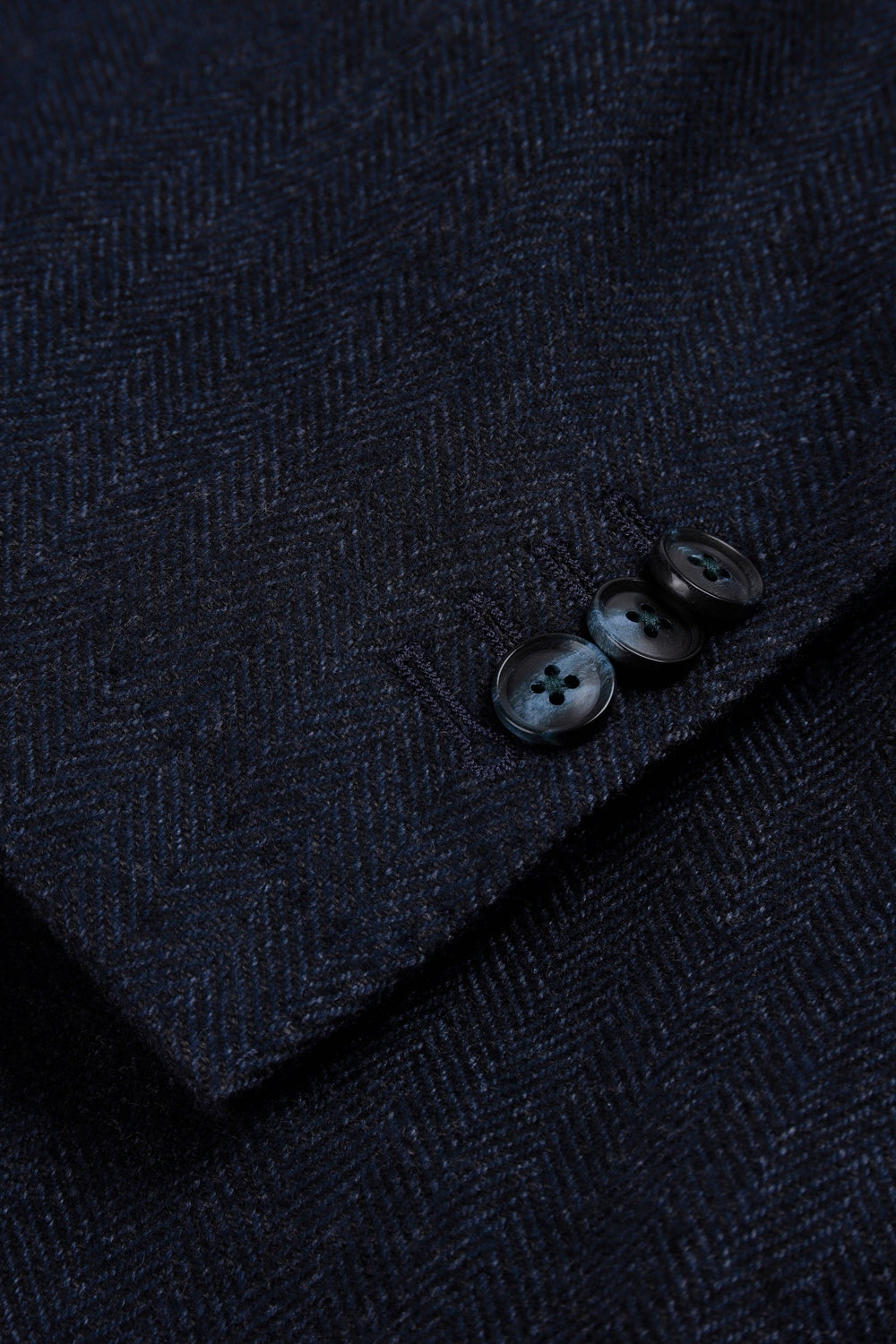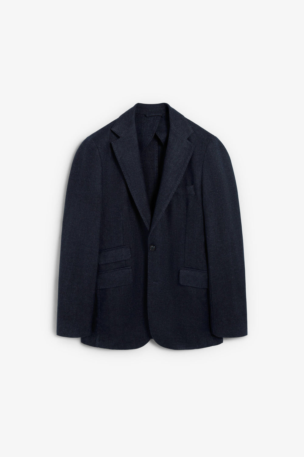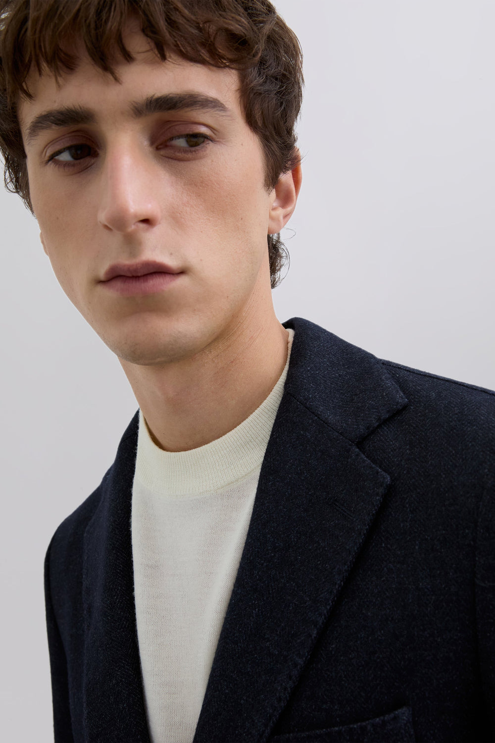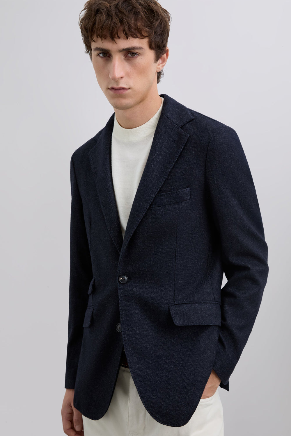 Blazer confecionado em lã. Design em espiga. Três bolsos com aba. Fecho de duplo botão. Bolso no peito com debrum. Manga comprida.