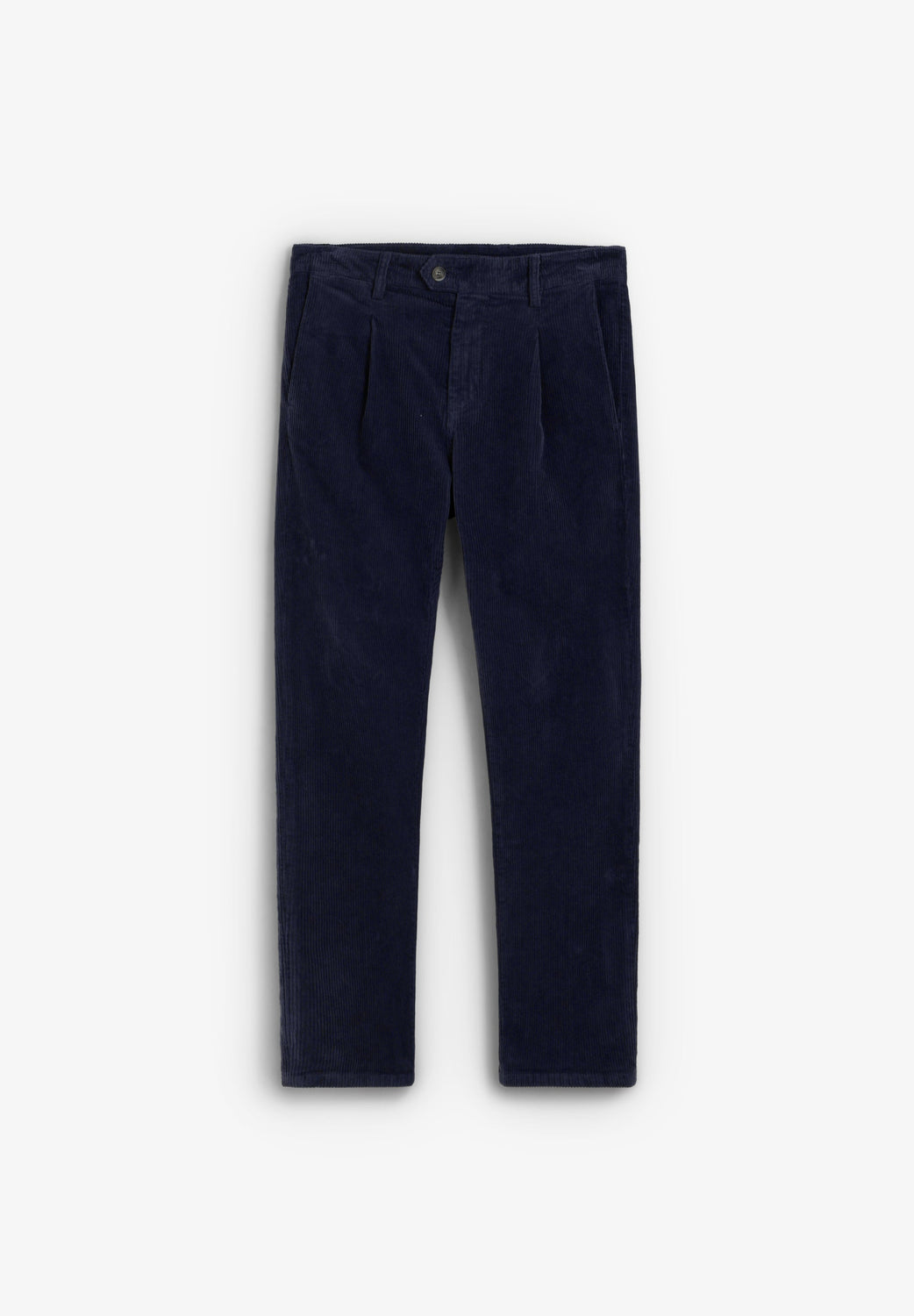 Calças firenze de bombazina. Corte regular. Silhueta a direito. Fecho à frente de botão e fecho de correr. Presilhas para cinto. Bolsos laterais.