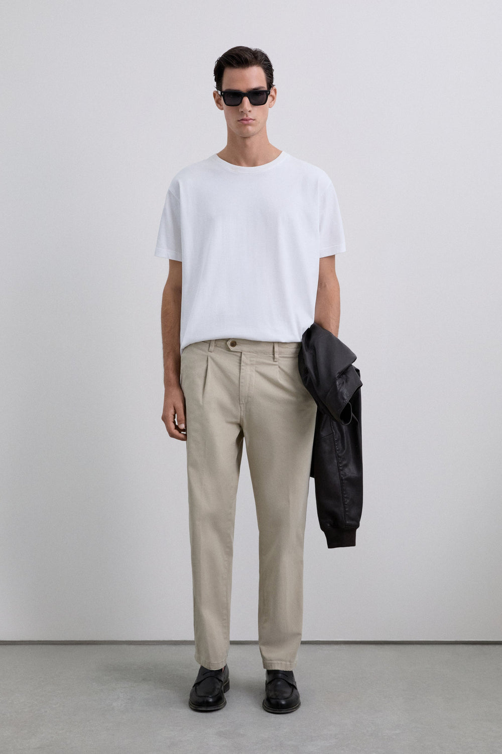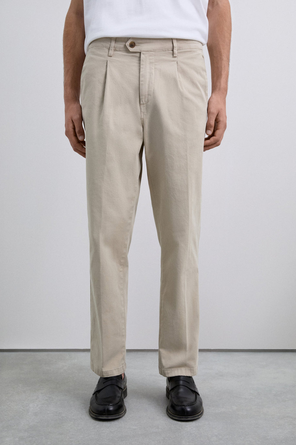 Calças chinos confecionadas em algodão ligeiramente elástico. Corte largo com darts. Fecho com zip oculto com placket e botão na cintura. Bolsos laterais e atrás. Presilhas na cintura.