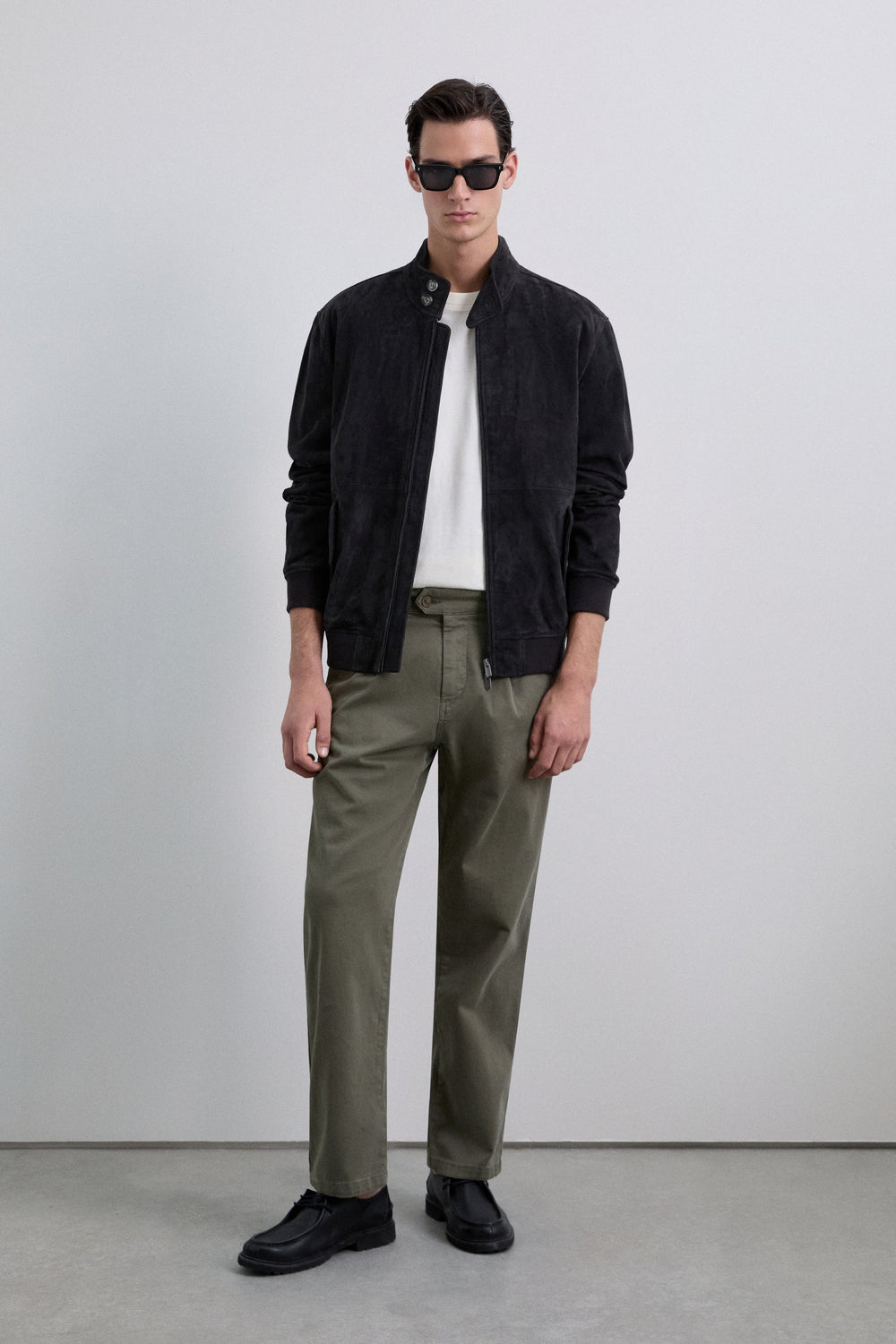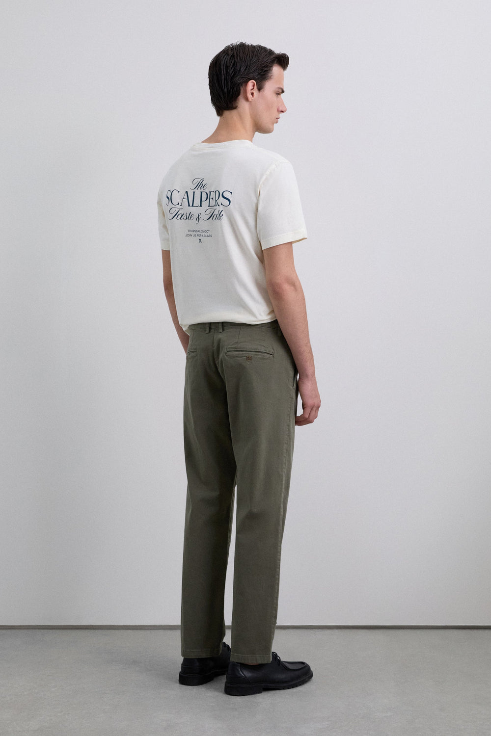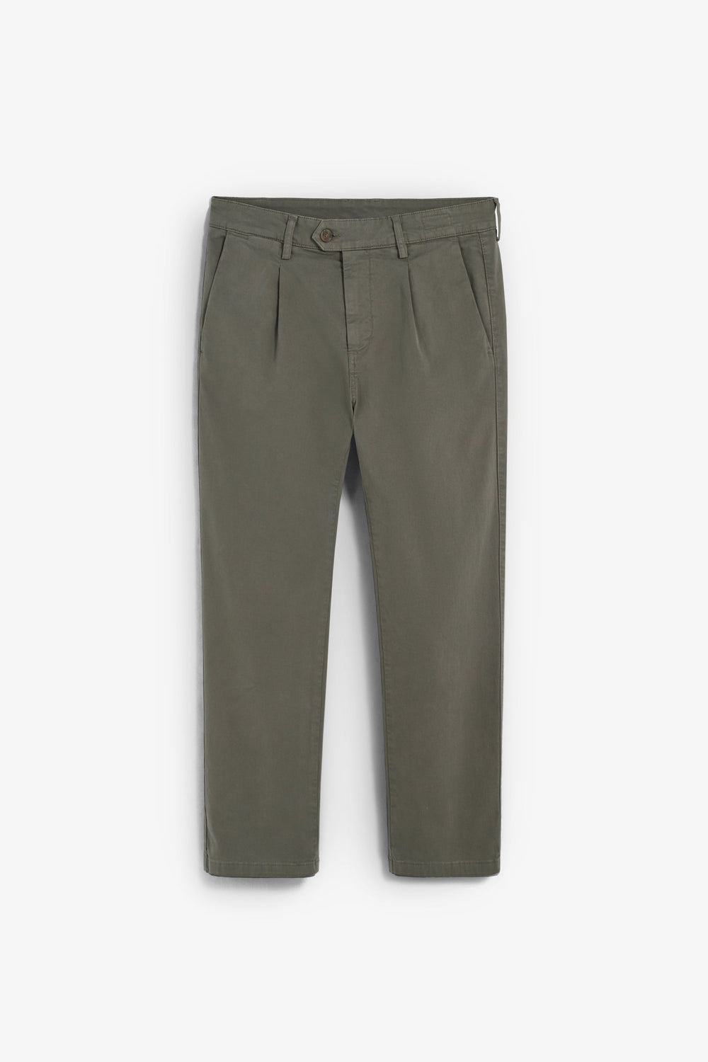 Calças chinos confecionadas em algodão ligeiramente elástico. Corte largo com darts. Fecho com zip oculto com placket e botão na cintura. Bolsos laterais e atrás. Presilhas na cintura.