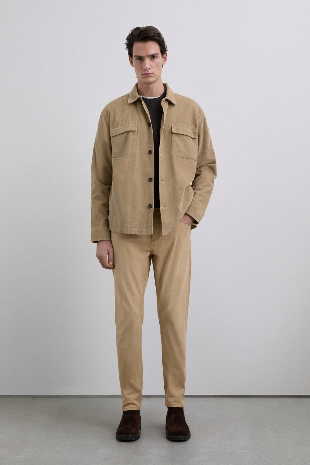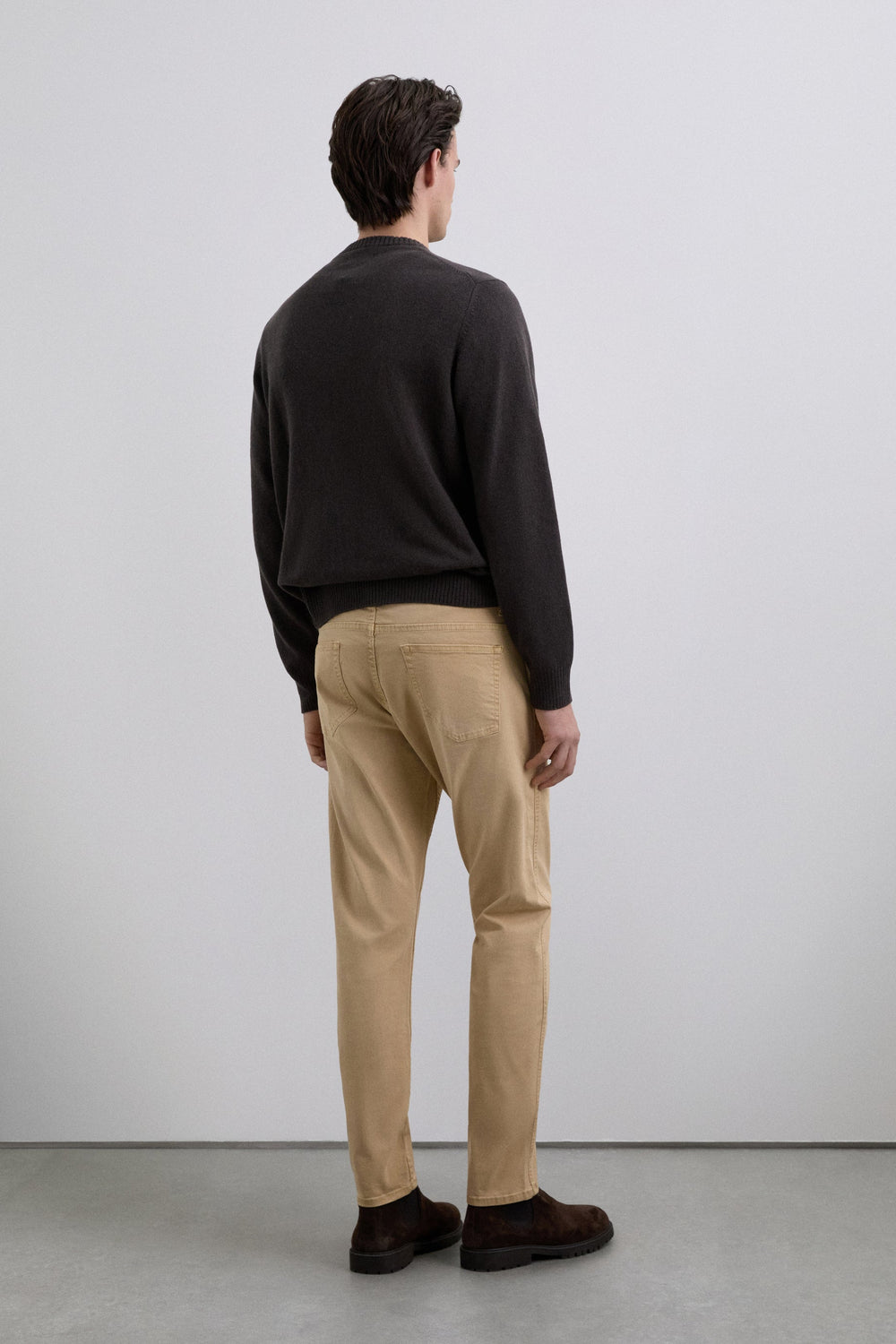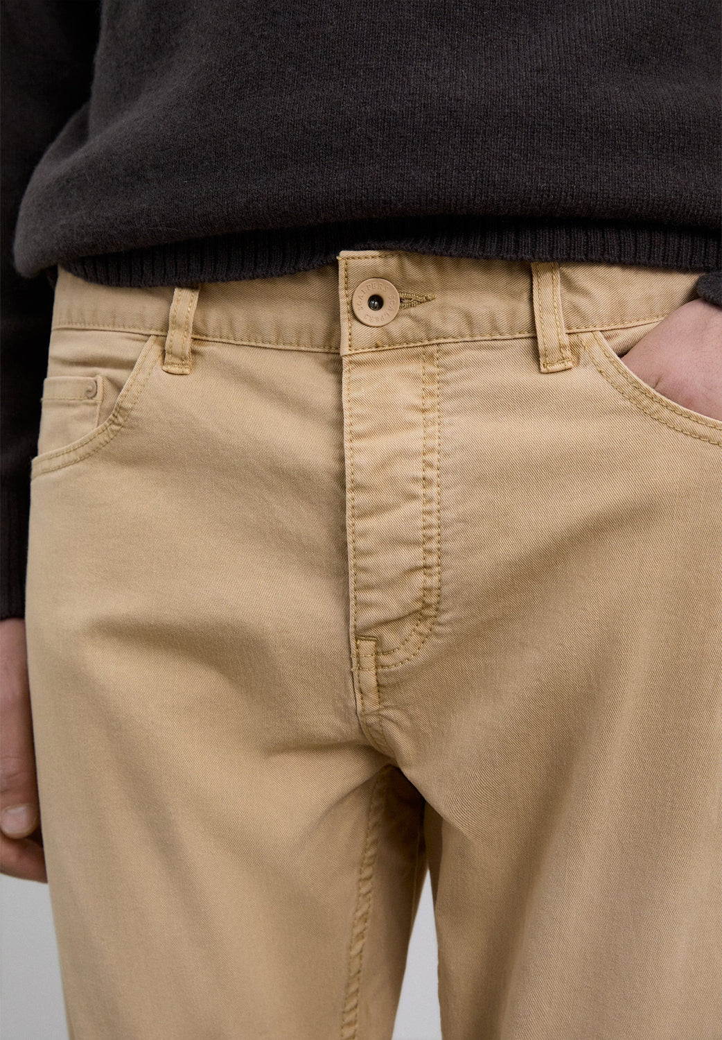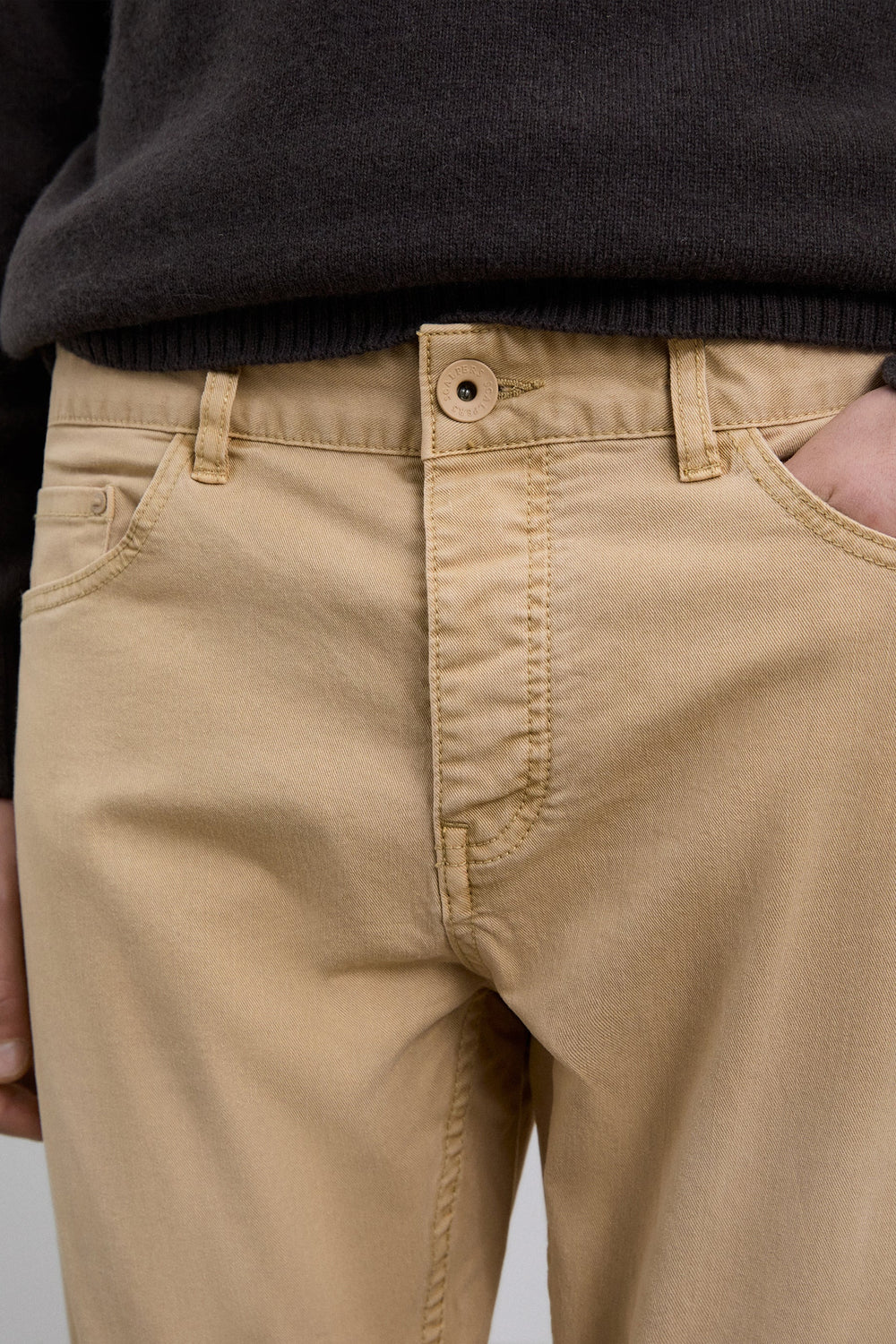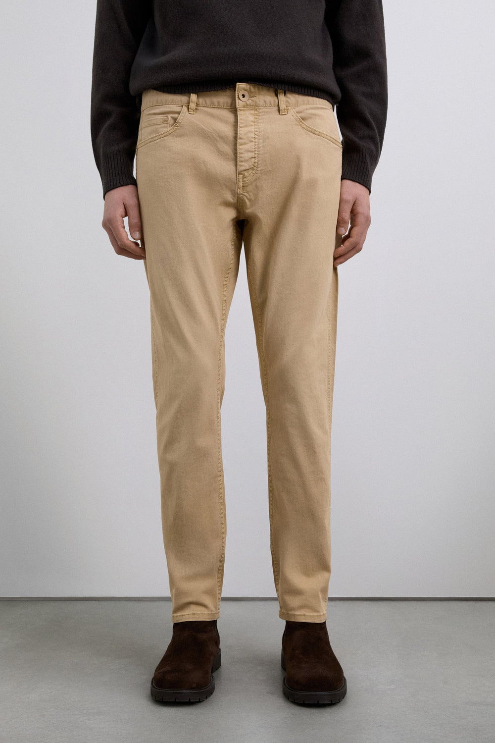 Calças confecionadas em mistura de algodão. Ligeiramente elástico. Fecho com botões. Corte regular. Bolsos atrás e laterais. Com presilhas para o cinto.