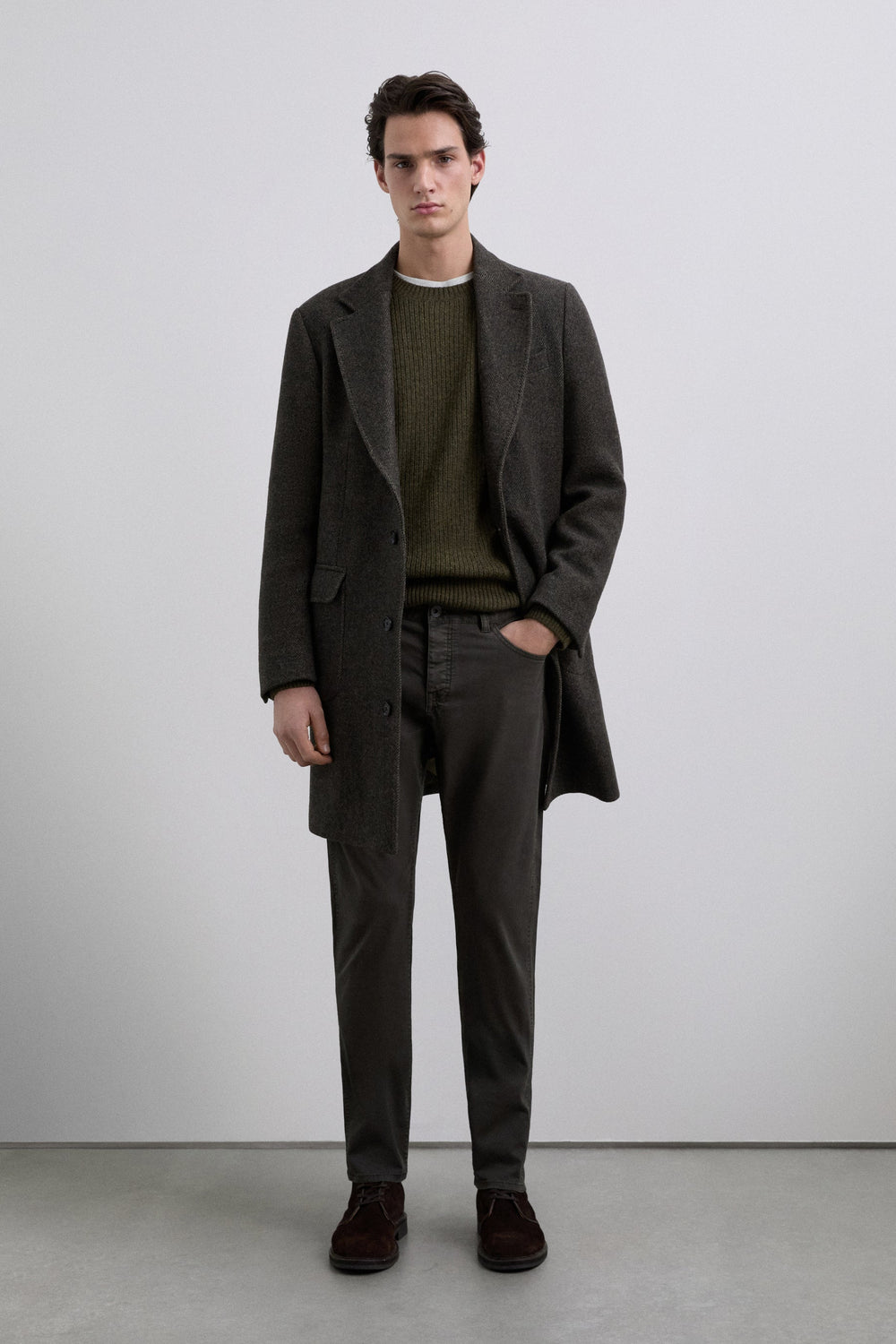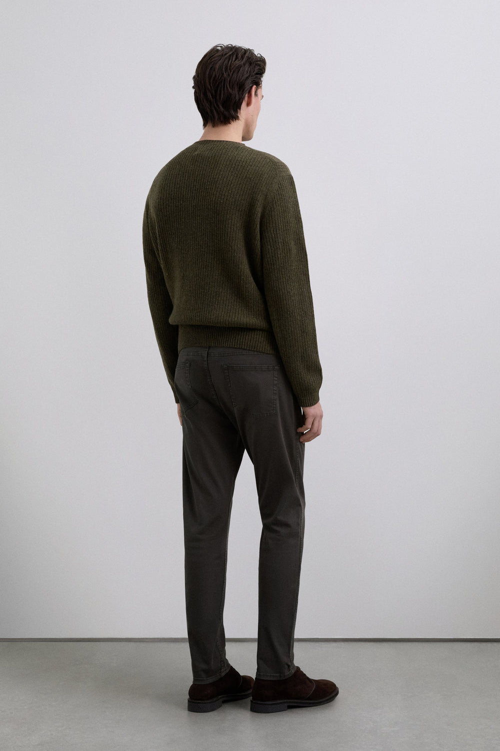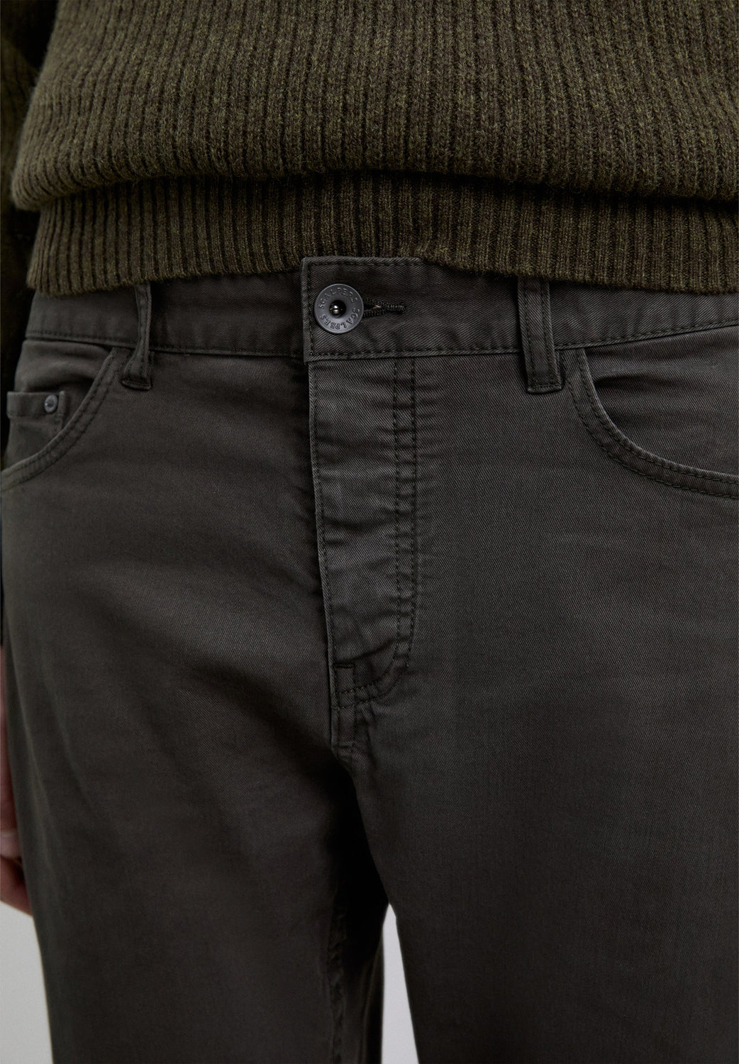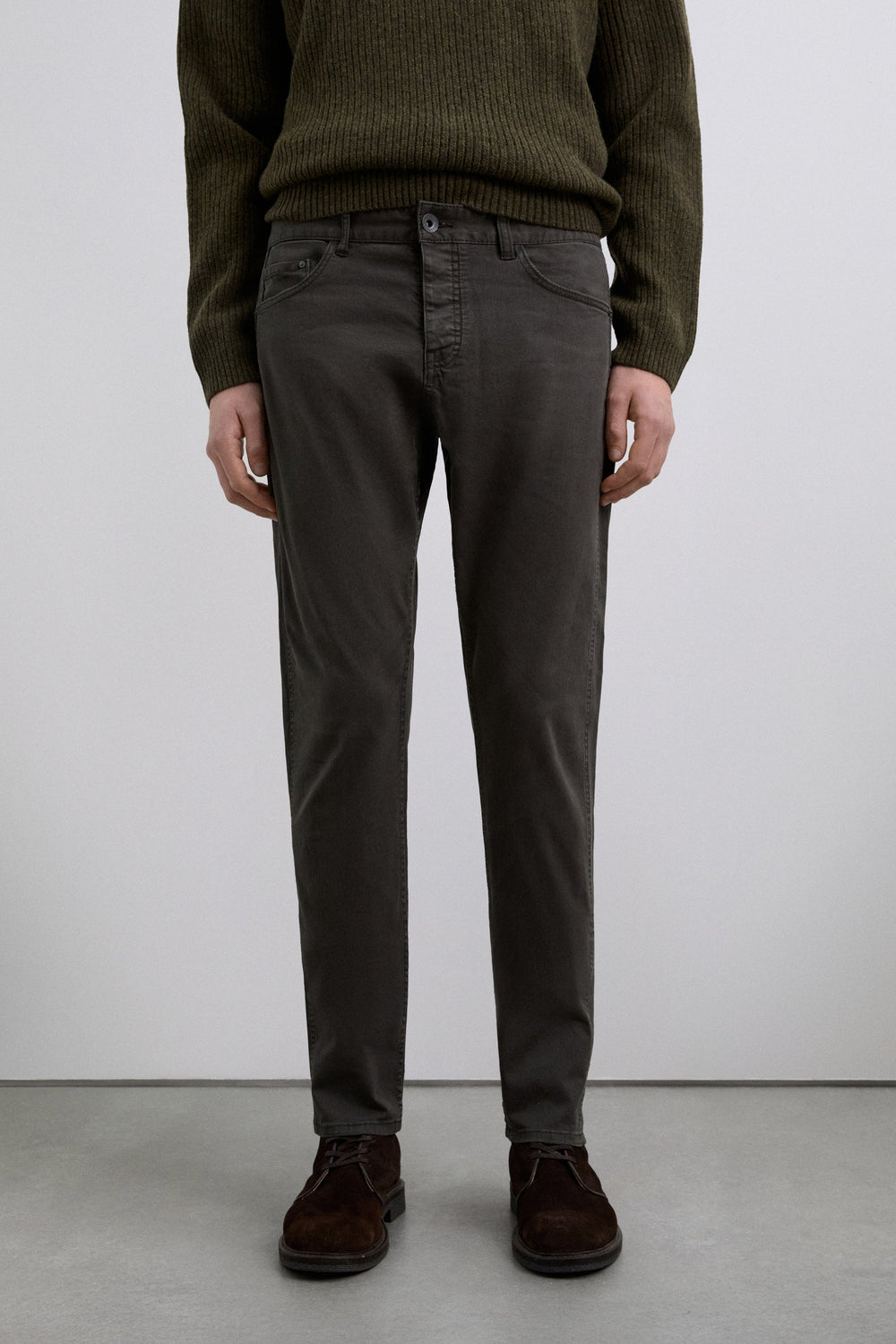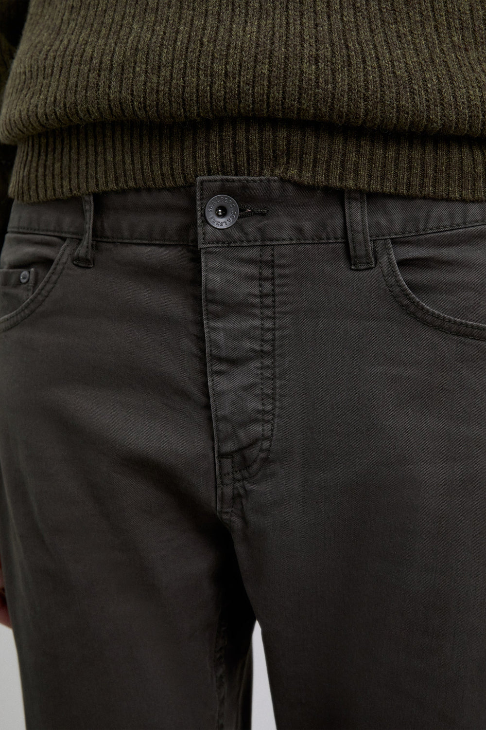 Calças confecionadas em mistura de algodão. Ligeiramente elástico. Fecho com botões. Corte regular. Bolsos atrás e laterais. Com presilhas para o cinto.