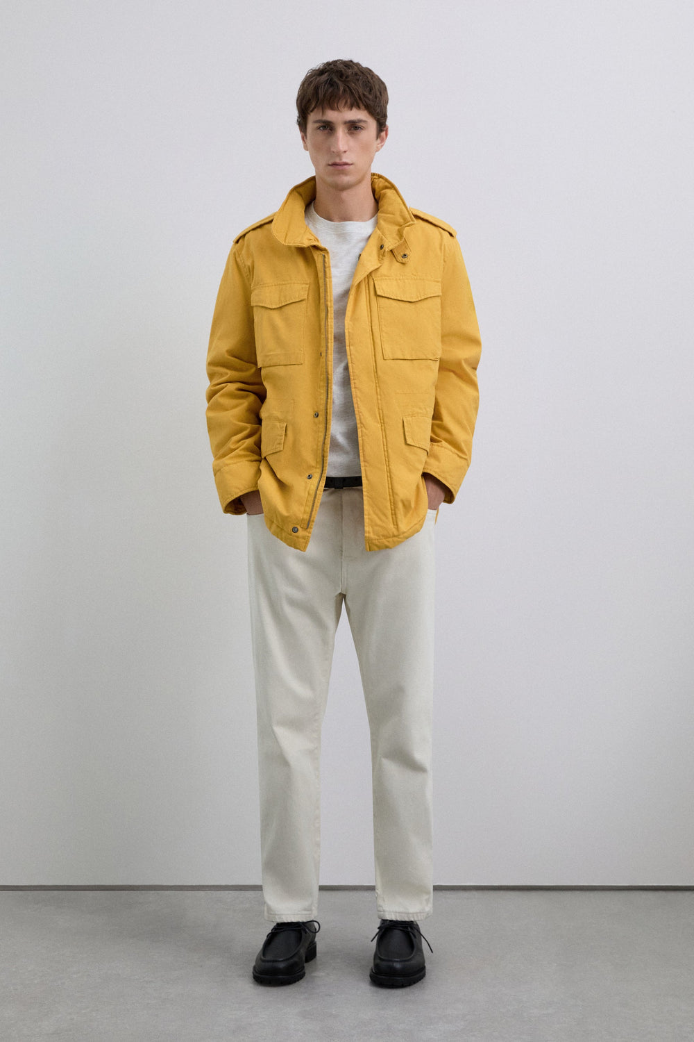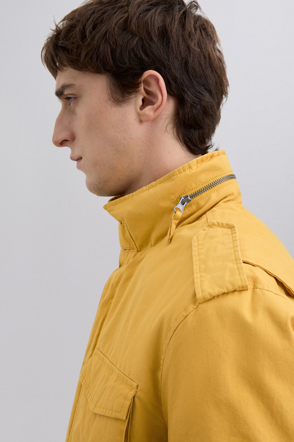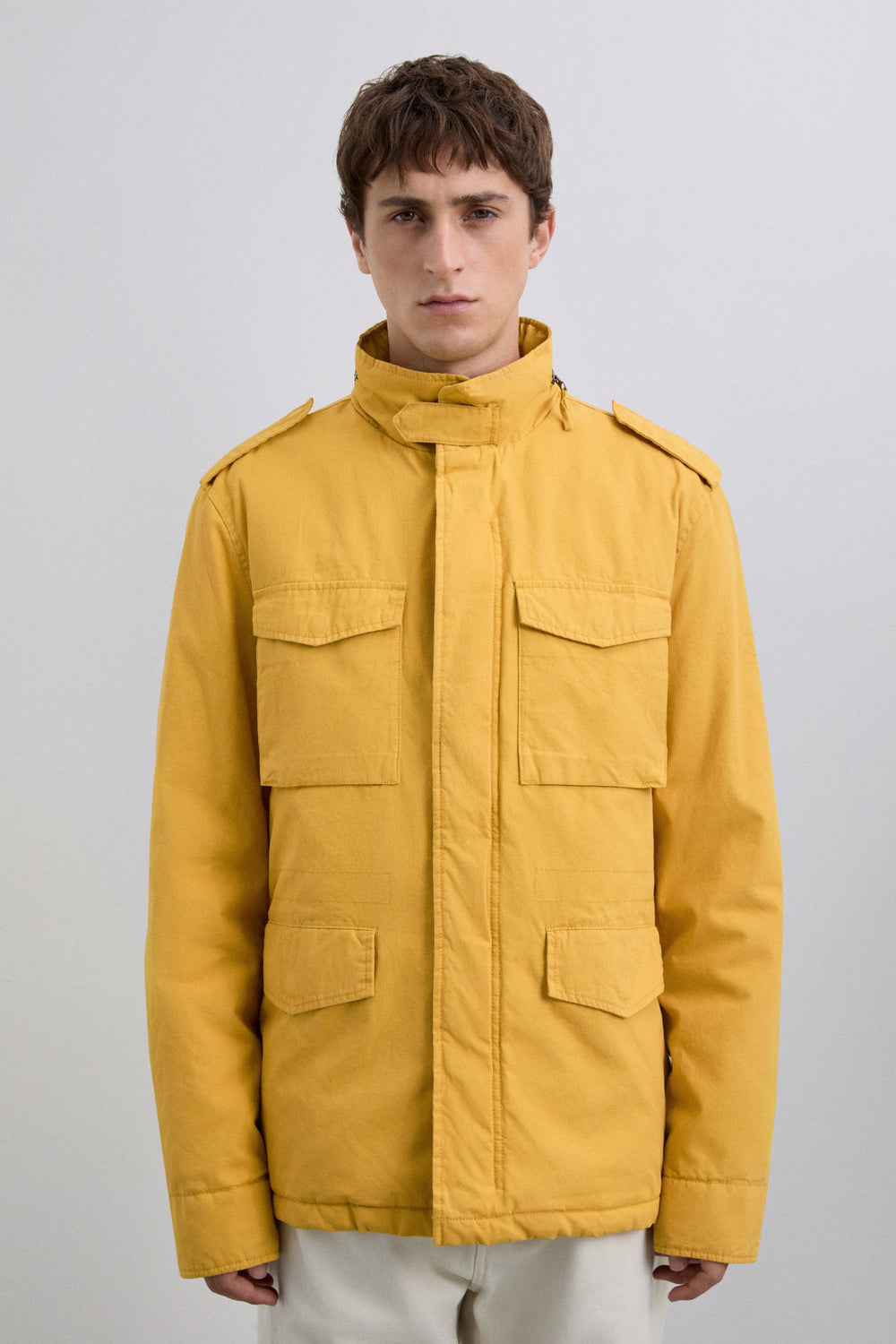 Blusão confecionado em algodão orgânico. Estilo militar. Quatro bolsos à frente. Pormenor de fecho na gola. Cordão interior ajustável. Fecho de correr à frente e capuz em contraste oculto na gola. Interior forrado com padrão textura diamante. Punhos ajustáveis. Pormenor de logótipo alta densidade na manga.