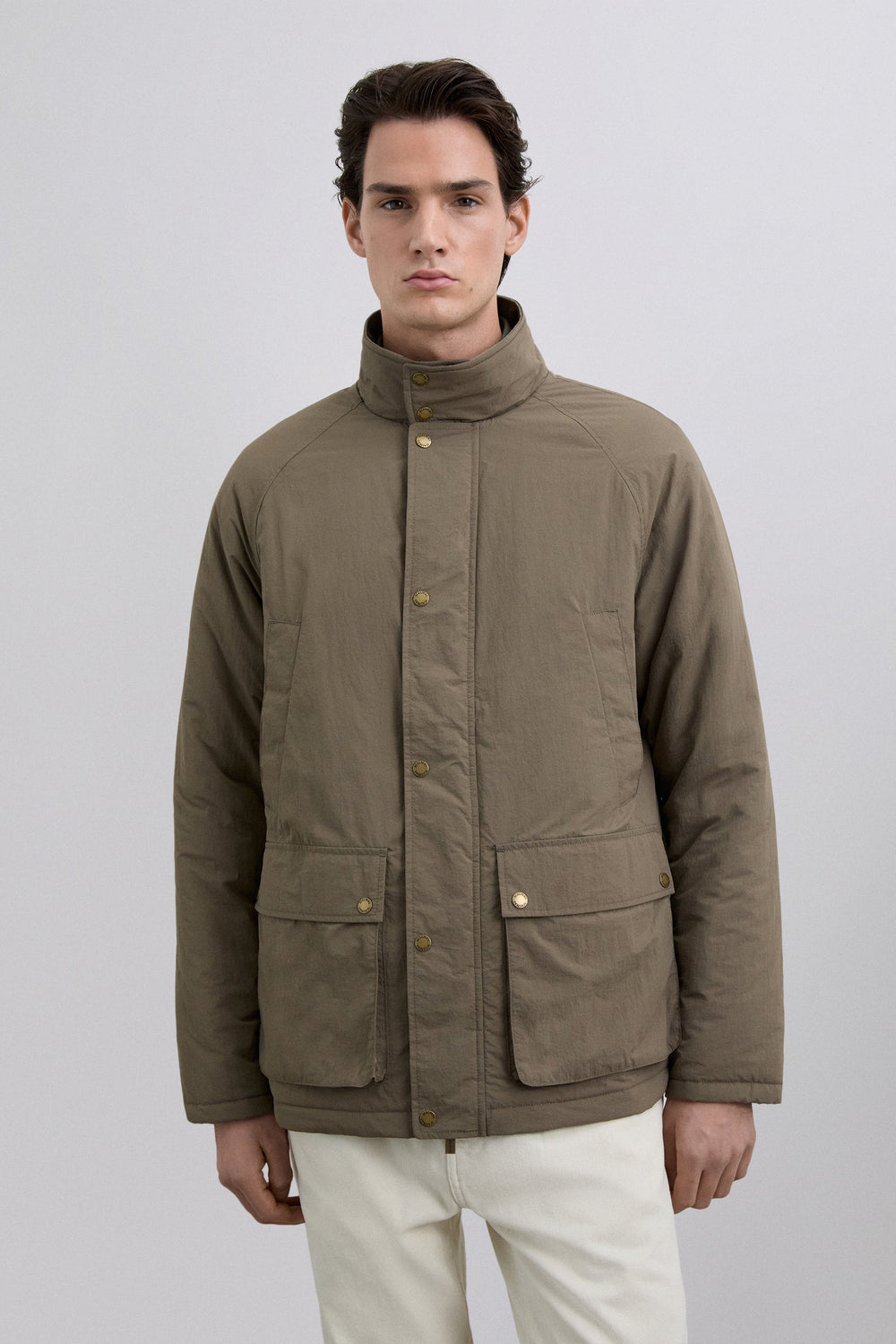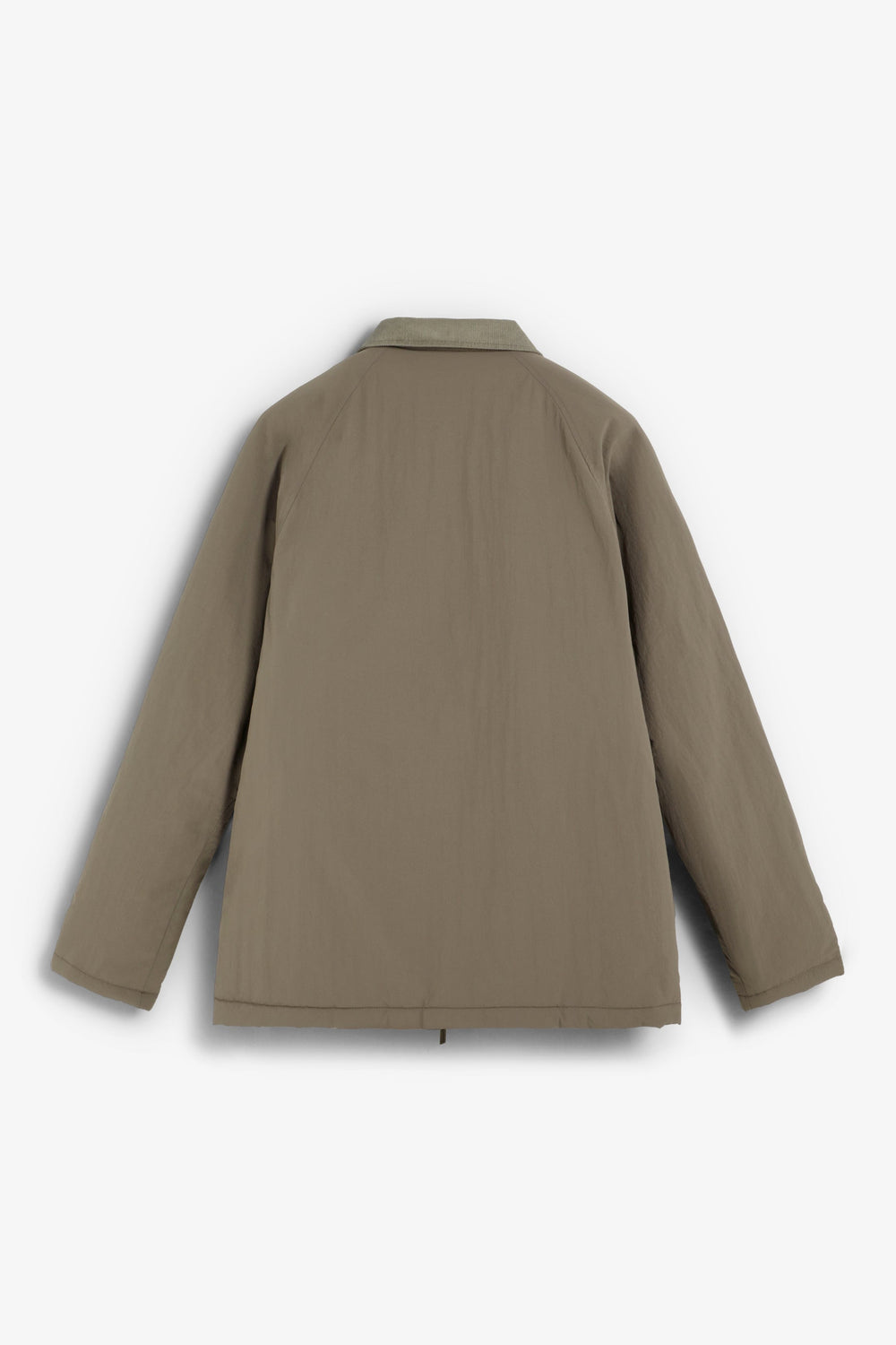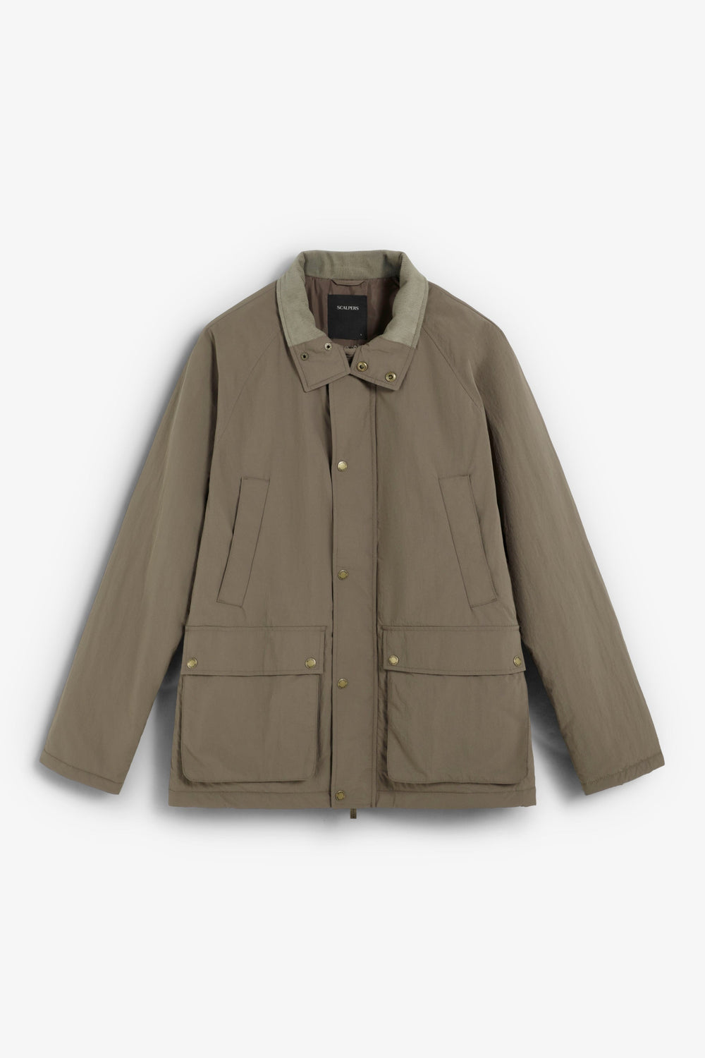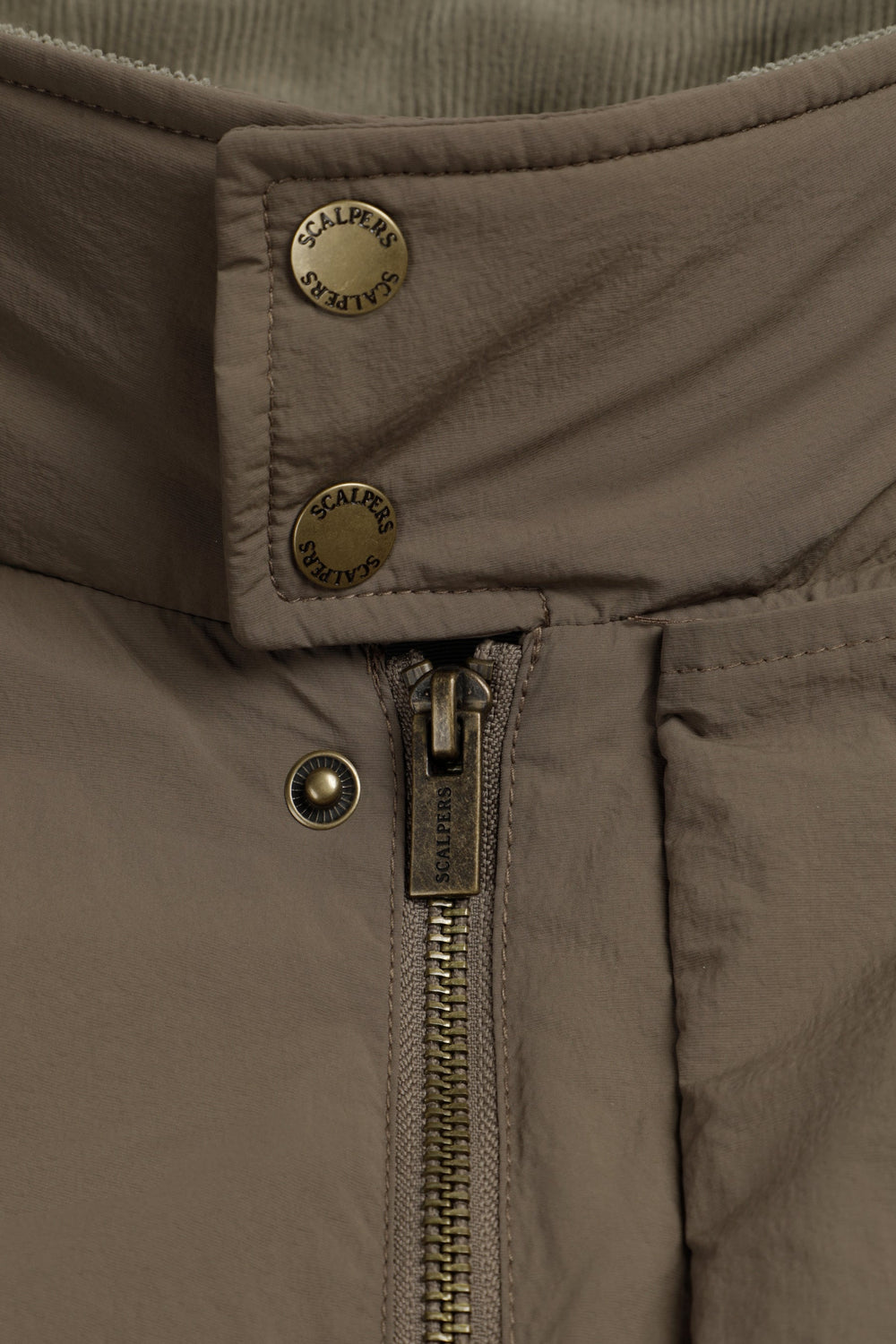 Cardigan técnico impermeável com mangas raglã. Quatro bolsos frontais. Fecho de correr e botões de pressão. Pormenor da etiqueta Scalpers na lateral e puxador Scalpers personalizado. Pormenor de bombazina no tom no interior da gola.